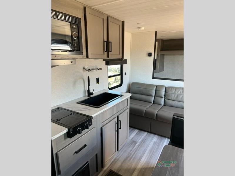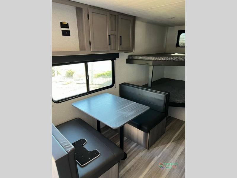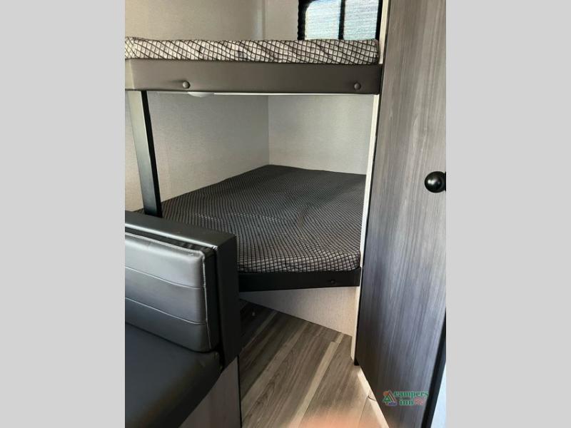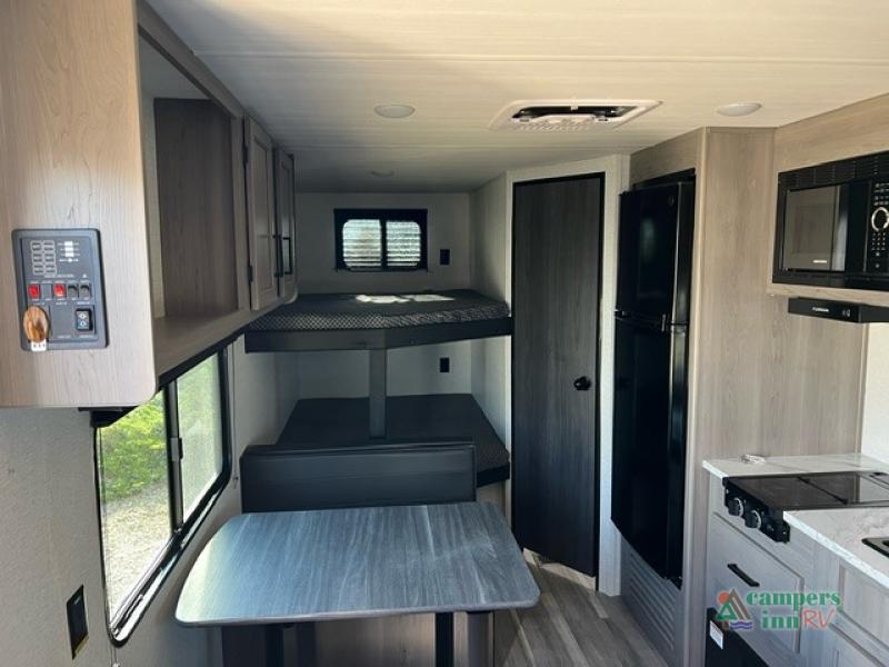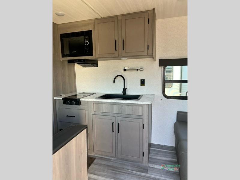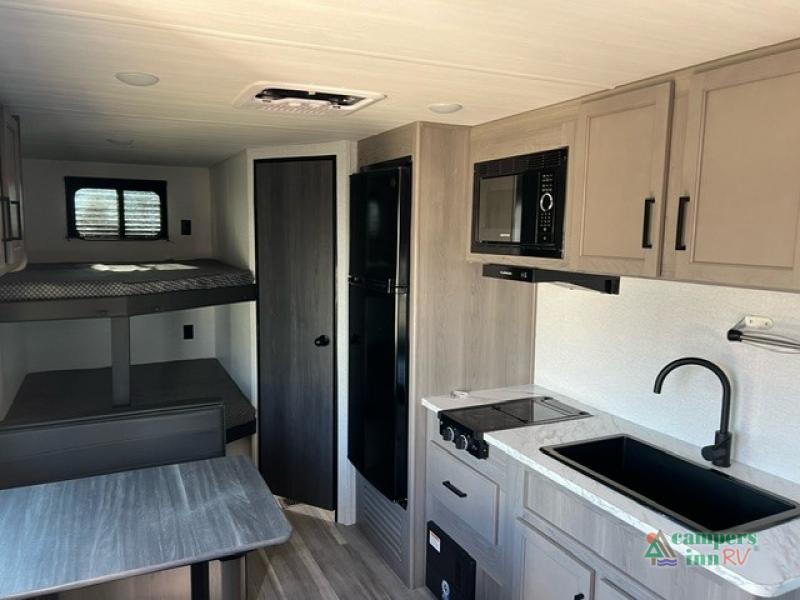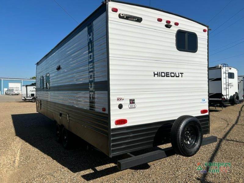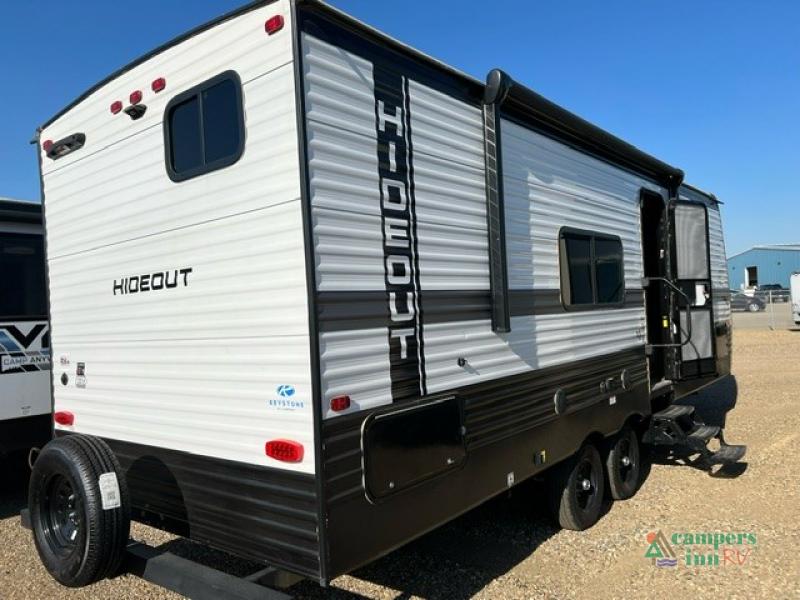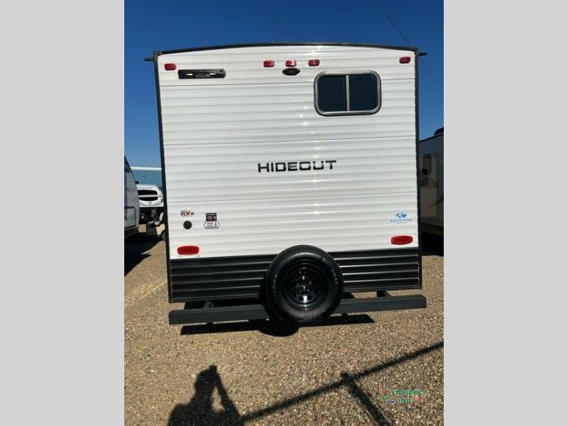 If you're looking for a travel trailer with a little more sleeping space, look no further than this Hideout Sport! There are double-size bunks with inside and outside storage, a walk-around queen bed in the front bedroom, plus a sofa and booth dinette for even more sleeping space. The kitchen comes with a two burner cooktop to cook meals on, a sink for clean up, and a 10 cu. ft. 12V refrigerator to store the milk and eggs. You will also find TV prep in this model if you enjoy movie nights while at the campground.