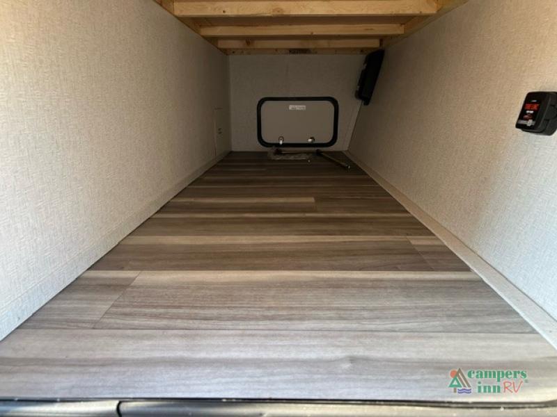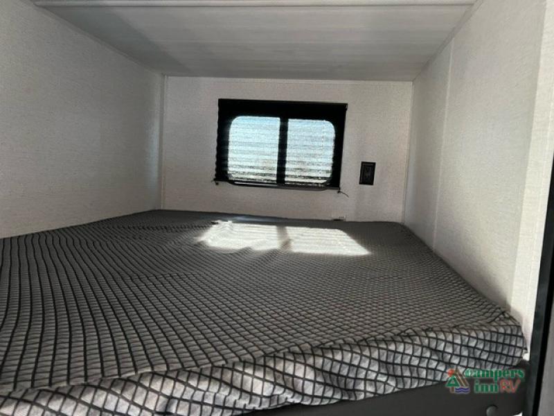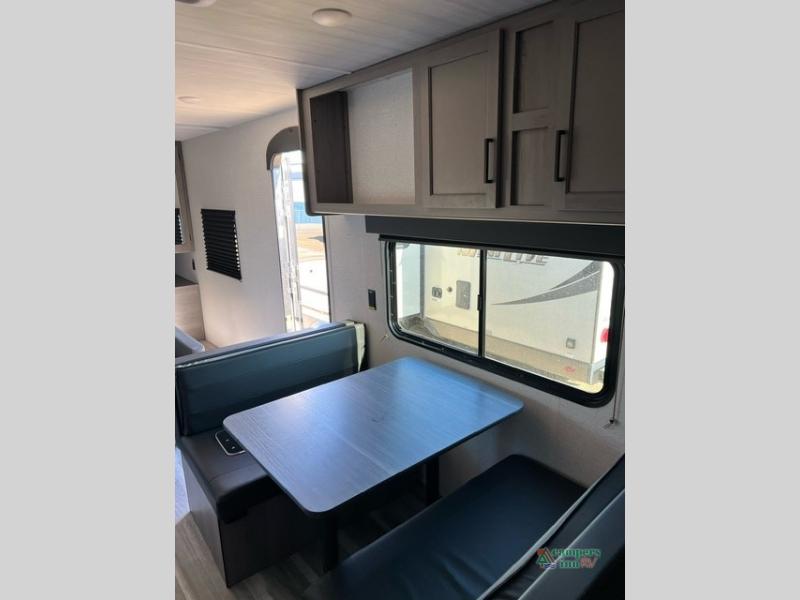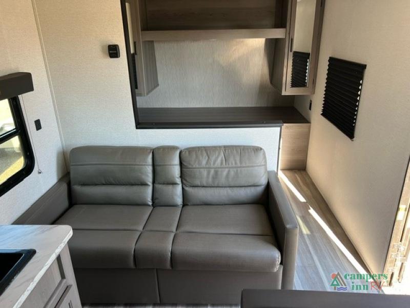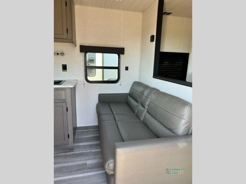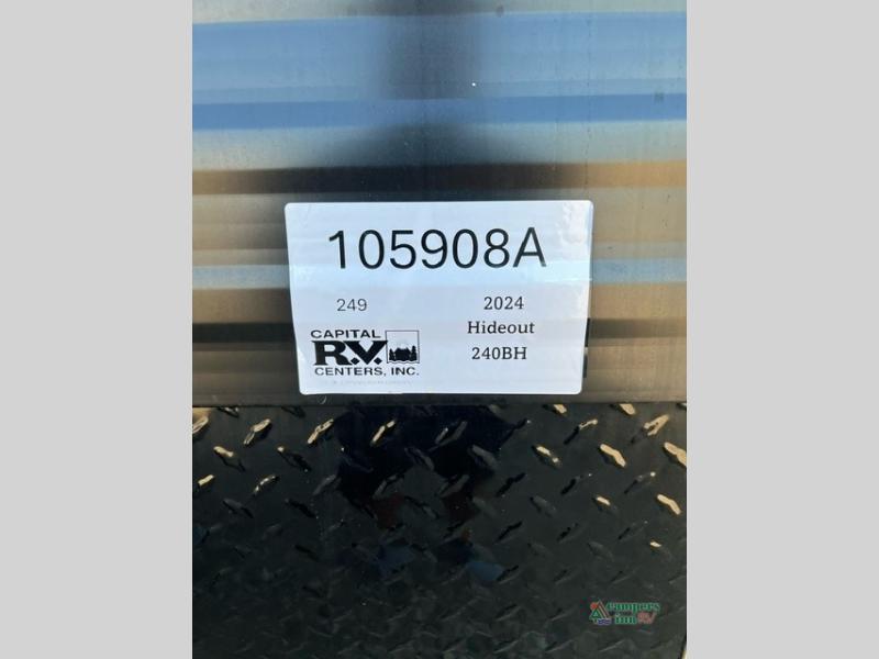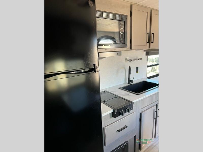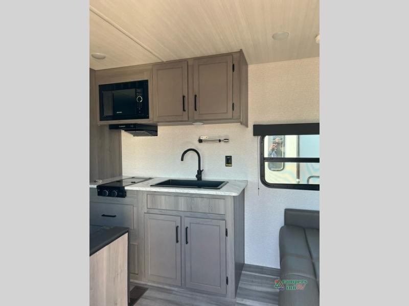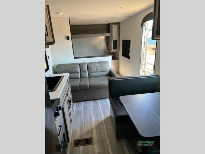 If you're looking for a travel trailer with a little more sleeping space, look no further than this Hideout Sport! There are double-size bunks with inside and outside storage, a walk-around queen bed in the front bedroom, plus a sofa and booth dinette for even more sleeping space. The kitchen comes with a two burner cooktop to cook meals on, a sink for clean up, and a 10 cu. ft. 12V refrigerator to store the milk and eggs. You will also find TV prep in this model if you enjoy movie nights while at the campground.