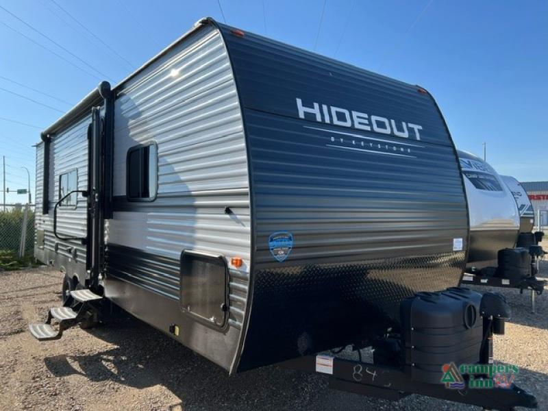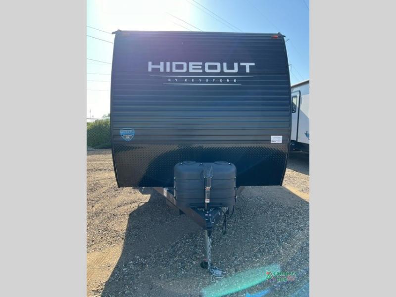With any Hideout Sport travel trailer by Keystone you will enjoy simplified camping solutions that won't break the bank! Each model is constructed with a durable aluminum exterior, tinted safety glass windows, a walkable roof, and an I-beam frame. There are power tongue jacks and electric stabilizer jacks that will make it easier than ever to hitch up and go, and you can add the optional spare tire kit in case you have any unfortunate flats on the way to the campground. An XL entry assist handle will also provide convenience, along with a power awning that will provide much wanted shade during the day. You will feel right at home in a Hideout Sport with its stylish decor, blackout night shades, and cozy queen bed with storage underneath!