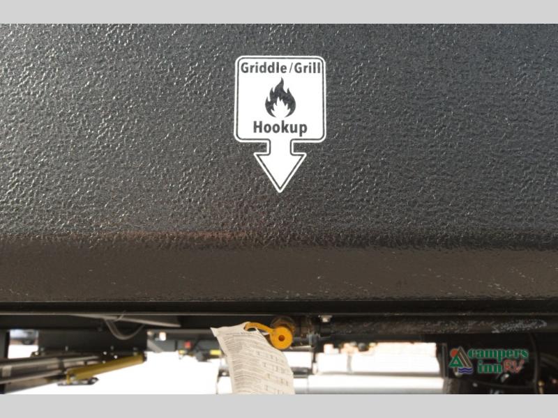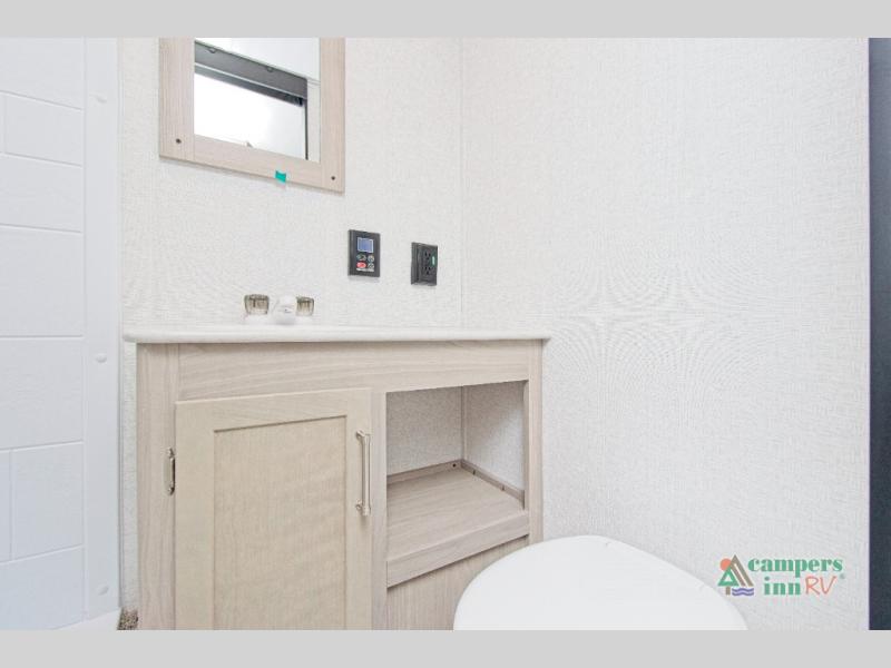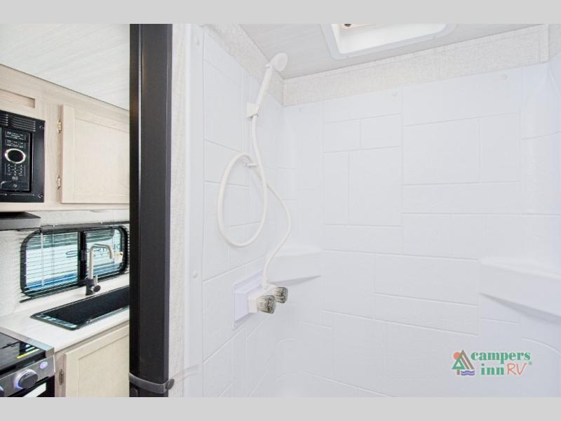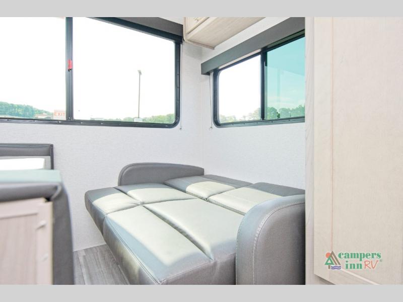 The booth dinette and sofa offer flexible seating and sleeping options, while the fully equipped kitchen includes a two-burner gas range, .9 cu. ft. microwave, and a 10 cu. ft. 12V refrigerator to keep your meals fresh and easy to prepare. The full bath ensures you stay clean and refreshed throughout your trip.