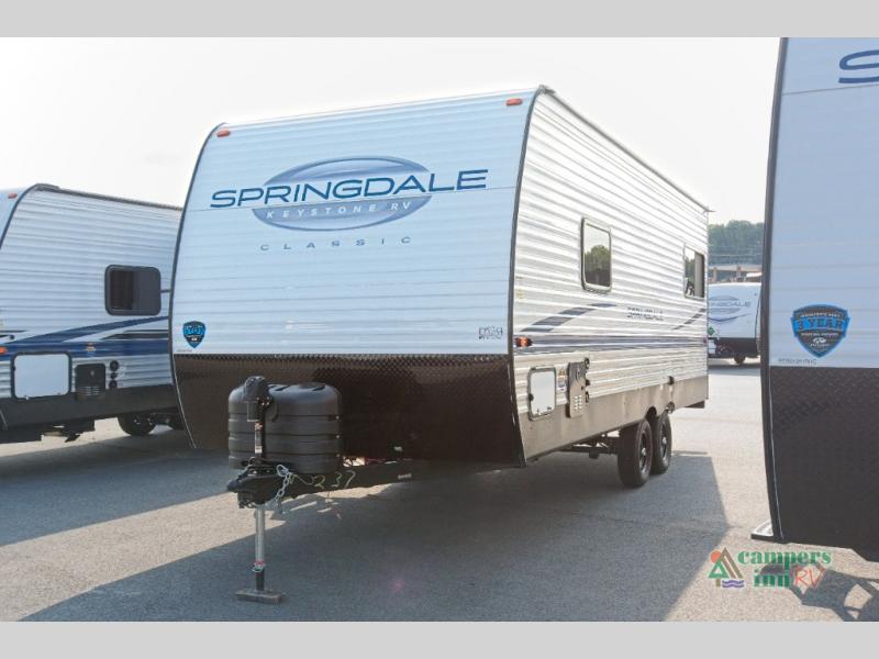 Keystone’s Springdale Classic series is built with durable materials like an aluminum exterior, walkable roof, and I-beam frame with stamped steel cross-members for added strength. Enjoy easy setup with electric stabilizer jacks, a power tongue jack, and a friction hinge entry door with an XL assist handle.