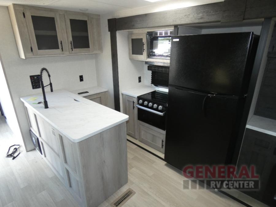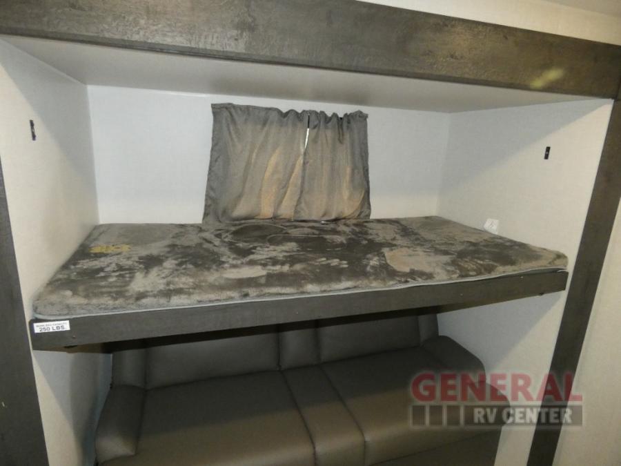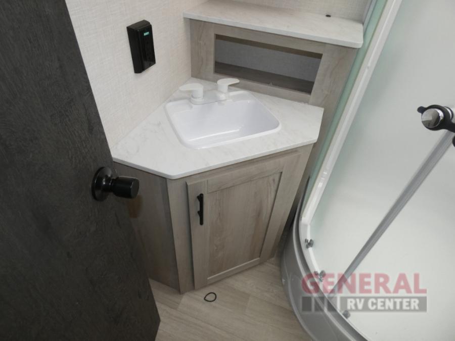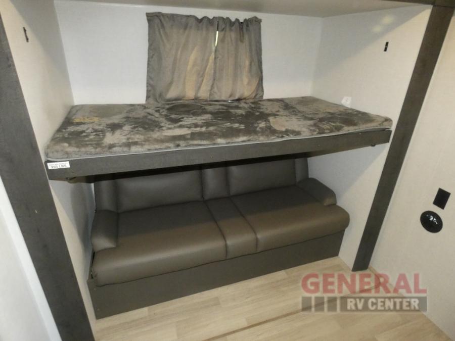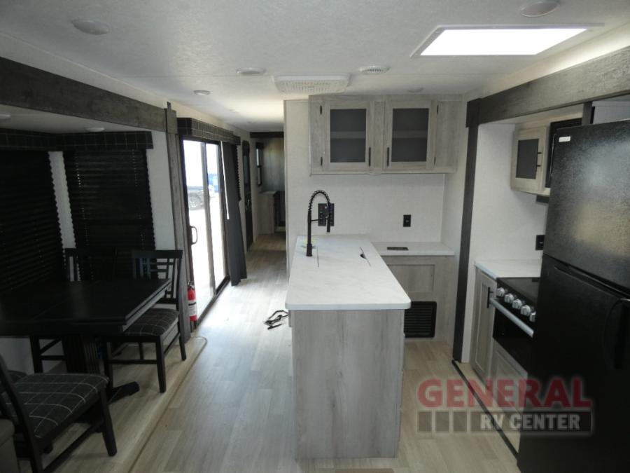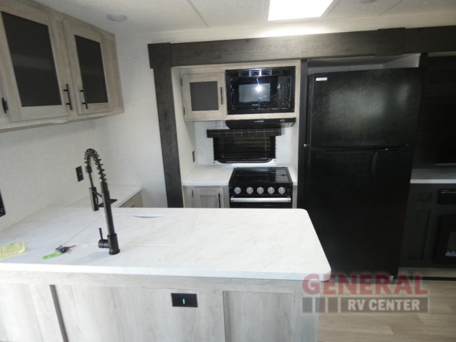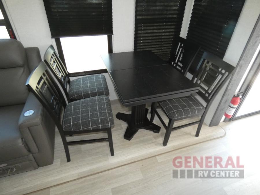 The whole gang will enjoy living in this destination trailer! You will have your own privacy with the rear private bedroom which has a king bed slide across from a dresser with an LED TV and a wardrobe. Everyone can freshen up in the full bathroom with a radius shower and keep their bellies full with a three burner cooktop. The table and chairs offer a comfortable place to enjoy your meals and play card games.