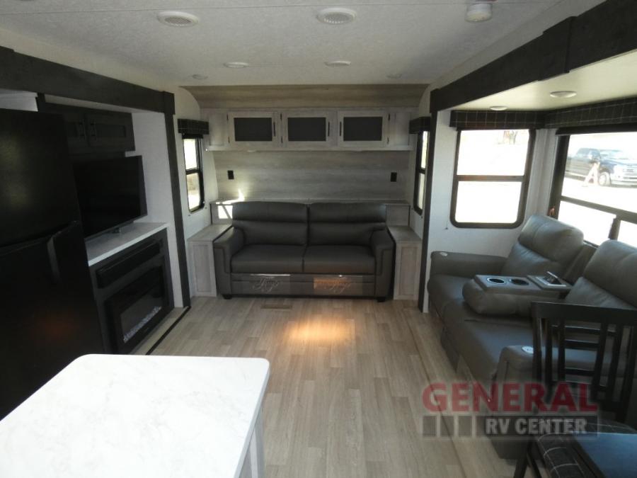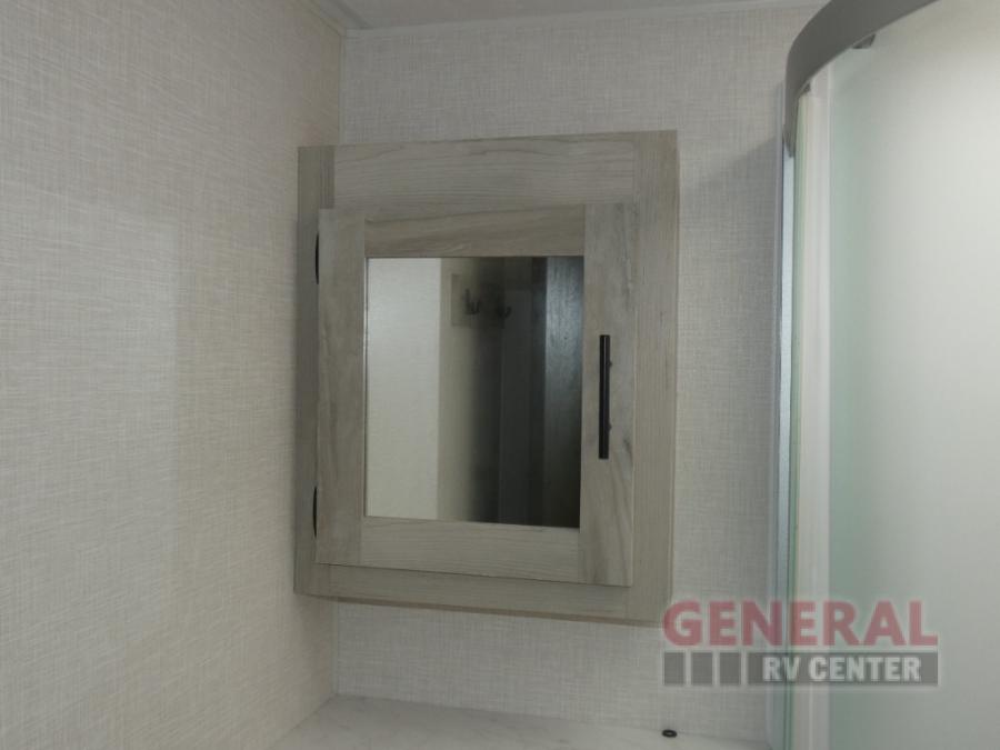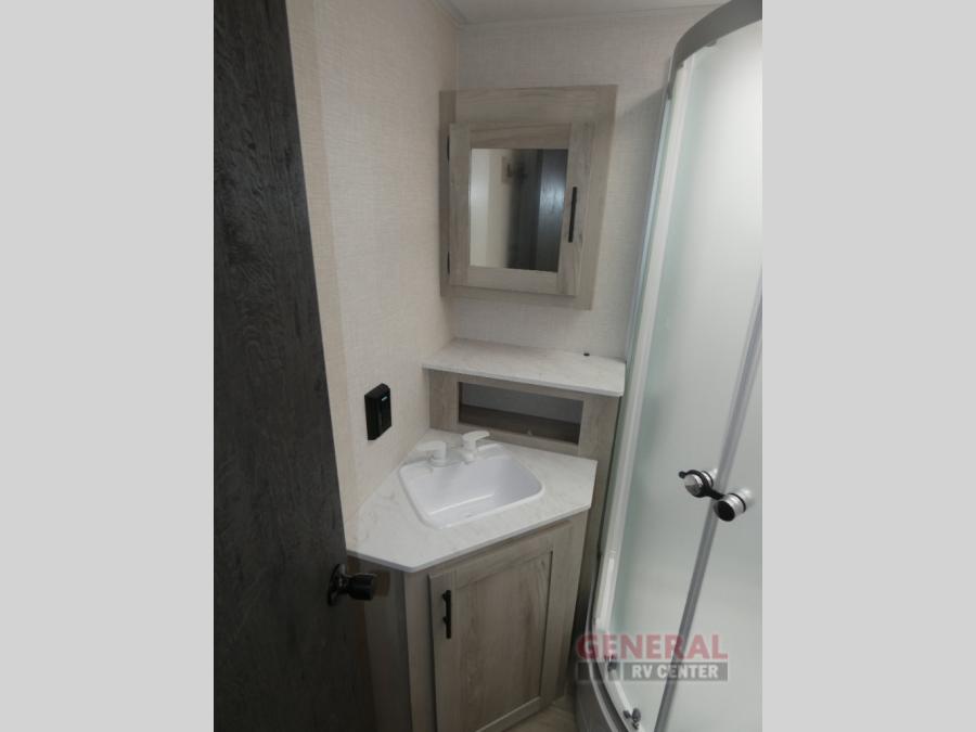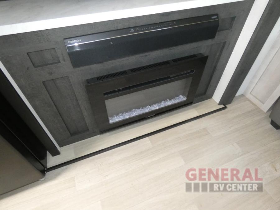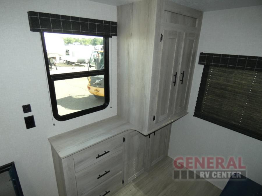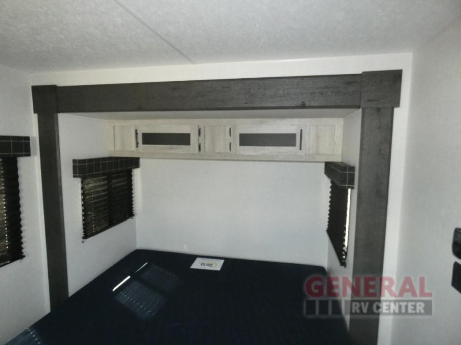 The whole gang will enjoy living in this destination trailer! You will have your own privacy with the rear private bedroom which has a king bed slide across from a dresser with an LED TV and a wardrobe. Everyone can freshen up in the full bathroom with a radius shower and keep their bellies full with a three burner cooktop. The table and chairs offer a comfortable place to enjoy your meals and play card games.