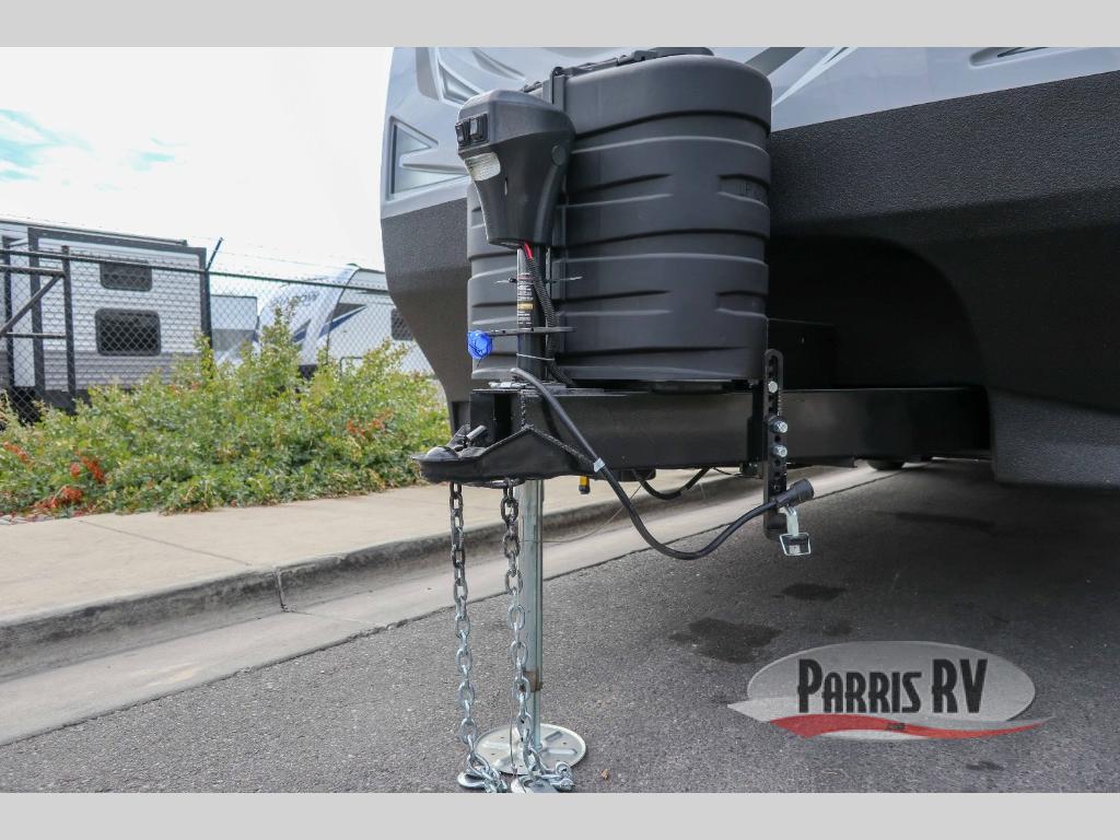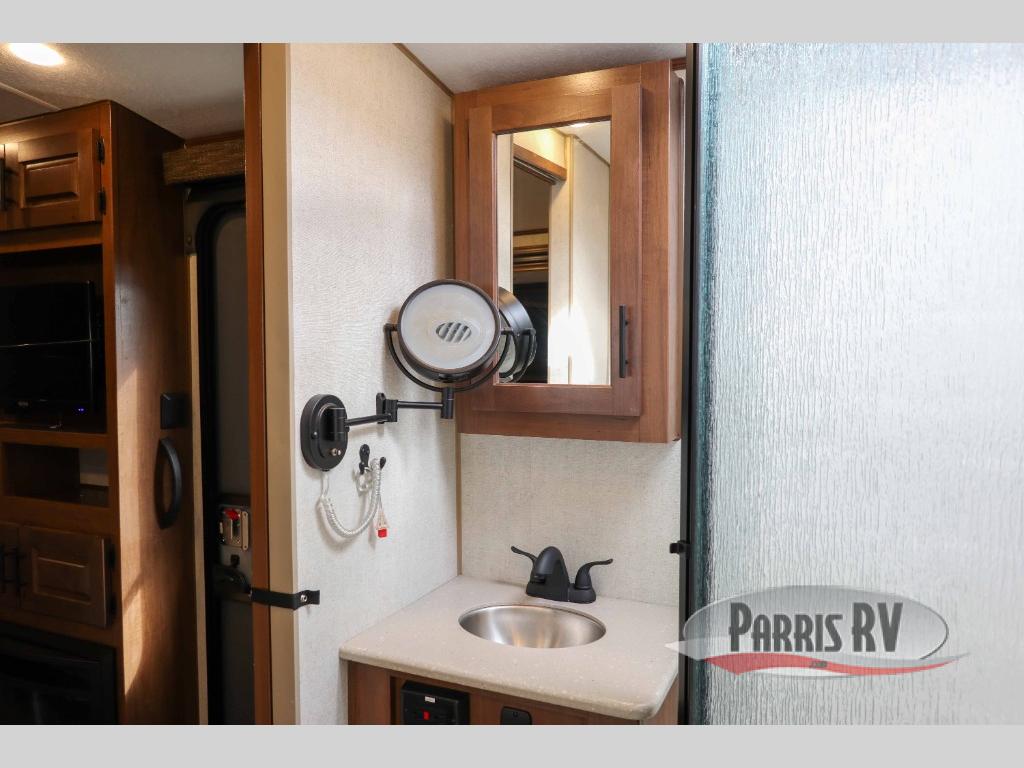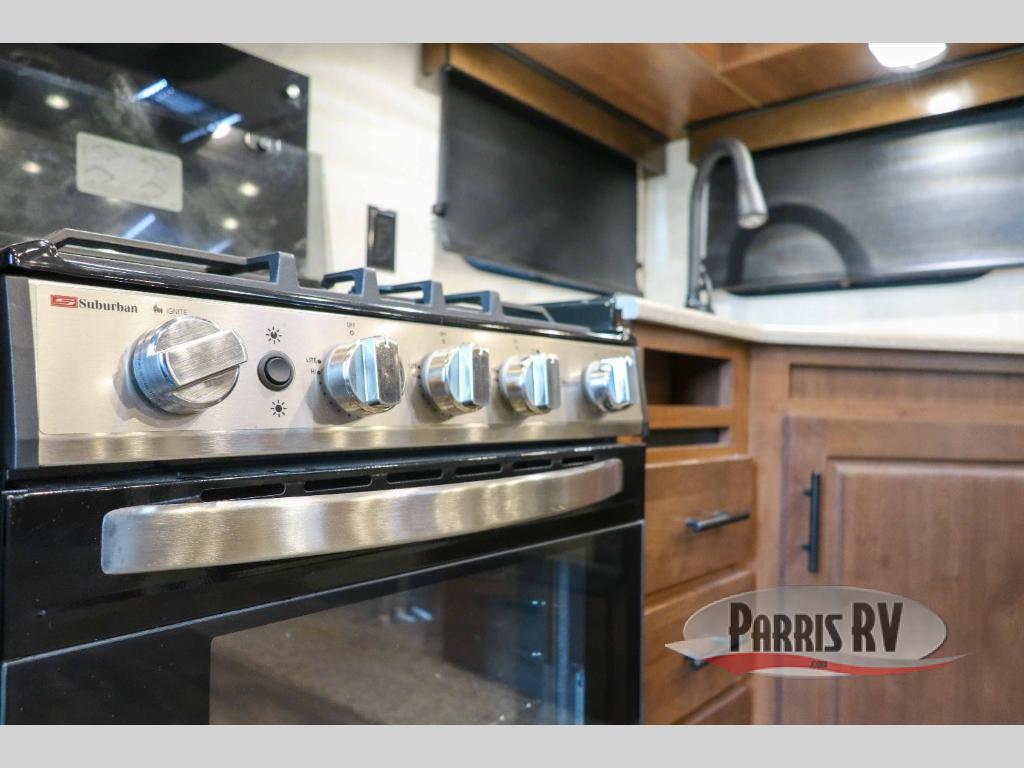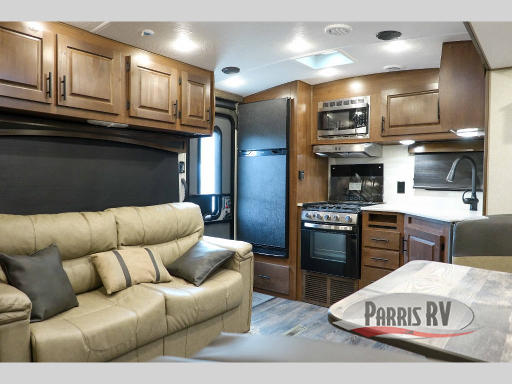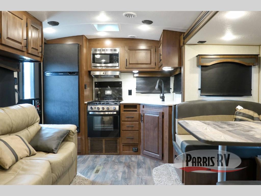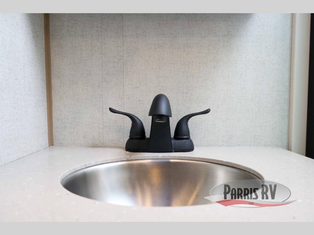 This rear kitchen travel trailer is made spacious thanks to the mountain dinette slide out in the main living area and the queen bed slide out in the front bedroom. You will also find a bench hamper and front wardrobe in the bedroom, along with your own exterior entry door. A sleeper sofa provides more sleeping space in the middle living room and the 40" TV will let you enjoy movie nights. And don't overlook the rear kitchen with plenty of counter space, a farm sink, and a sunken range with a glass front.