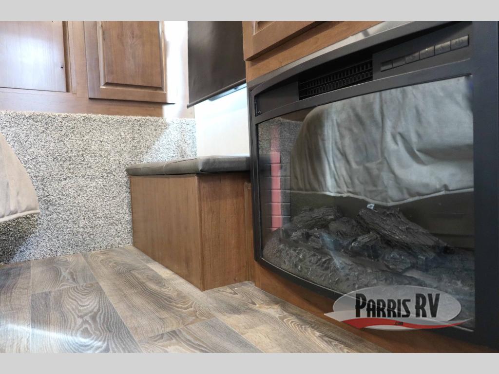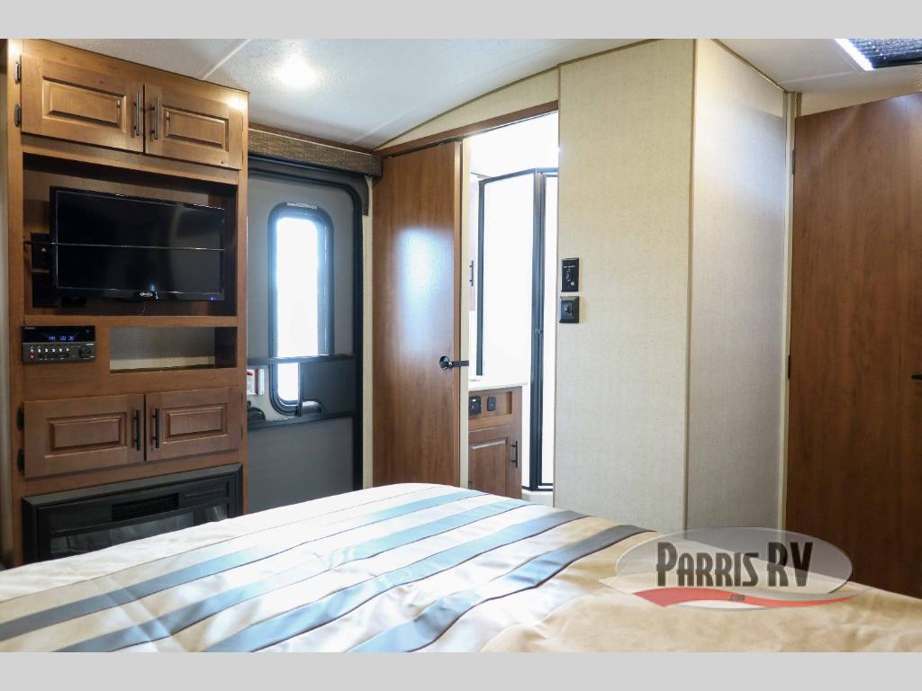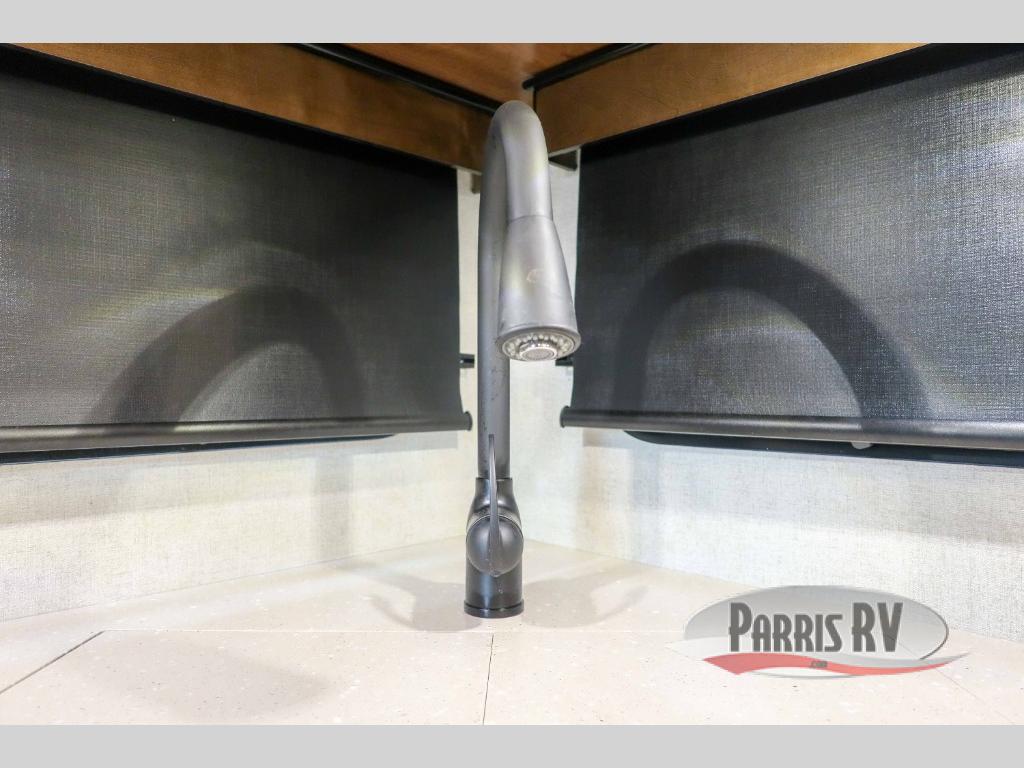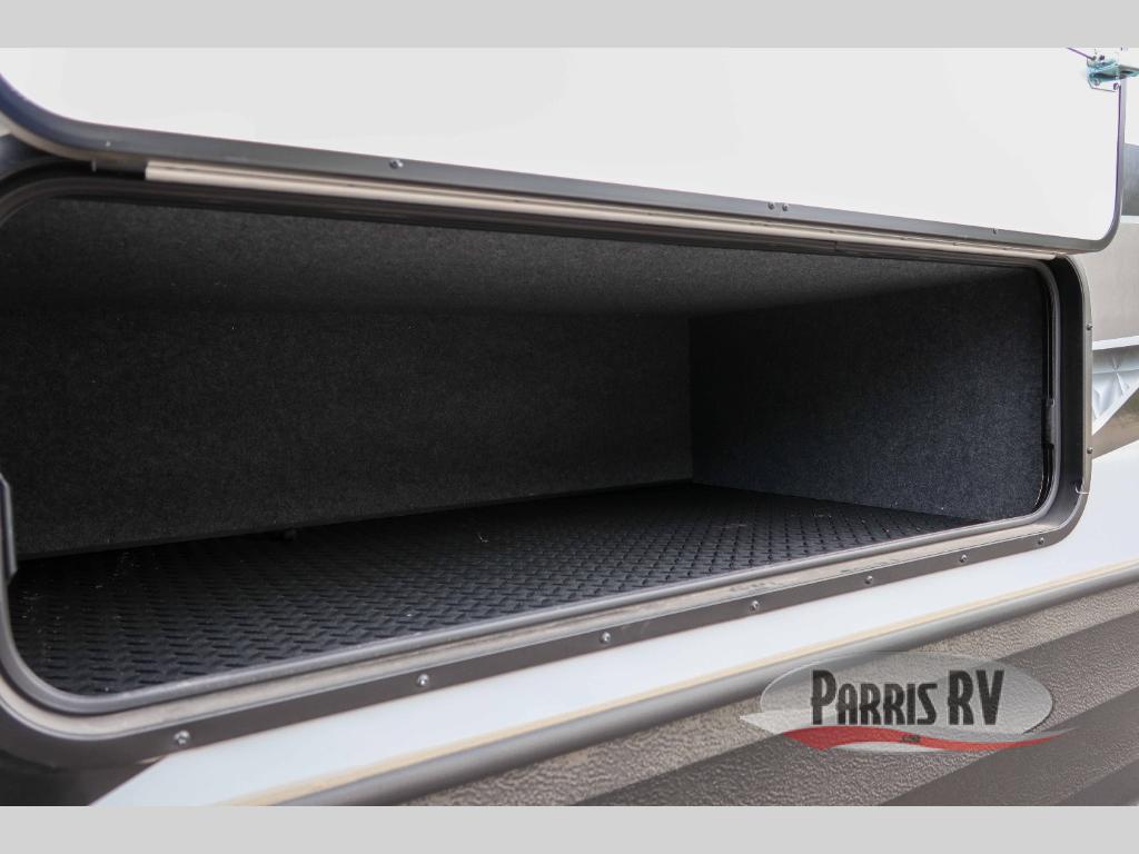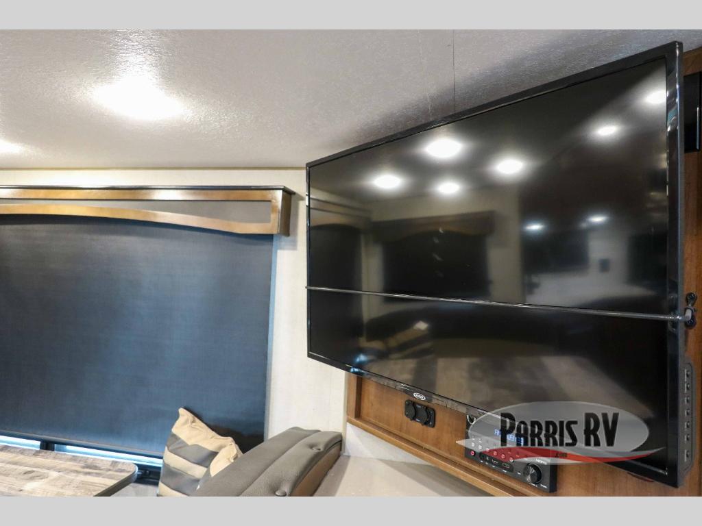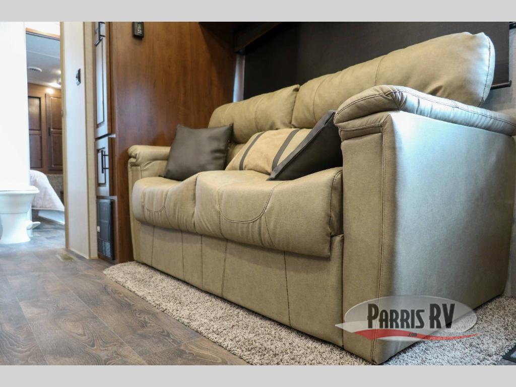 This rear kitchen travel trailer is made spacious thanks to the mountain dinette slide out in the main living area and the queen bed slide out in the front bedroom. You will also find a bench hamper and front wardrobe in the bedroom, along with your own exterior entry door. A sleeper sofa provides more sleeping space in the middle living room and the 40" TV will let you enjoy movie nights. And don't overlook the rear kitchen with plenty of counter space, a farm sink, and a sunken range with a glass front.