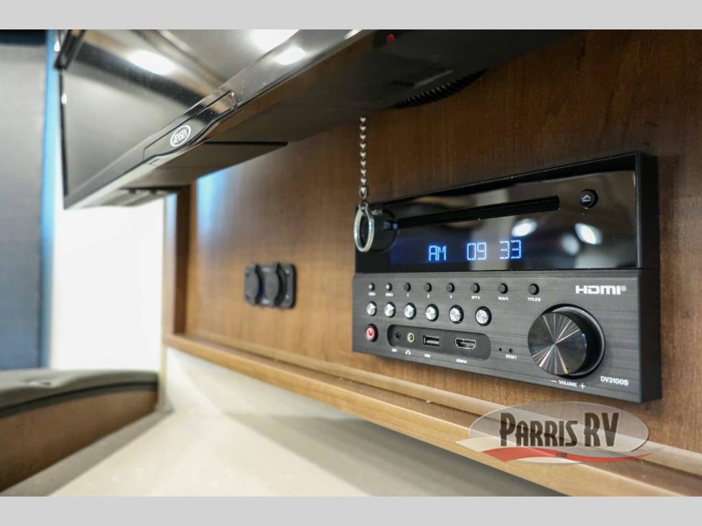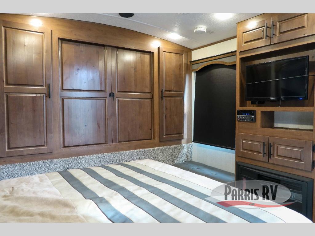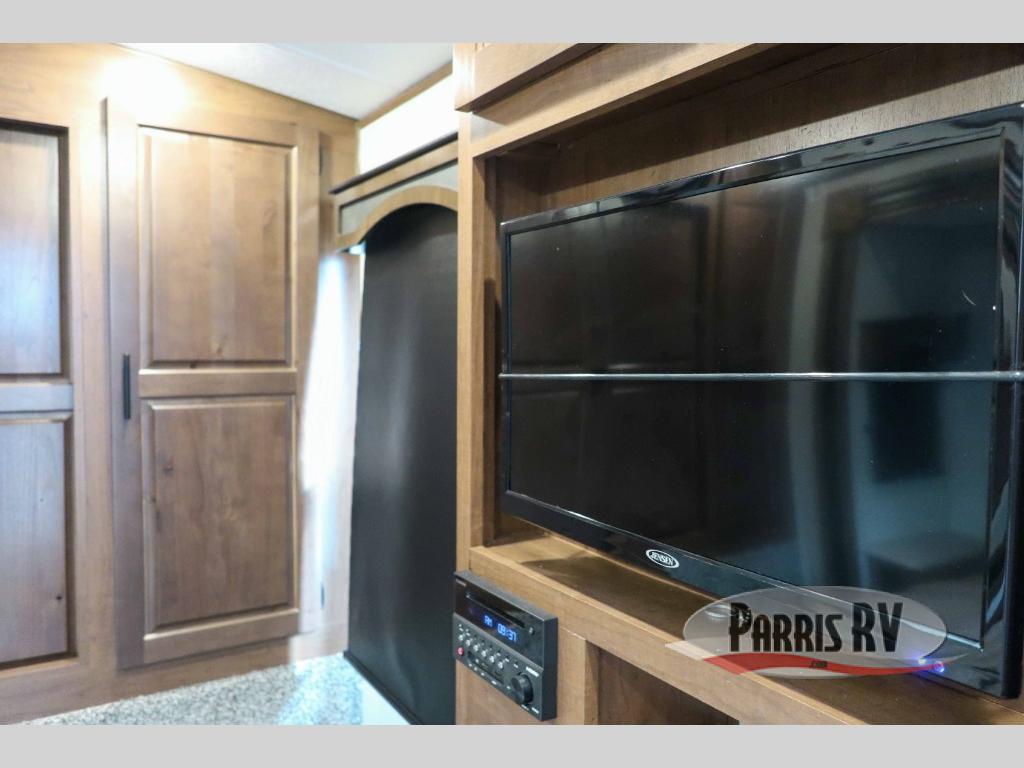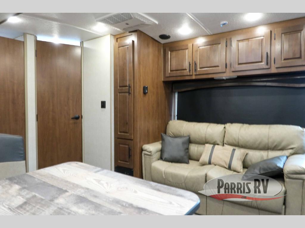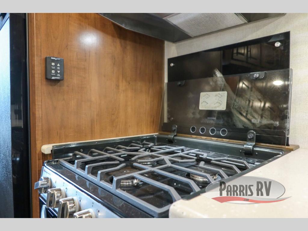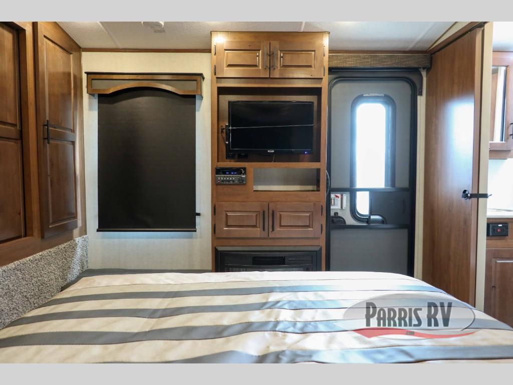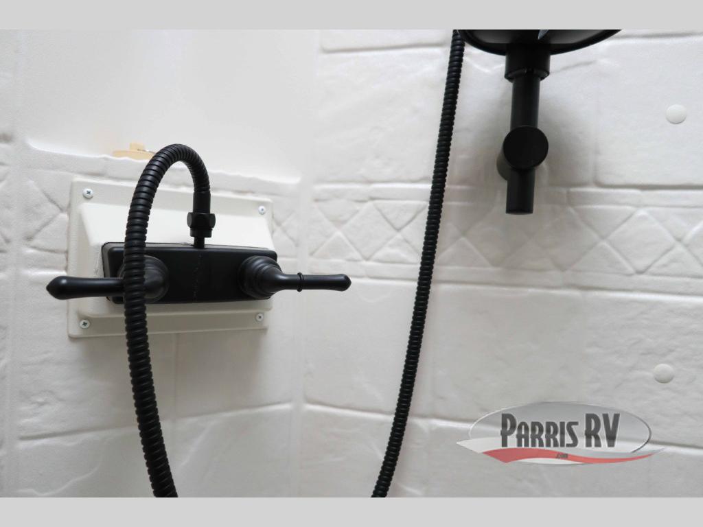 This rear kitchen travel trailer is made spacious thanks to the mountain dinette slide out in the main living area and the queen bed slide out in the front bedroom. You will also find a bench hamper and front wardrobe in the bedroom, along with your own exterior entry door. A sleeper sofa provides more sleeping space in the middle living room and the 40" TV will let you enjoy movie nights. And don't overlook the rear kitchen with plenty of counter space, a farm sink, and a sunken range with a glass front.