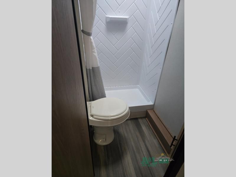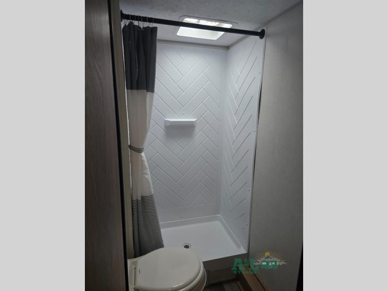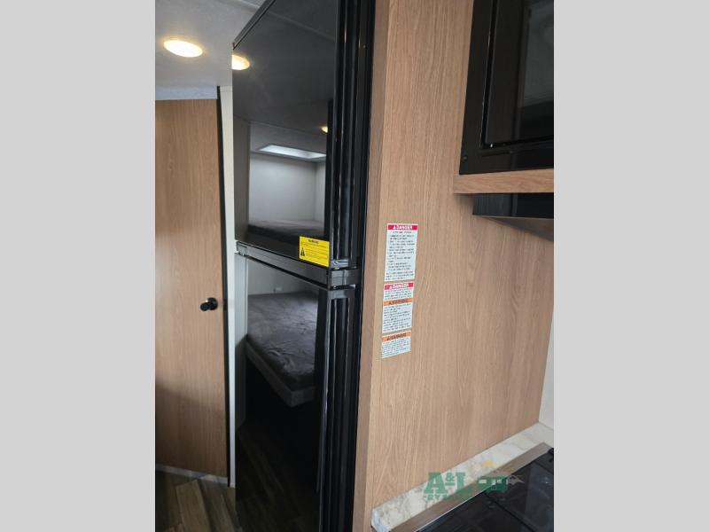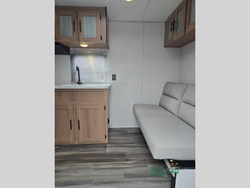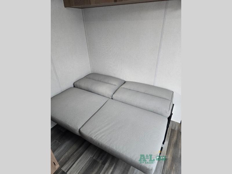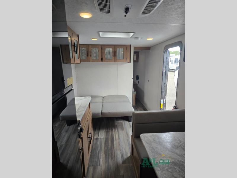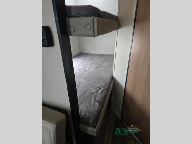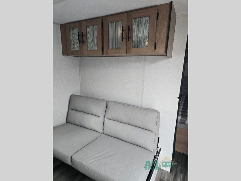 The whole family will love camping in this travel trailer! The kiddos can sleep on the set of bunk beds and you can sleep on the queen bed inside the front private bedroom. They can even invite a friend or two to tag along and sleep on the sofa or booth dinette when you aren't using it to enjoy a meal prepared with the three burner cooktop. Everyone can freshen up in the rear corner bathroom with the shower that has a skylight above for added natural lighting as you get ready, plus there is a kitchen skylight too. Store all of your outdoor gear inside the front exterior pass-through storage.