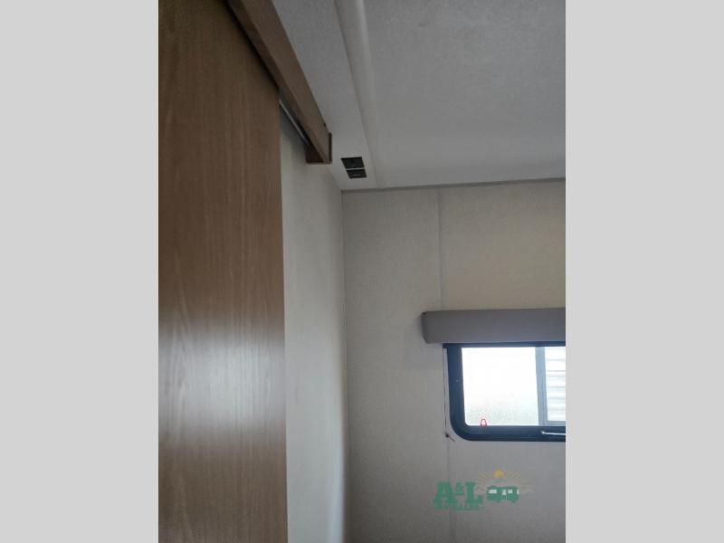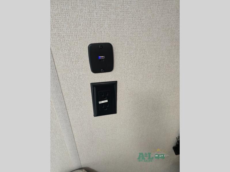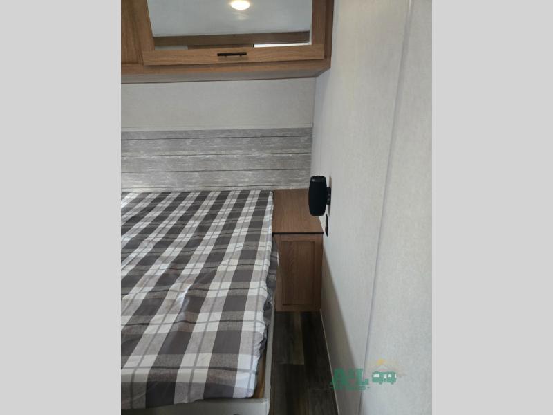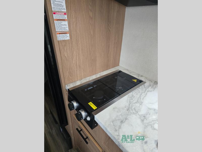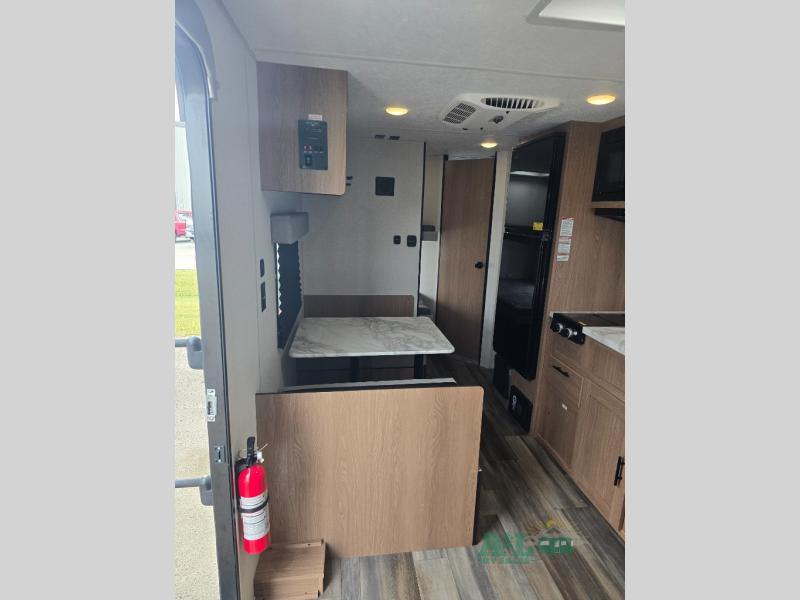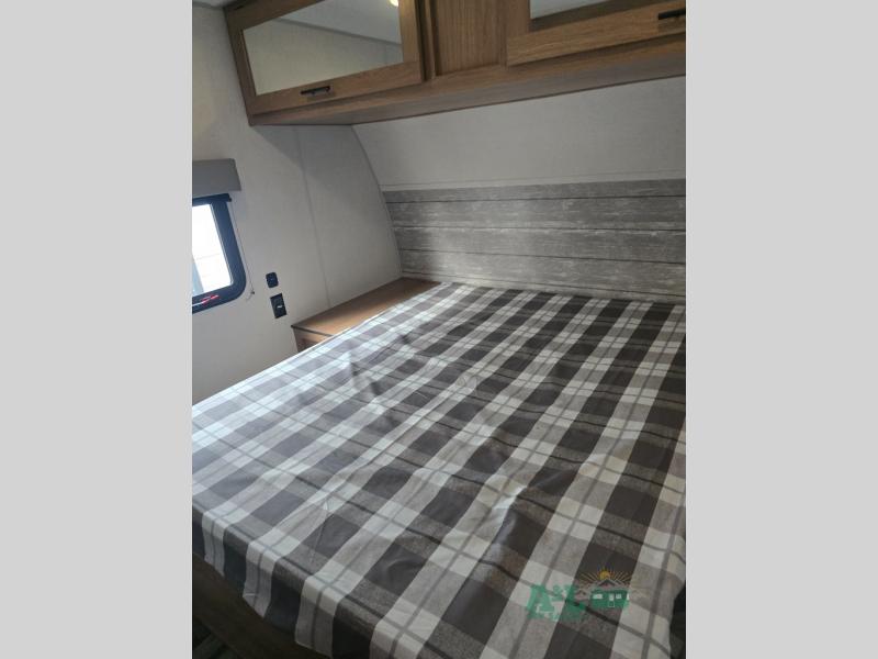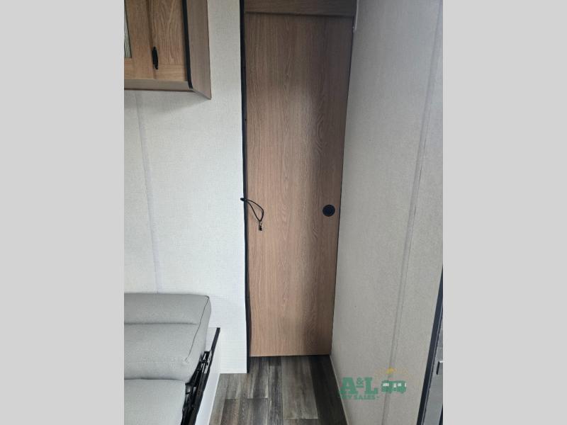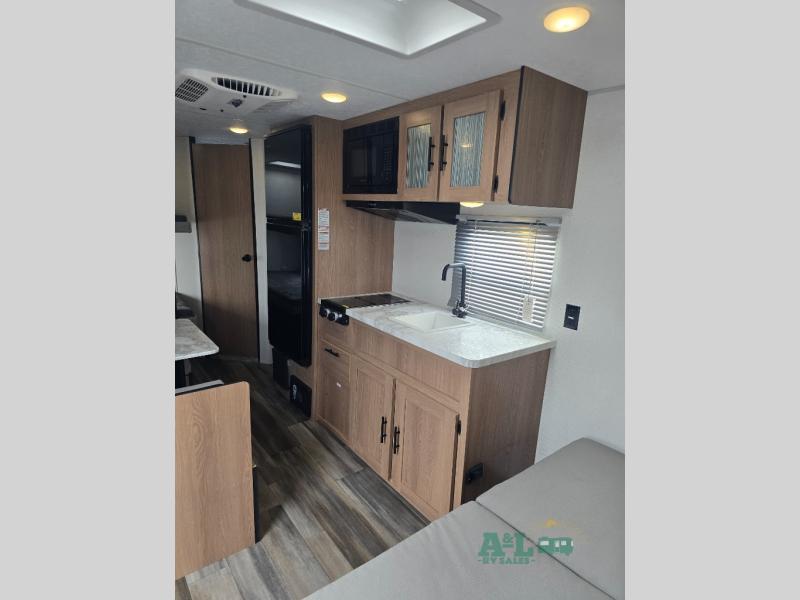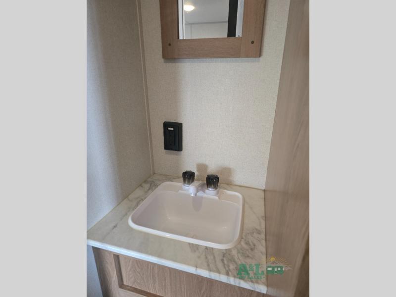 The whole family will love camping in this travel trailer! The kiddos can sleep on the set of bunk beds and you can sleep on the queen bed inside the front private bedroom. They can even invite a friend or two to tag along and sleep on the sofa or booth dinette when you aren't using it to enjoy a meal prepared with the three burner cooktop. Everyone can freshen up in the rear corner bathroom with the shower that has a skylight above for added natural lighting as you get ready, plus there is a kitchen skylight too. Store all of your outdoor gear inside the front exterior pass-through storage.