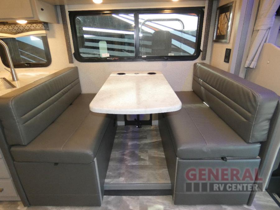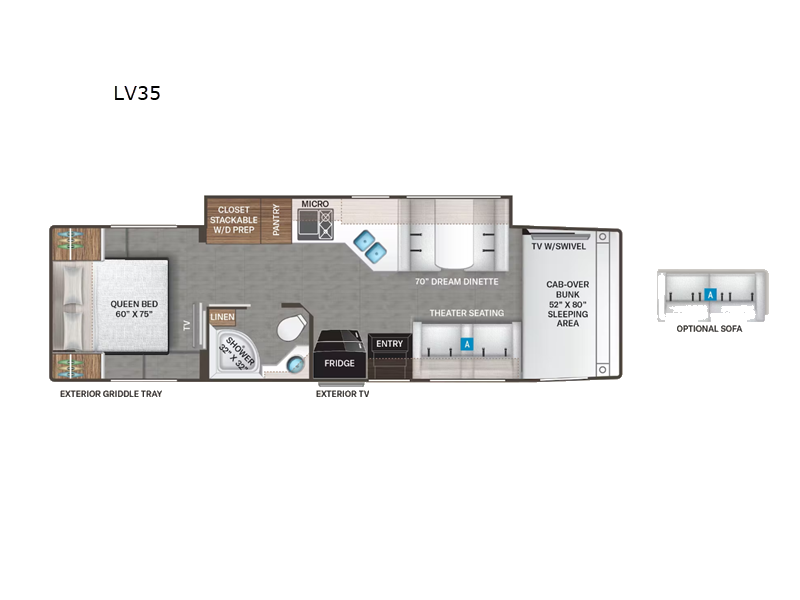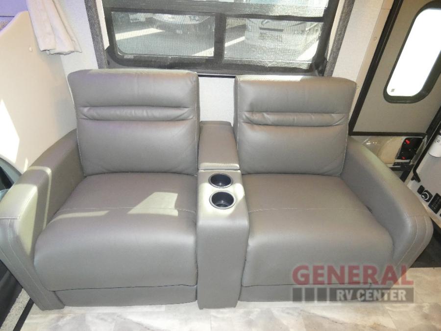 Full-time RVer's or weekend warriors will love this coach that can sleep four to five people each night. There is a large slide out in the main living area to provide your crew with plenty of space. The chef of your group can prepare dinner on the two burner gas range or in the convection microwave, and you'll appreciate having a large pantry to store non-perishables. After dinner is cleaned up, you can play games at the Dream Dinette, or relax on the theater seating that has a great view of the 39" TV in the cab-over bunk. If you're needing more sleeping space, just add the optional sofa in place of the theater seating. A full bath on board lets you clean up each day and the queen bed in the rear bedroom will provide a great night's rest!