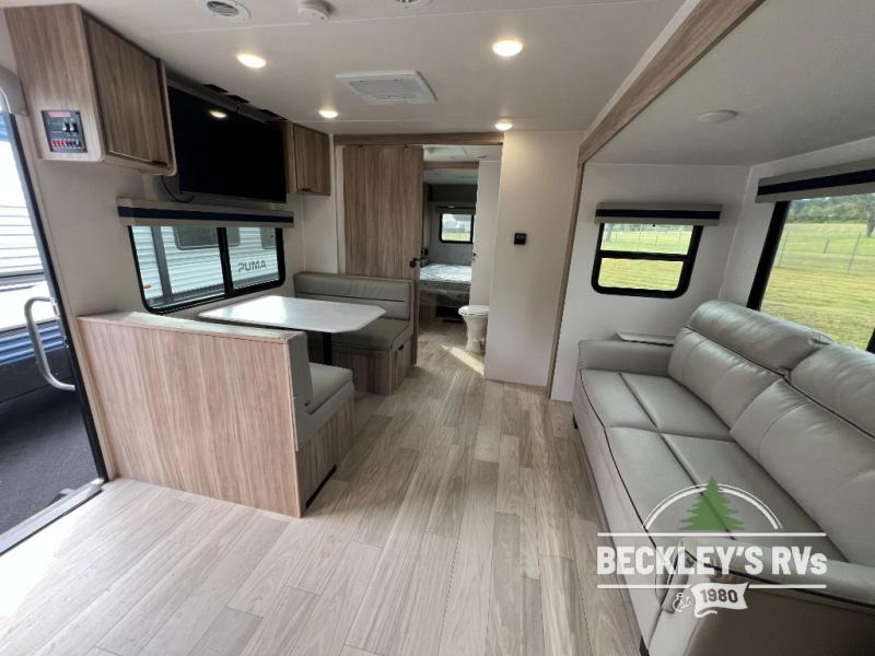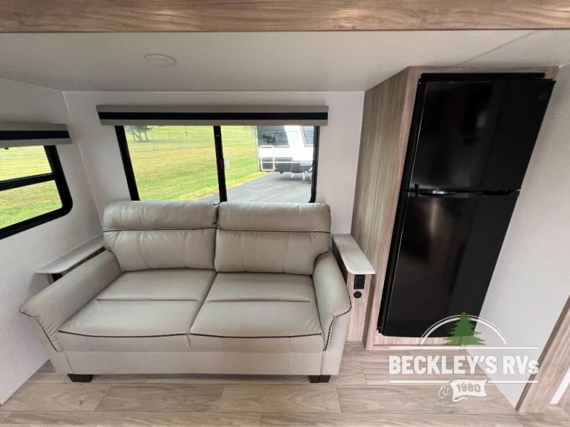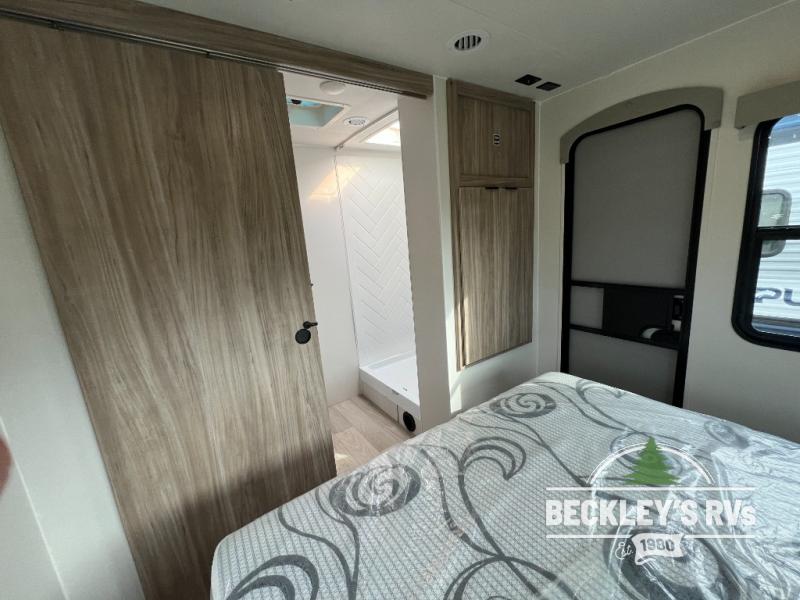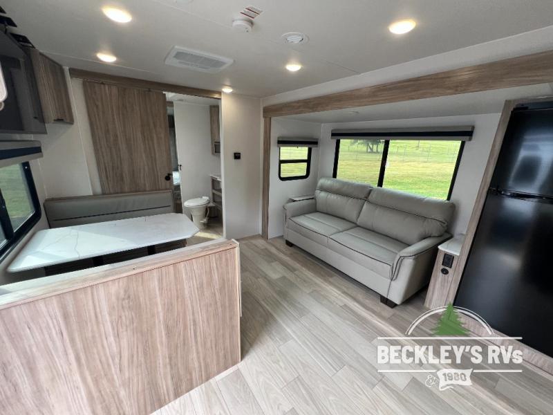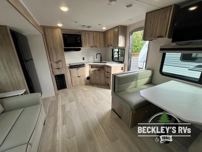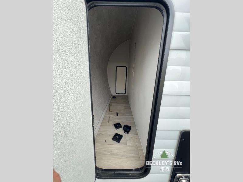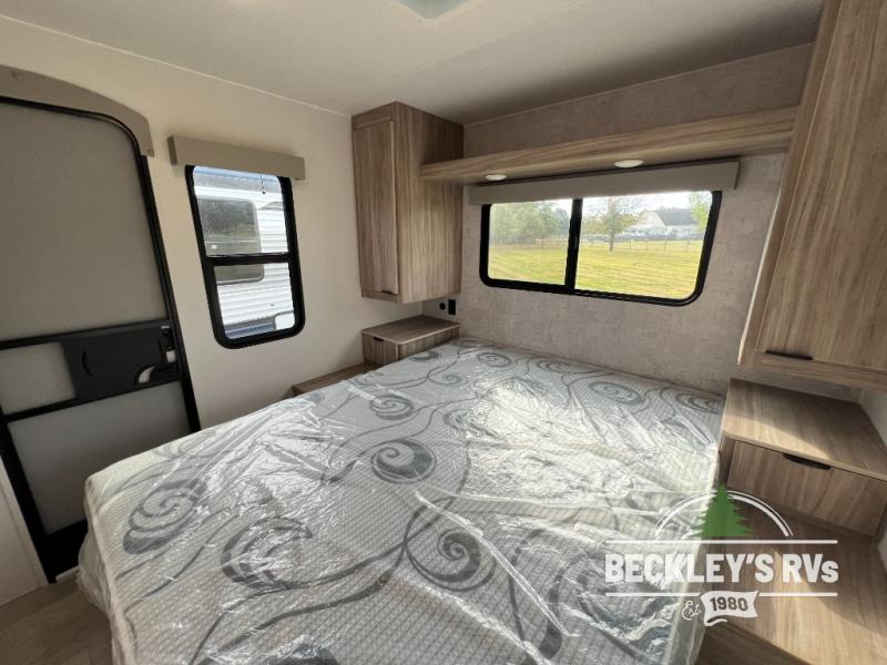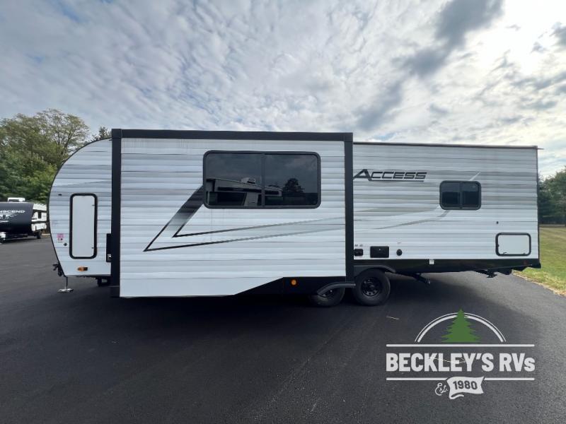 This single slide Access travel trailer features a front kitchen layout, a large roadside slide, and a private bedroom beyond a walk-through full bath. It also features both front and rear pass-through storage, as well as dual entry doors! You will find the main combined living area and kitchen open and spacious thanks to the slide. Cook your family their favorite meals with the appliances inside, dine at the 72" x 41" dinette where you can add an optional TV above to enjoy from the theater seating opposite. A convenient walk-through bath is spacious enough for two to get ready at once since it is the full width of the trailer. Next, head through space saving sliding doors to the rear private bedroom with its own access to the outside through the second entry. Here a queen bed awaits for a great nights rest. This bedroom offers plenty of storage in bedside wardrobes, a closet just off the foot of the bed, in under bed storage for extra blankets and larger items, plus so much more!
