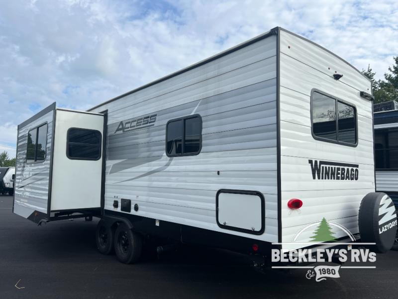 With any Winnebago Access travel trailer you will find thoughtful, clean, and contemporary designs filled with premium features that all have come to expect on any Winnebago towable. The powered stabilizer jacks make setting up camp easy with just the touch of a single button. You will appreciate the stylish exterior front profile and thicker sidewall metal for greater aerodynamics plus strength and durability. With a fully enclosed underbelly you can easily extend your camping season into the colder months, and the 12 volt tank pad heaters will keep you from having frozen pipes. On the inside, a porcelain toilet, larger skylights for more natural lighting, abundant storage, and spacious living areas making every camping trip more enjoyable. And, the 200 watt solar power reduces the need for shore power which makes it easy to go off-grid. Make your choice today and Access your next adventure!