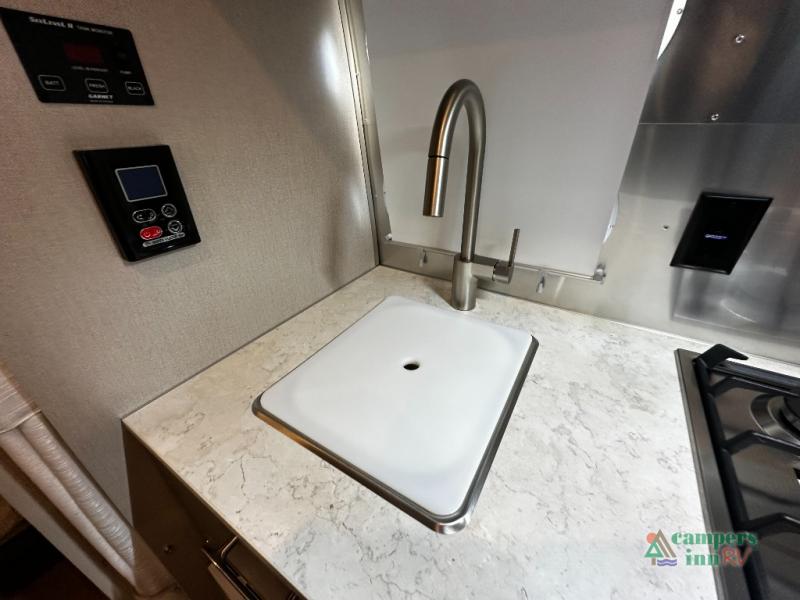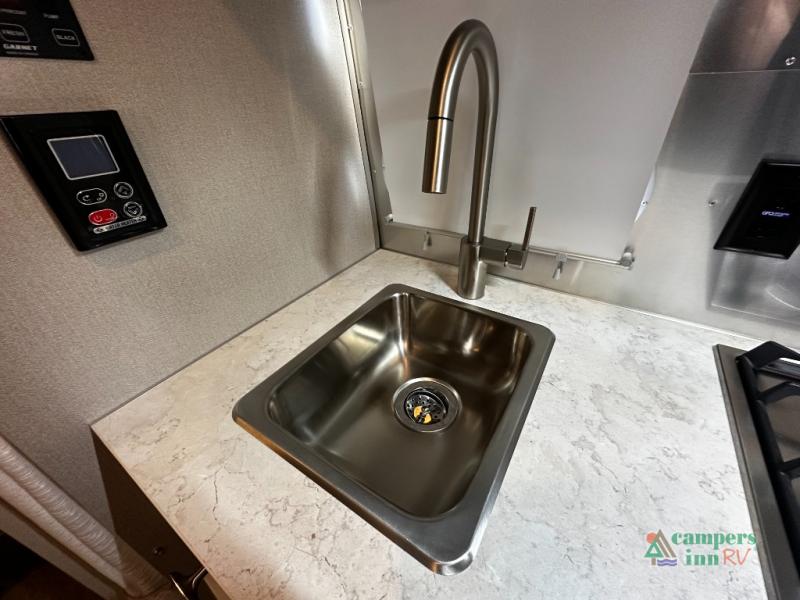 Though lightweight and easy to tow, the Caravel 16RB doesn’t compromise on comfort. The dedicated rear bed offers a restful retreat, while the convertible dinette adds flexible living and sleeping space. The kitchen comes complete with a microwave, two-burner cooktop, stainless sink, and under-counter storage, letting you prepare meals with ease. Whether you’re parked by the beach or in the mountains, the efficient climate control system, quiet insulation, and premium materials keep you comfortable year-round.
