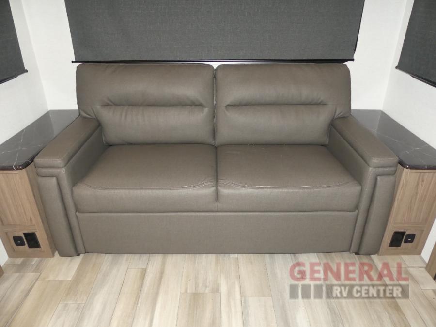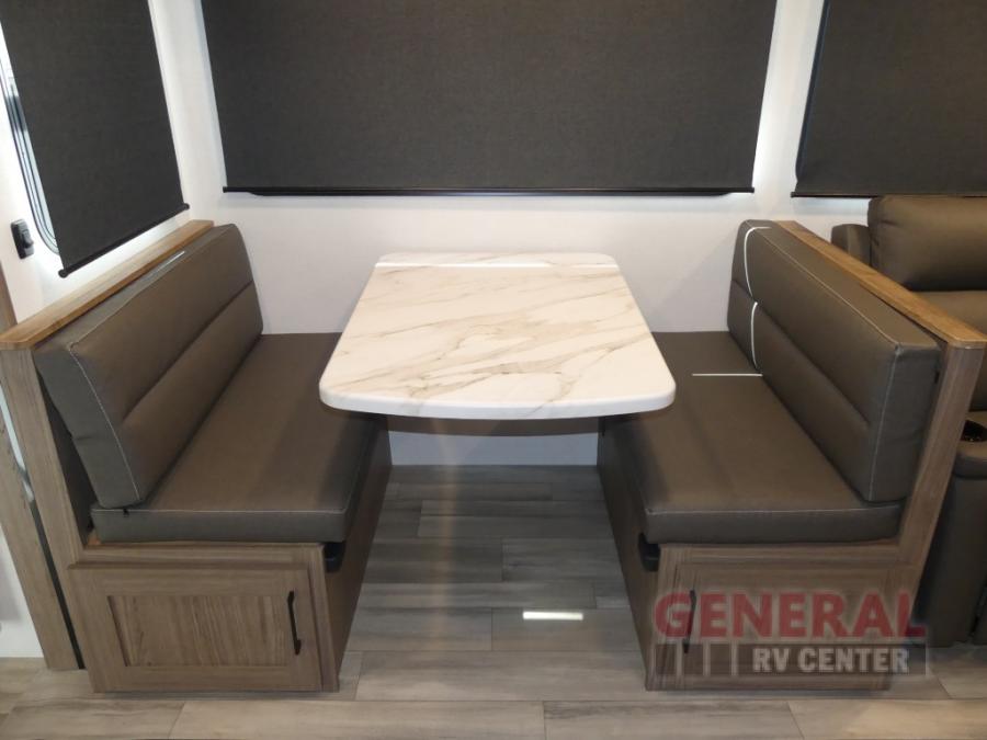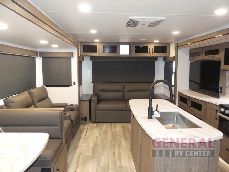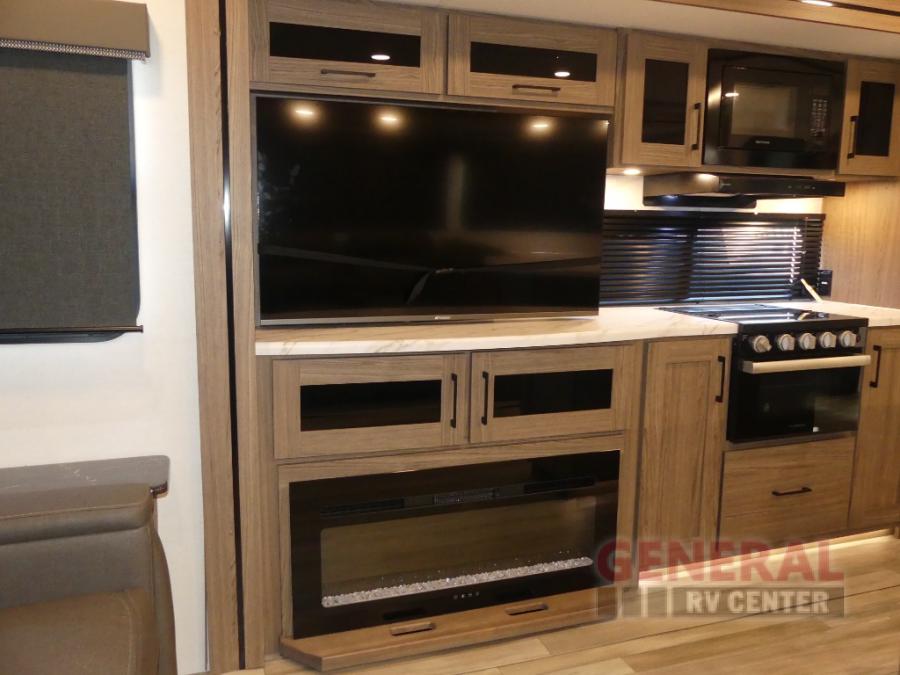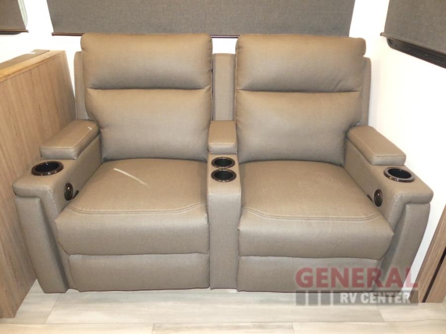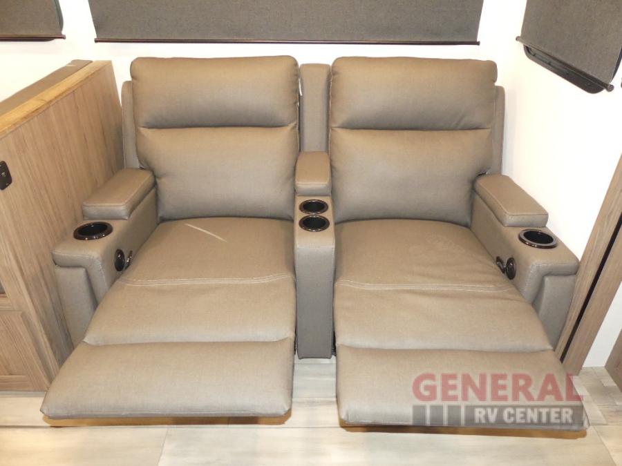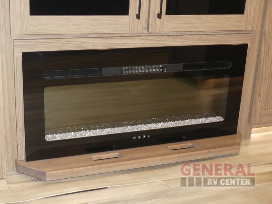 You will feel right at home camping in this travel trailer! The rear living area has a rear sofa and a set of theater seating conveniently across from the entertainment center with a 50" class HDTV above a pull-out fireplace storage for a cozy evening indoors. Prepare your best home cooked meals with the three burner cooktop, kitchen island which even has a tip-out trash can, and 10 cu. ft. 12V refrigerator. Enjoy your meals at the free standing dinette then either freshen up in the full bathroom with the 30" x 36" shower or head outside to relax under one of the two awnings. The front private bedroom has a queen bed for you to lay your head on at night and has wardrobe nightstands for your items!