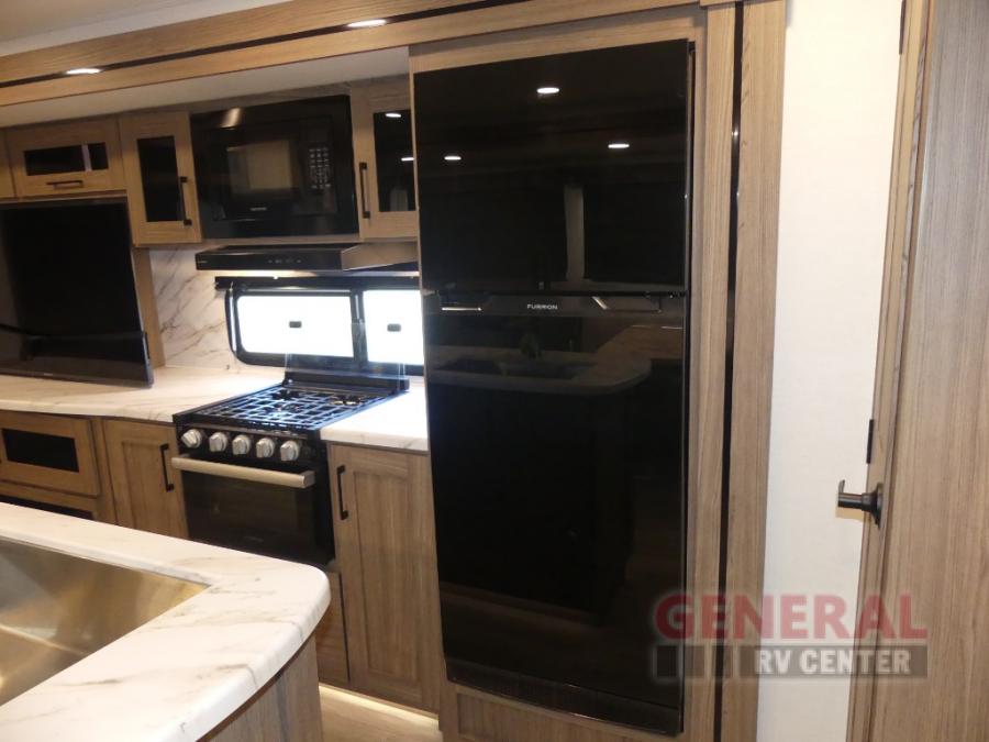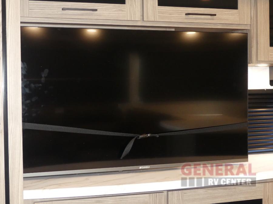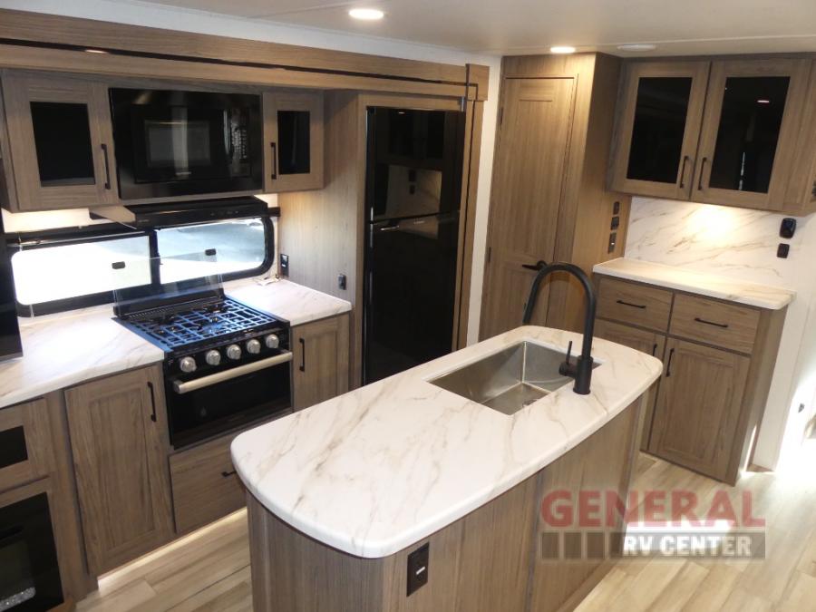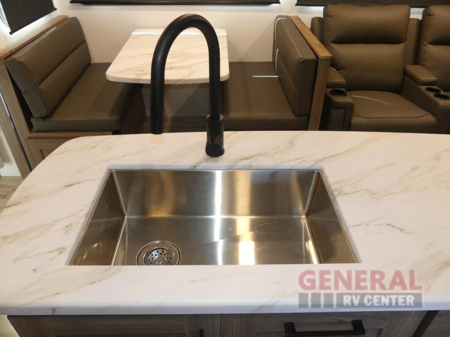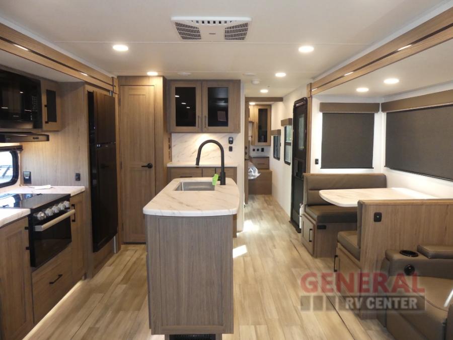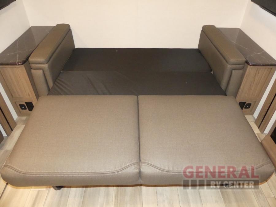 You will feel right at home camping in this travel trailer! The rear living area has a rear sofa and a set of theater seating conveniently across from the entertainment center with a 50" class HDTV above a pull-out fireplace storage for a cozy evening indoors. Prepare your best home cooked meals with the three burner cooktop, kitchen island which even has a tip-out trash can, and 10 cu. ft. 12V refrigerator. Enjoy your meals at the free standing dinette then either freshen up in the full bathroom with the 30" x 36" shower or head outside to relax under one of the two awnings. The front private bedroom has a queen bed for you to lay your head on at night and has wardrobe nightstands for your items!