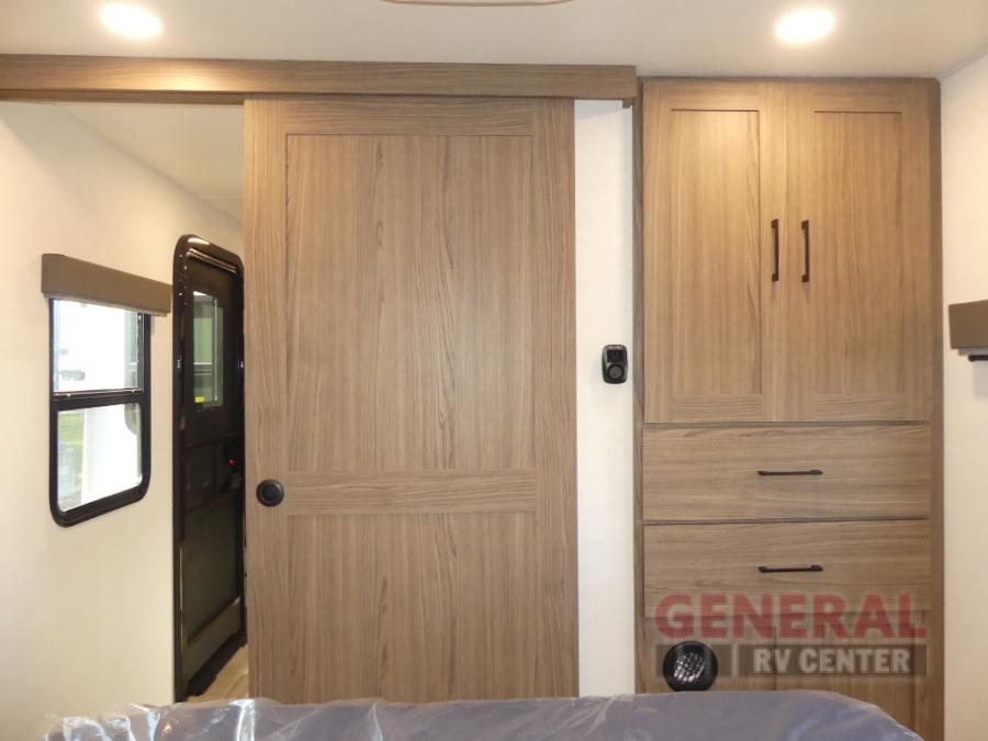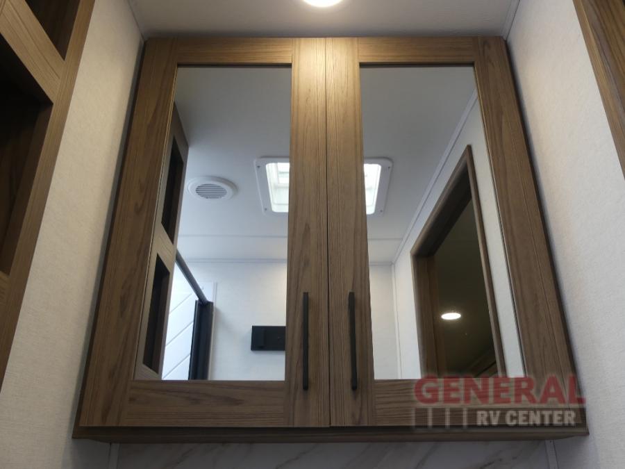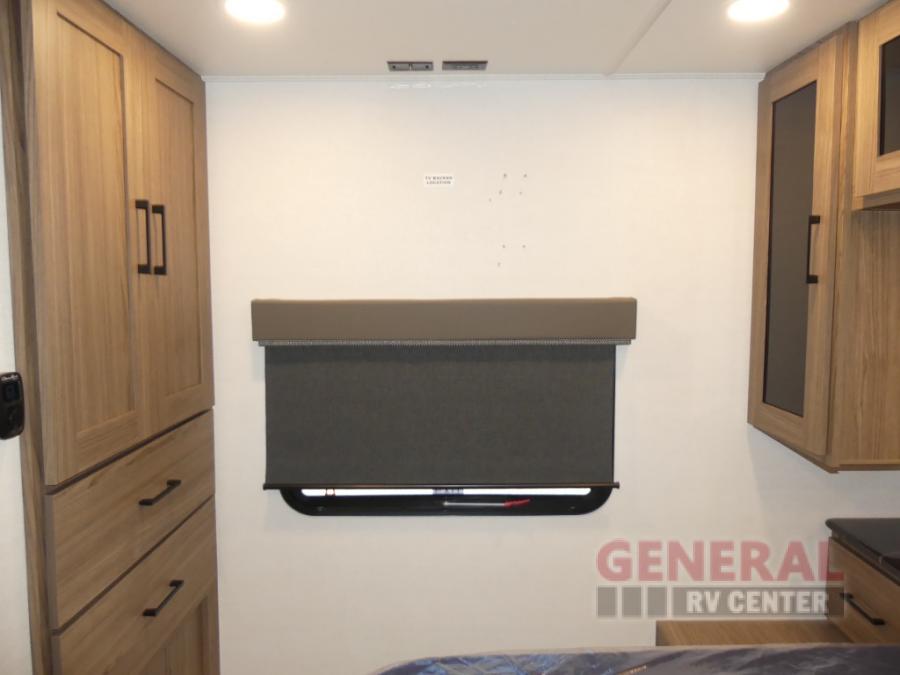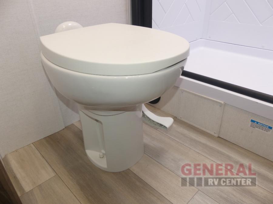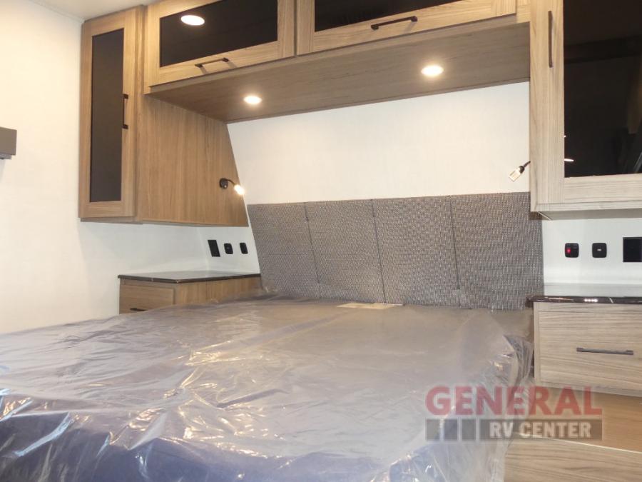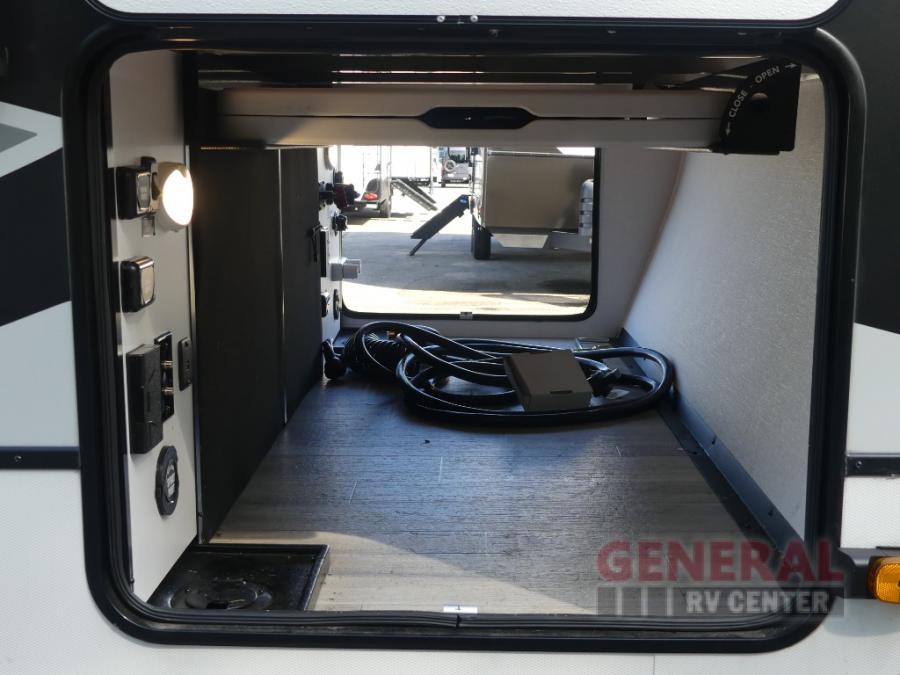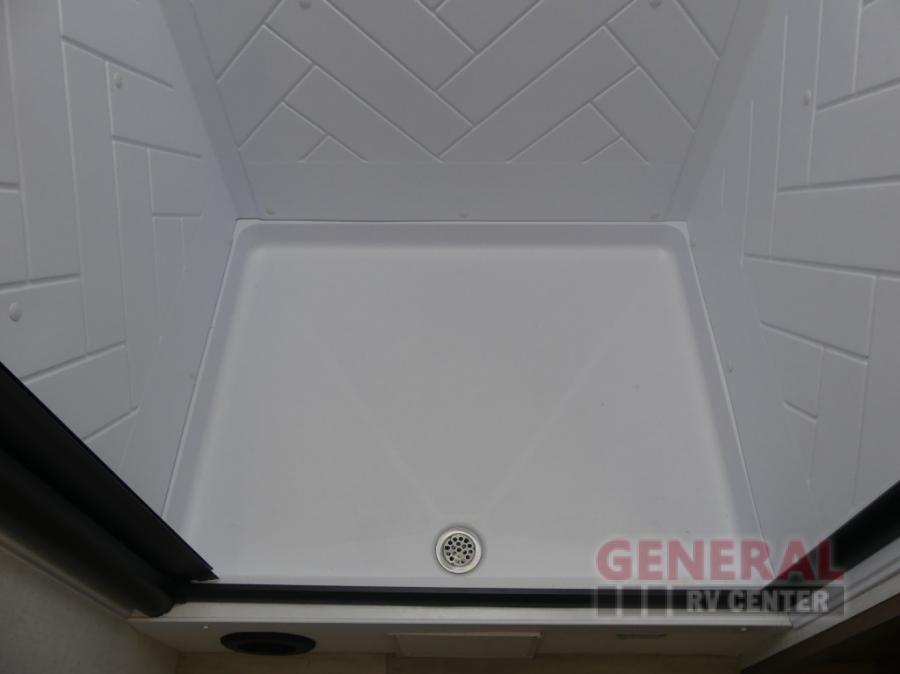 You will feel right at home camping in this travel trailer! The rear living area has a rear sofa and a set of theater seating conveniently across from the entertainment center with a 50" class HDTV above a pull-out fireplace storage for a cozy evening indoors. Prepare your best home cooked meals with the three burner cooktop, kitchen island which even has a tip-out trash can, and 10 cu. ft. 12V refrigerator. Enjoy your meals at the free standing dinette then either freshen up in the full bathroom with the 30" x 36" shower or head outside to relax under one of the two awnings. The front private bedroom has a queen bed for you to lay your head on at night and has wardrobe nightstands for your items!