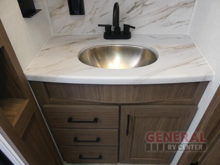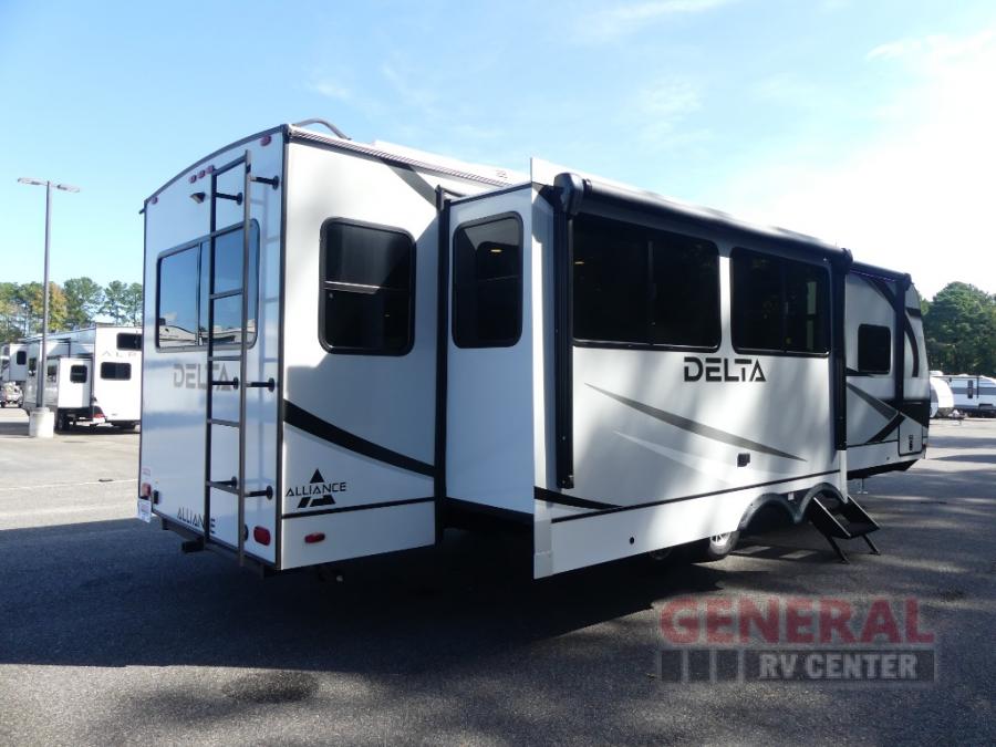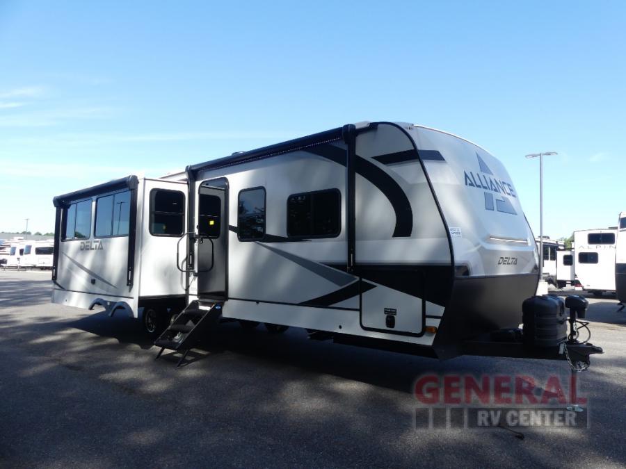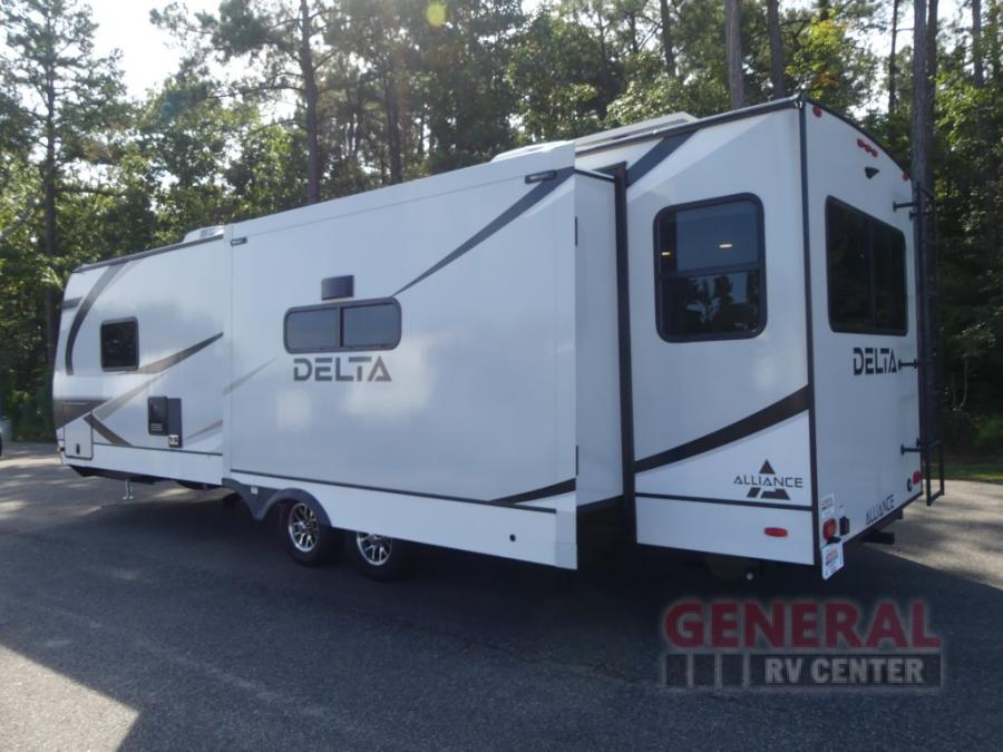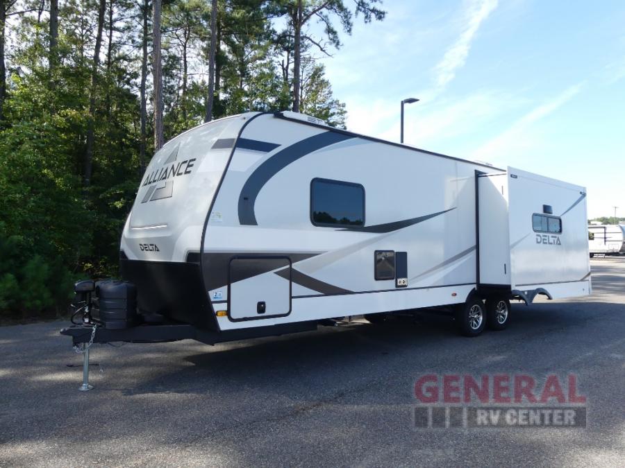 Form and function works together with every one of these Alliance RV Delta travel trailers! They are built with a walk-on roof with a seamless PVC roof covering, Mylar reinforced exterior seals, and a heated and enclosed underbelly to protect your unit in all seasons. The commercial grade vinyl flooring will be easy to clean and the oversized atrium windows throughout let in plenty of natural sunlight. With 62 cu. ft. of drop frame pass-through storage, you can bring along all of your essential camping gear plus it has USB charging for more convenience. There are many at home interior conveniences including a Bluetooth speaker, USB charging throughout, and even a pull-out kitchen trash can. Come find your favorite model today!