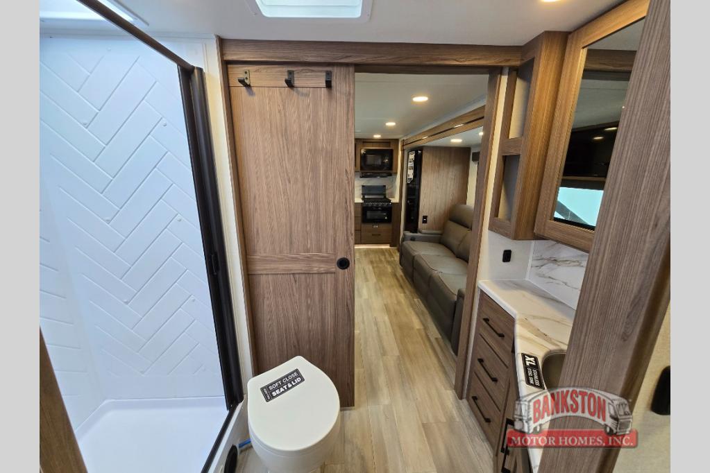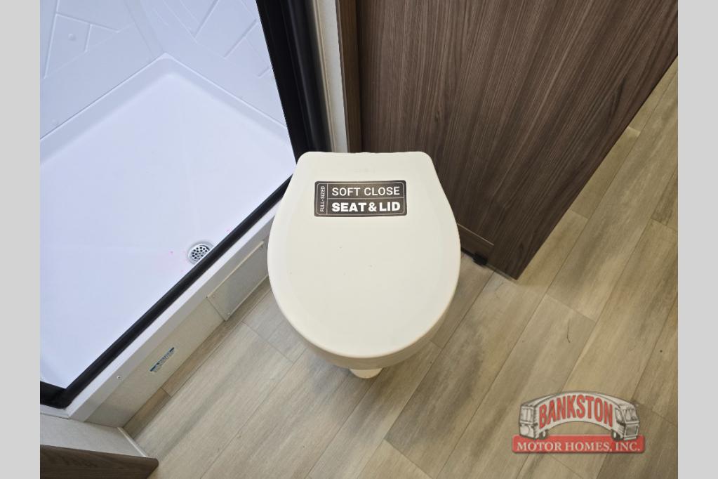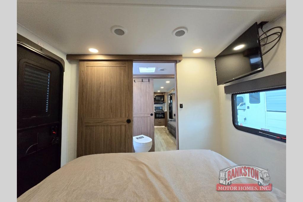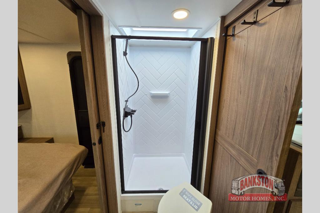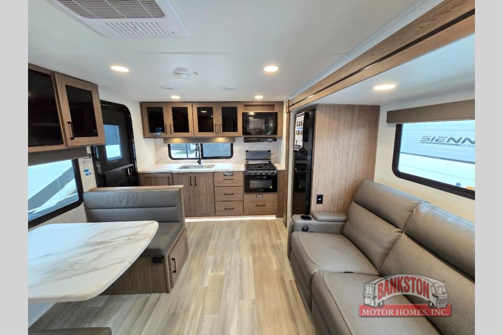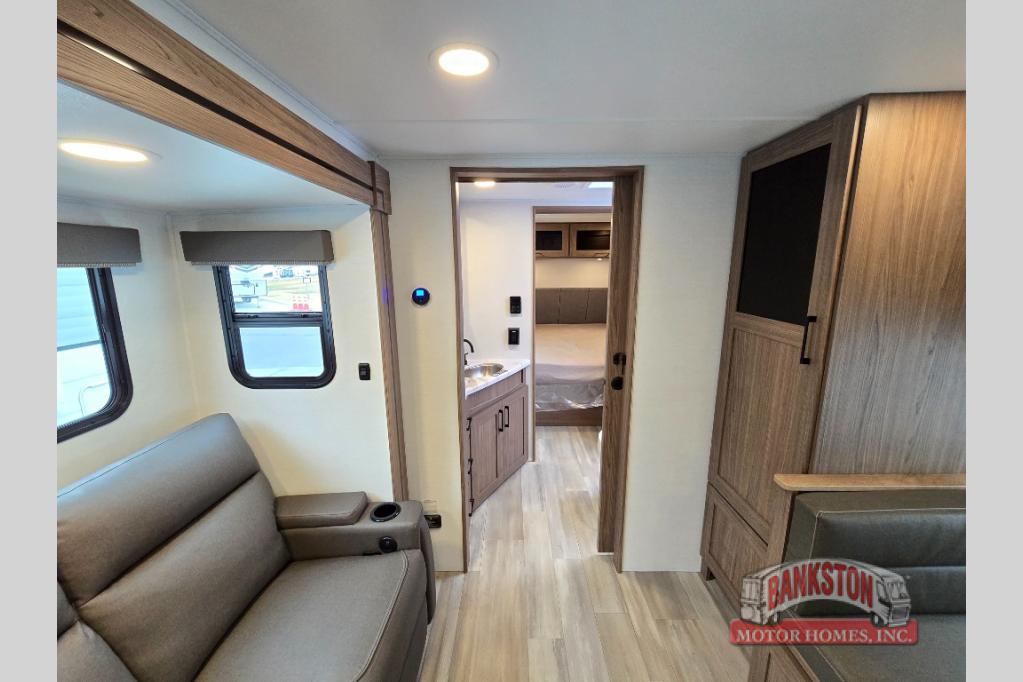 You'll love camping in this rear kitchen travel trailer with generous counter space and overhead storage for spices, dishes, and more. You can dine each day at the booth dinette or relax on the sofa slide out, which will provide more floor space. The spacious walk-thru bath includes a 30" x 36" shower, toilet, and vanity so you can clean up each day. Head to the front master bedroom where you can sleep soundly on the walk-around queen bed with dual nightstands and wardrobes. The second entry door is also found in this room so you can slip out for an early morning run!