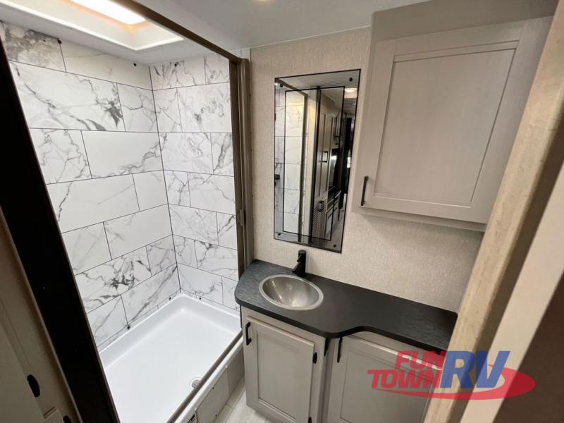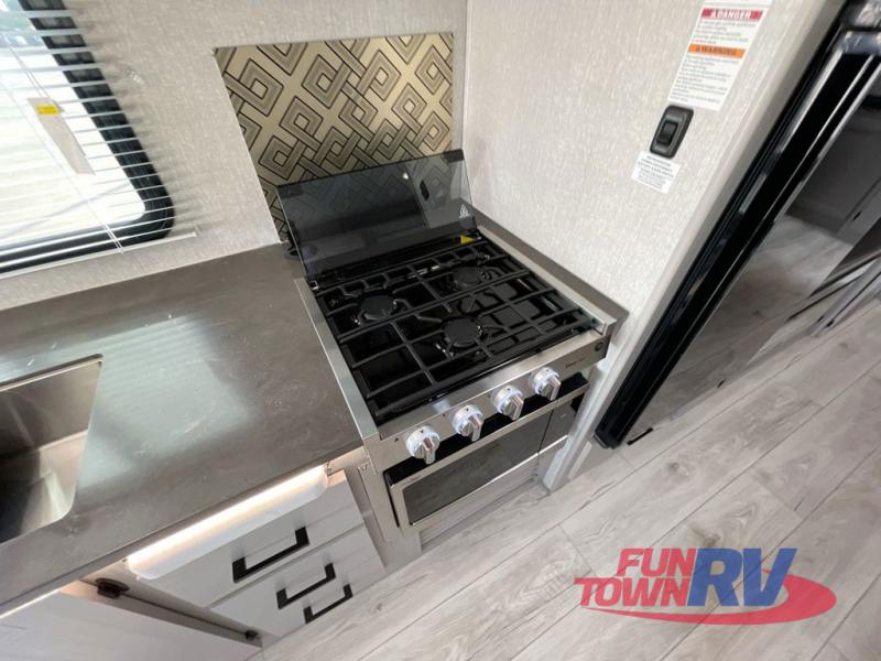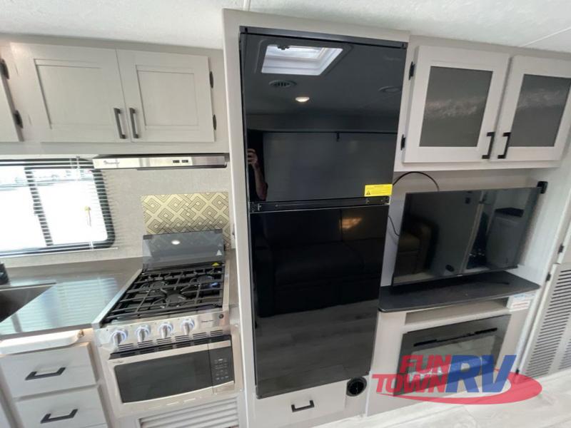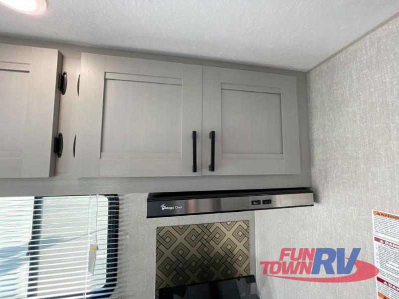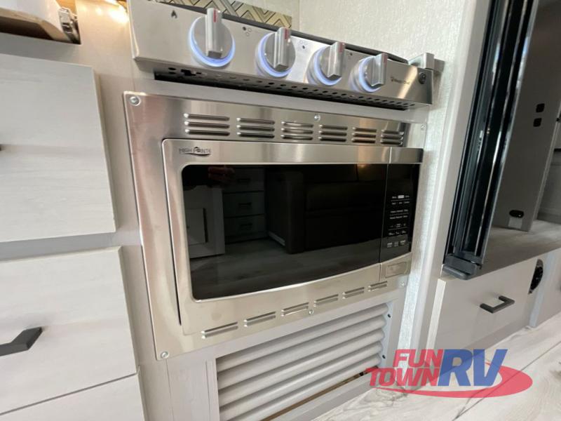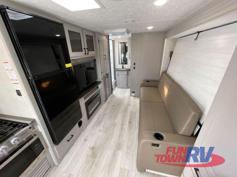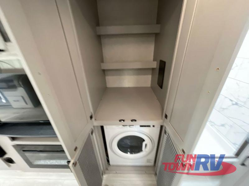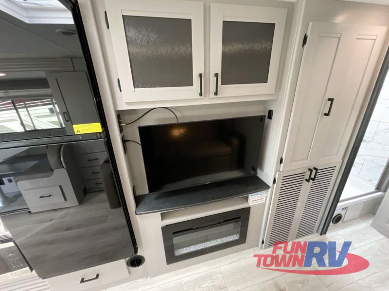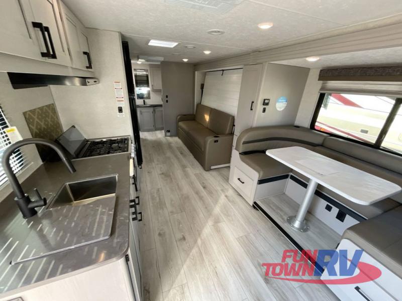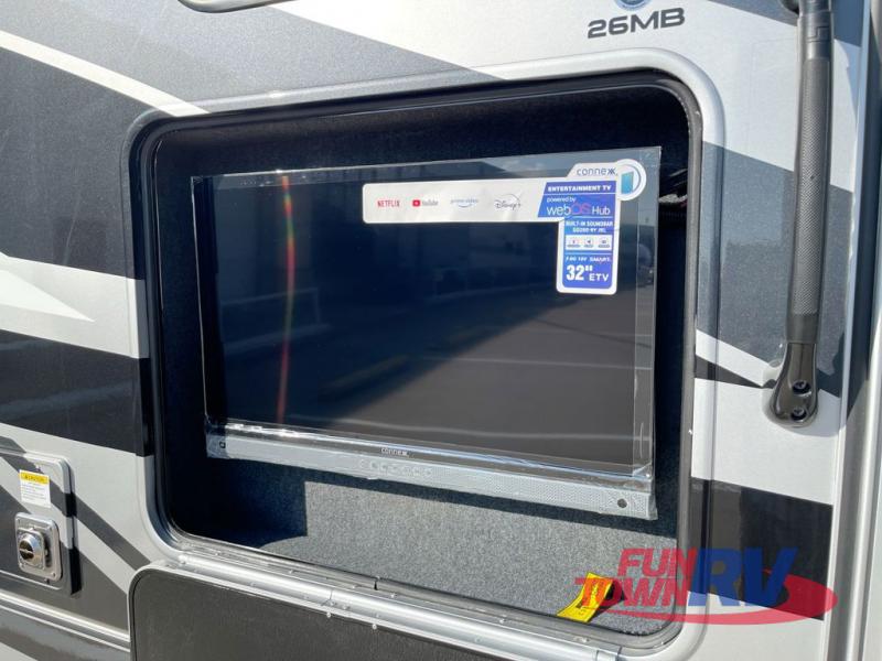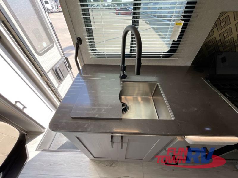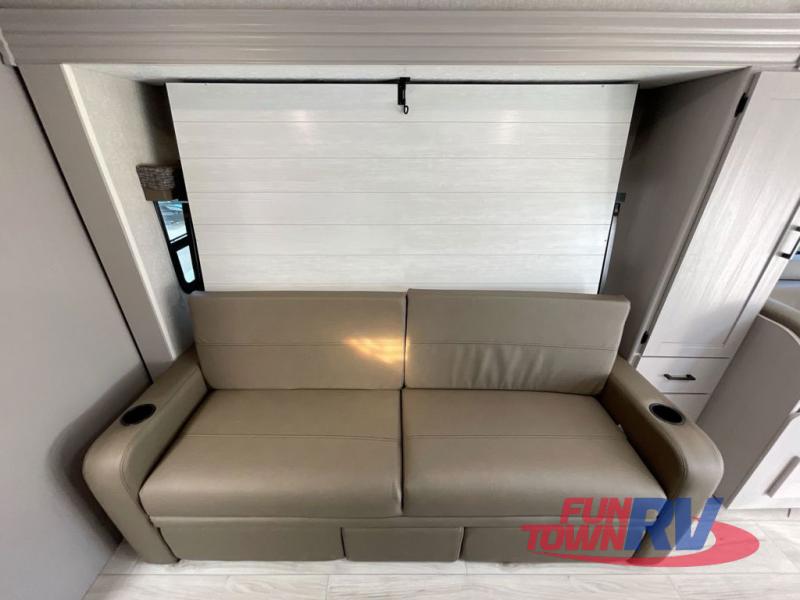 There is versatility found all throughout this motorhome! Starting with the 72" x 74" Murphy bed that offers a comfortable place to sleep and can convert into a 84" sofa to sit on during the day. Across from it is a 40" Smart TV with an optional fireplace below it plus optional washer and dryer ready. The 57" x 80" bunk over cab offers additional sleeping or storage space, and you could even transform the 44" x 82" U-shaped dinette into an extra sleeping space. The fully equipped kitchen has a pull-out countertop extension to make meal prepping easier and there is even an outside kitchen so you can cook dinner in the great outdoors!