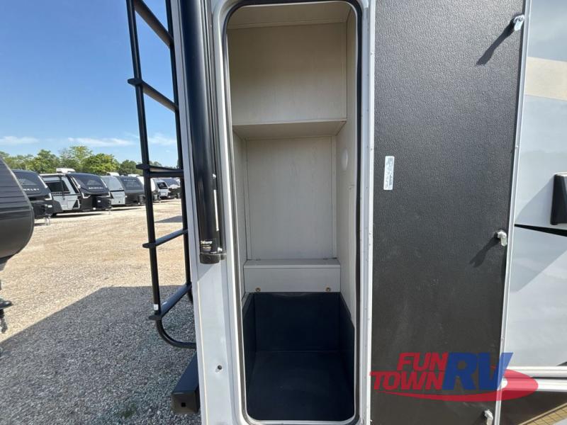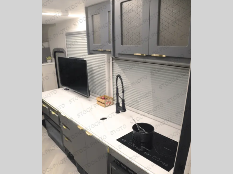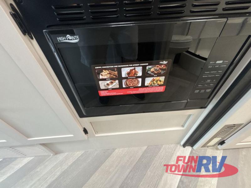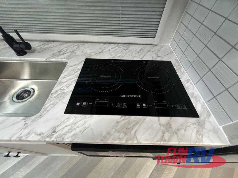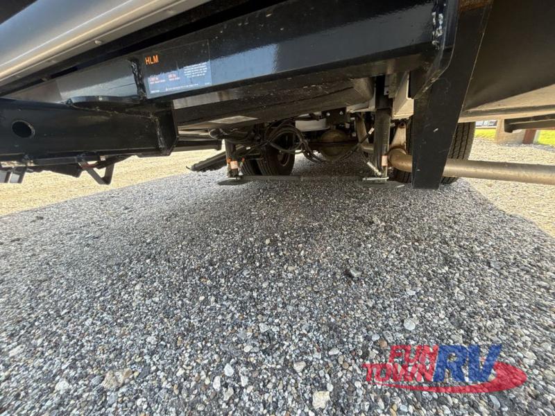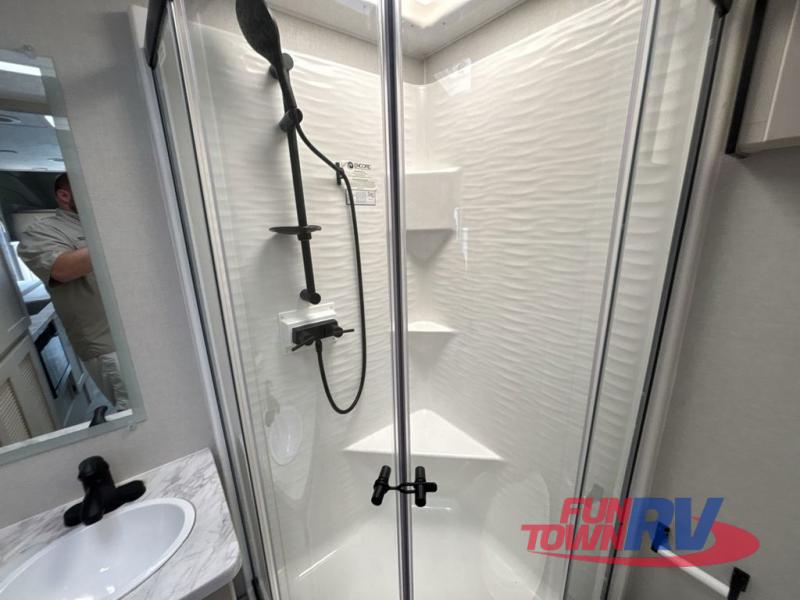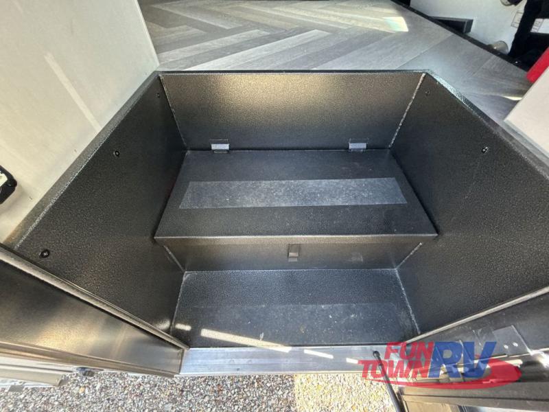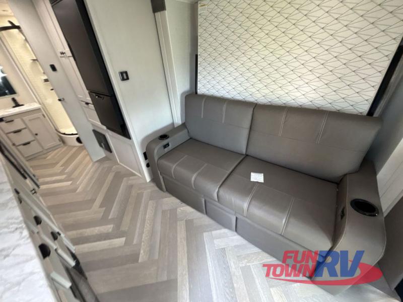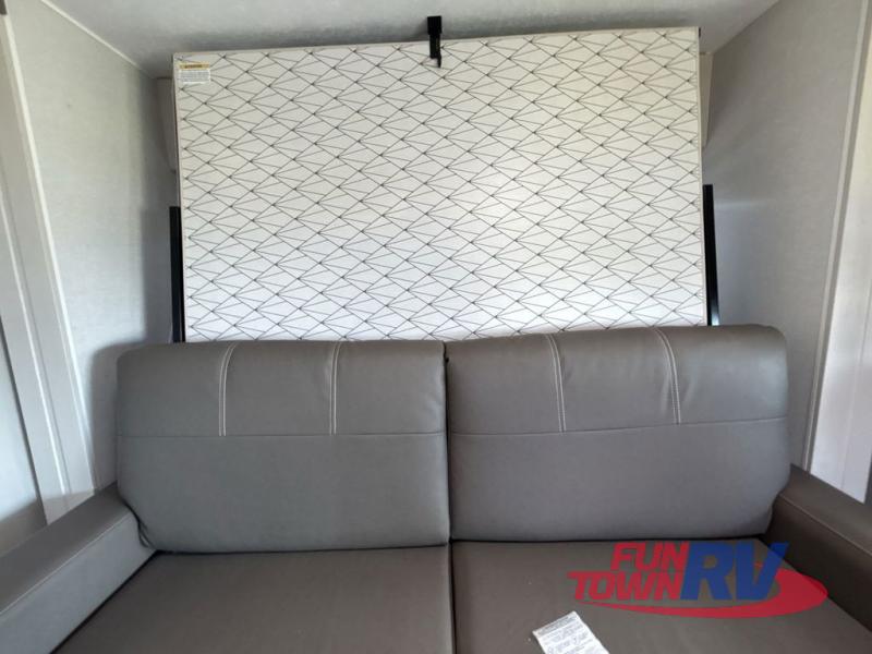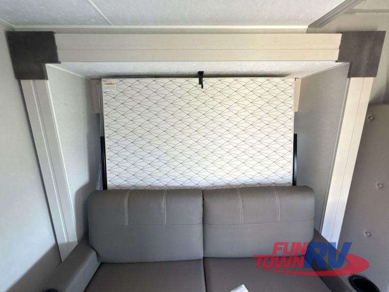 You will enjoy the versatility that this Murphy bed model provides. Depending on whether it is daytime or evening will determine if you have a 60" x 74" bed that slides out or a 62" sofa to enjoy. There is a 45" x 76" cab over bunk that can be used for added sleeping for two more guests, or used as added storage space. The rear full bath is spacious and private and includes a 32" x 32" angled shower, toilet, vanity with sink, plus linen cabinet, and wardrobe. The kitchen features everything needed to create meals while on the go, and a cozy fireplace is included beneath the coach TV for your enjoyment. Outside, you will find a second TV beneath the armless awning so you can enjoy watching your favorite movies and games whenever you like.