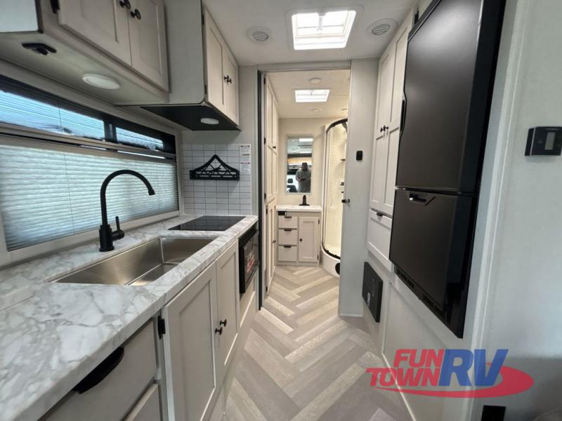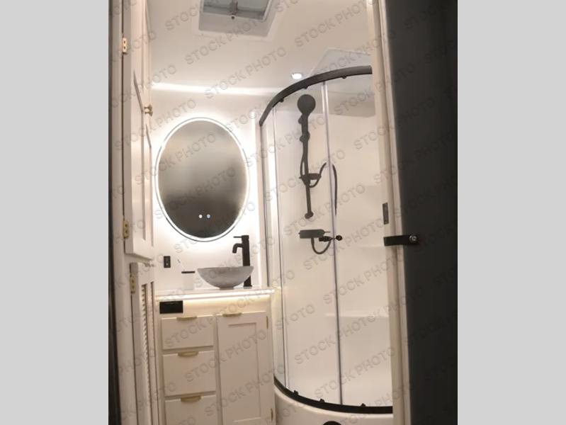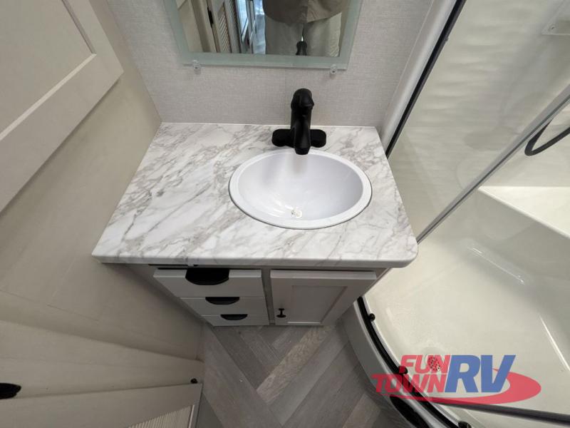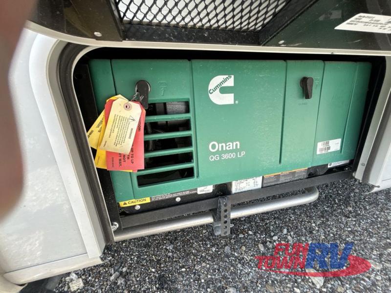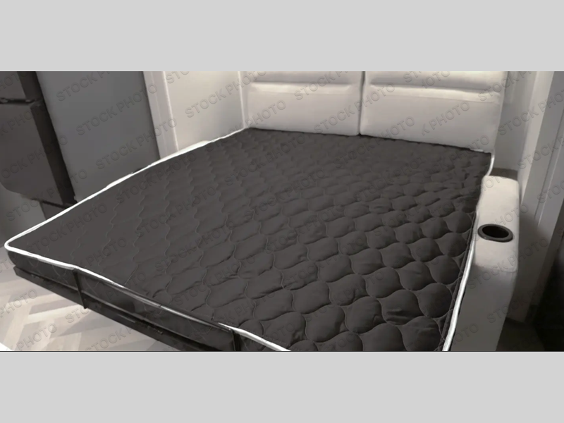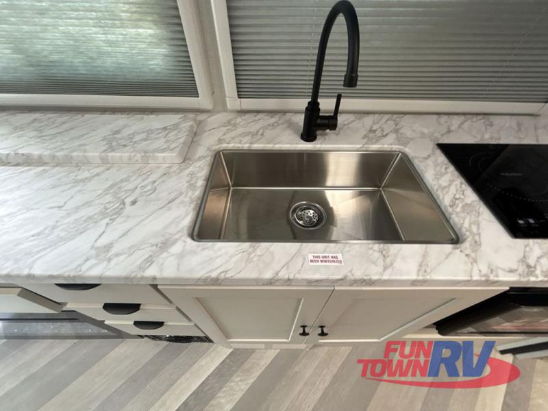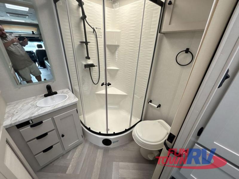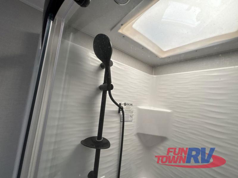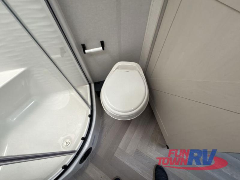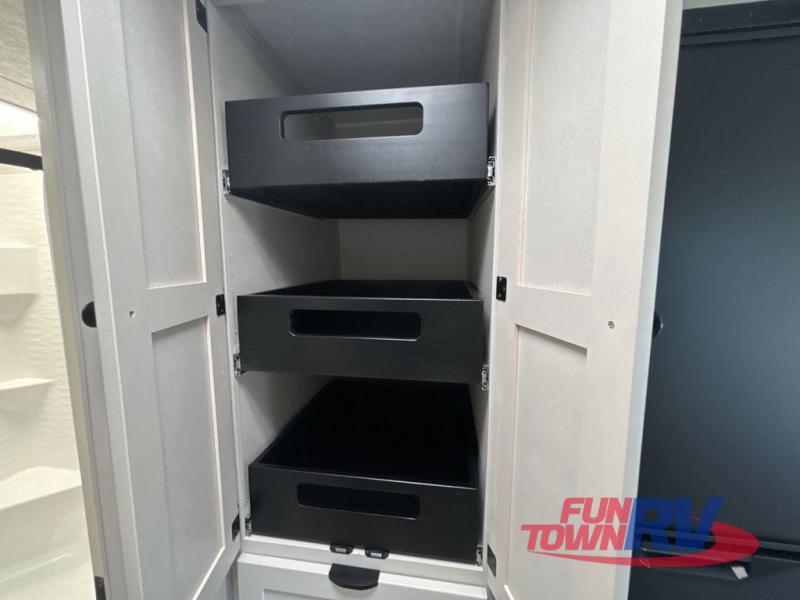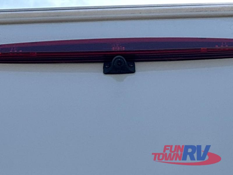 You will enjoy the versatility that this Murphy bed model provides. Depending on whether it is daytime or evening will determine if you have a 60" x 74" bed that slides out or a 62" sofa to enjoy. There is a 45" x 76" cab over bunk that can be used for added sleeping for two more guests, or used as added storage space. The rear full bath is spacious and private and includes a 32" x 32" angled shower, toilet, vanity with sink, plus linen cabinet, and wardrobe. The kitchen features everything needed to create meals while on the go, and a cozy fireplace is included beneath the coach TV for your enjoyment. Outside, you will find a second TV beneath the armless awning so you can enjoy watching your favorite movies and games whenever you like.