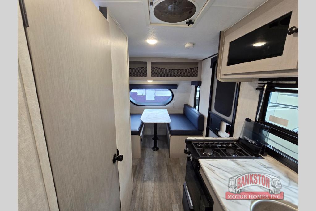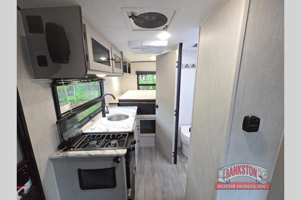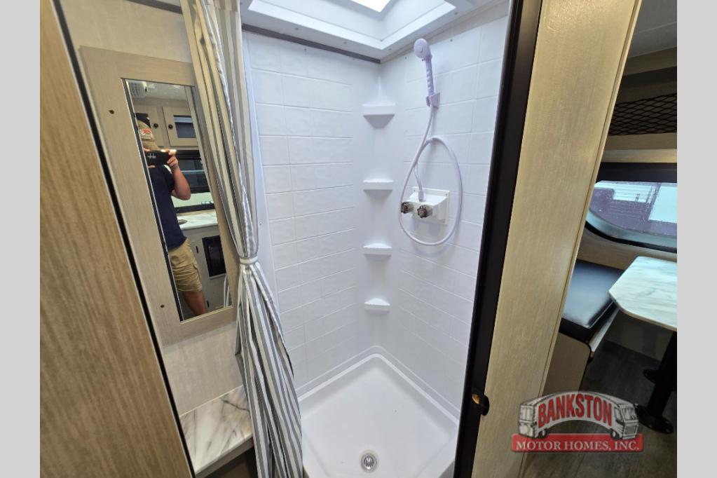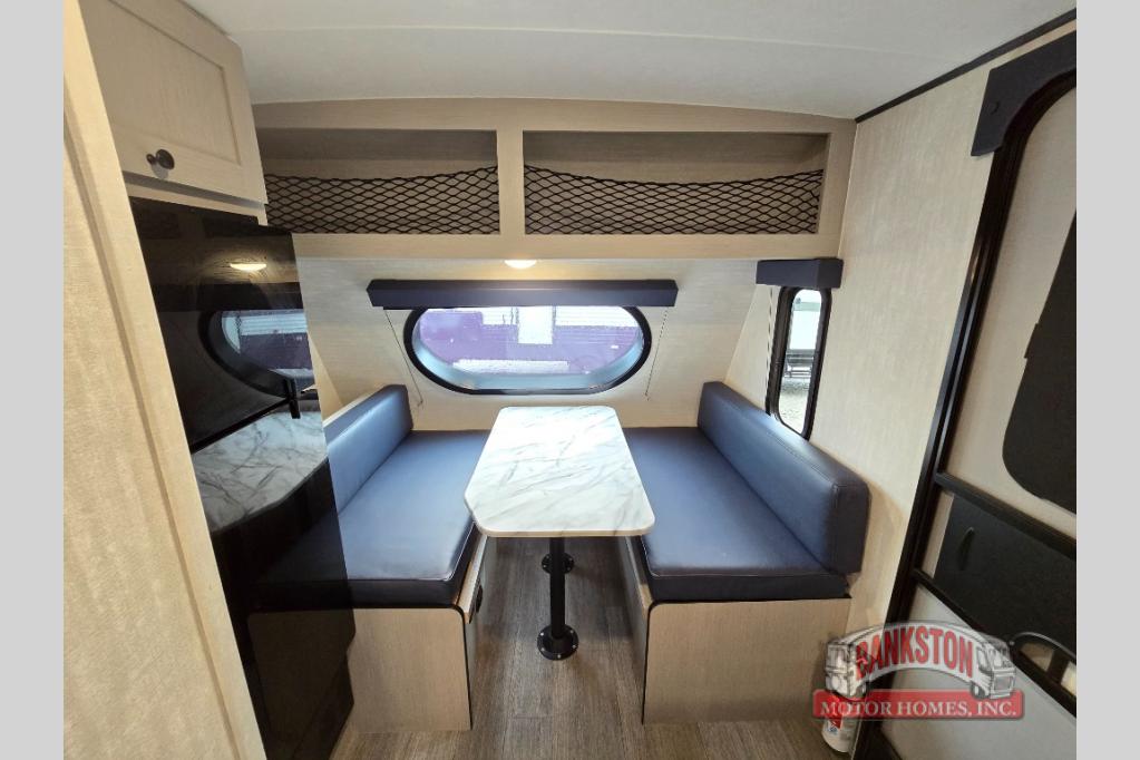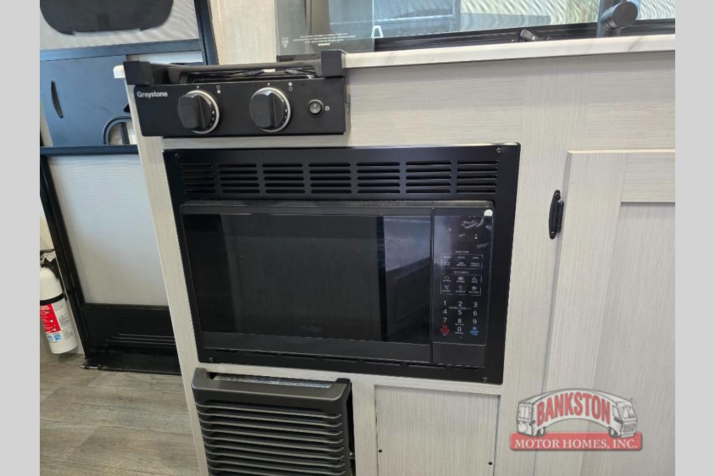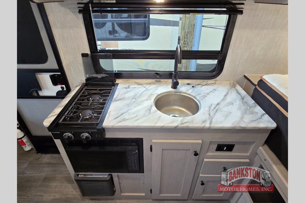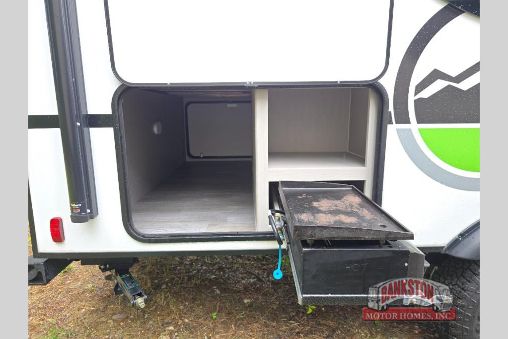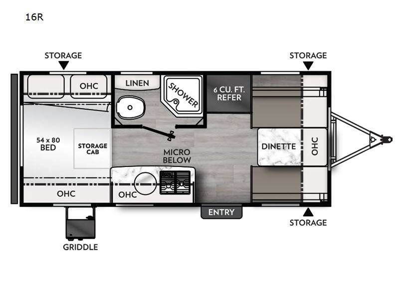 Three can camp comfortably in this Remote travel trailer with plenty of outdoor storage! There is a 54" x 80" bed inside for sleeping with overhead storage and more below. A full bath with angled shower will keep everyone feeling refreshed, and the skylight not only lets in more natural lighting, but more head room as well. Cook inside or out with the two burner cooktop and microwave, or outside on the cast iron griddle. Dine at the booth dinette inside which can also be transformed into sleeping for one more.