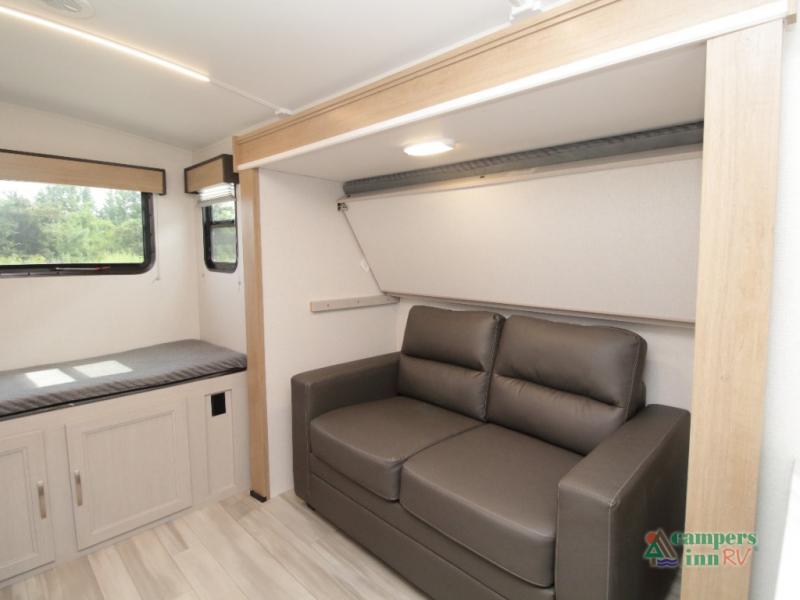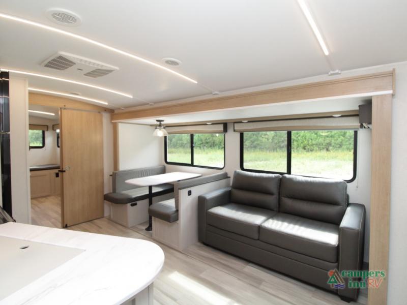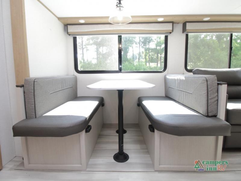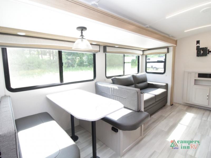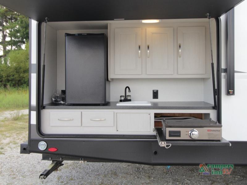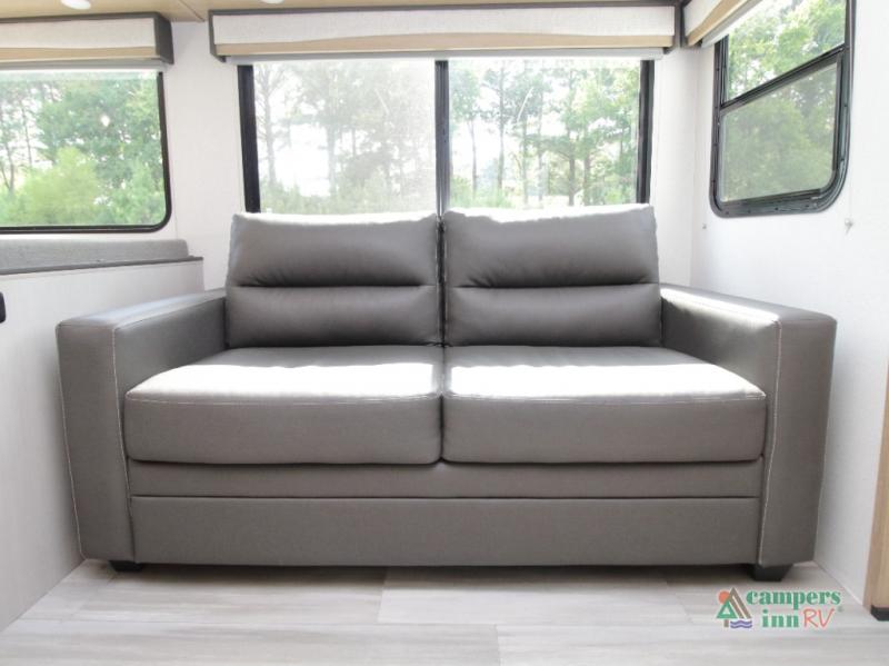 In the main living area, you’ll find a tri-fold sofa and a booth dinette for meals and movie nights. Step outside under the 20' power awning with LED lights, where you can cook at the exterior kitchen while the kids play.