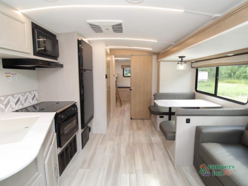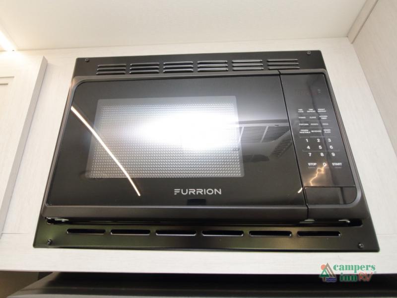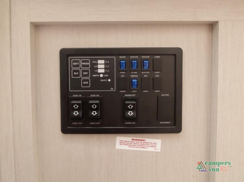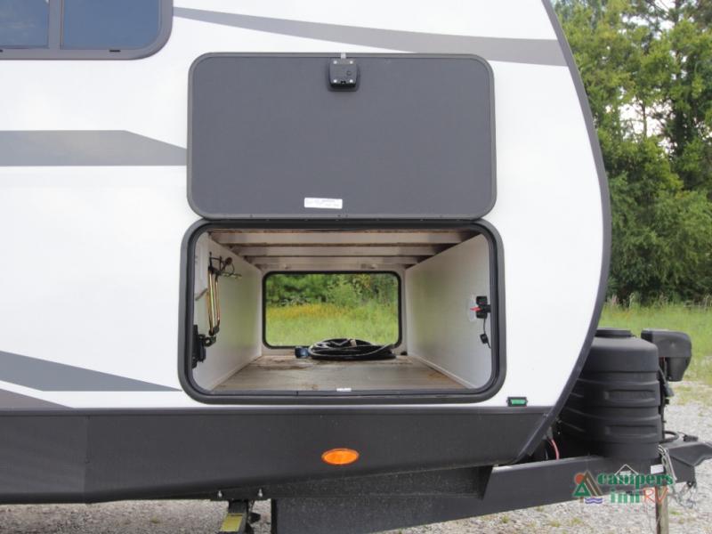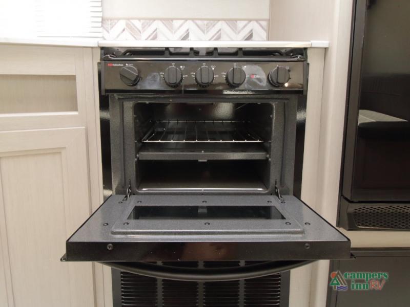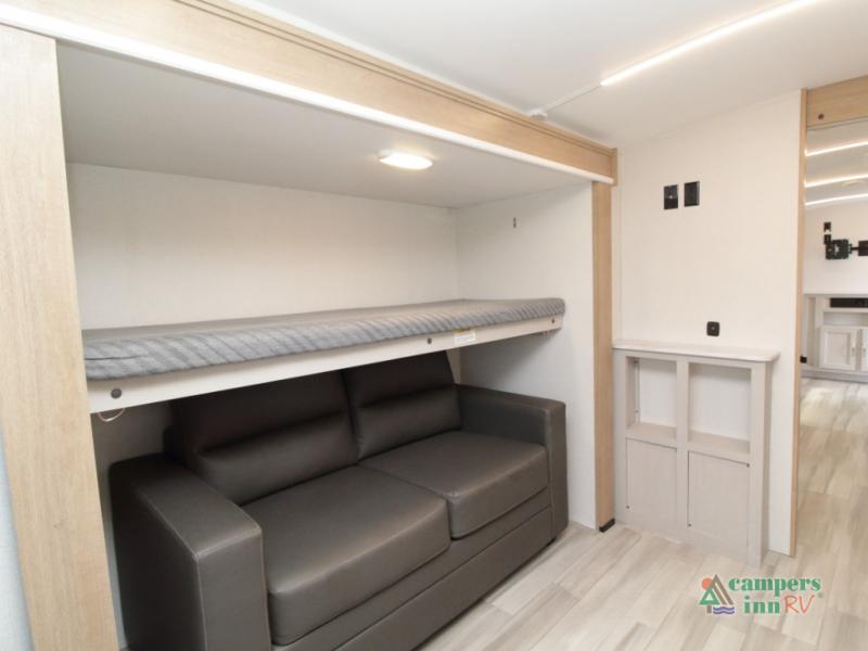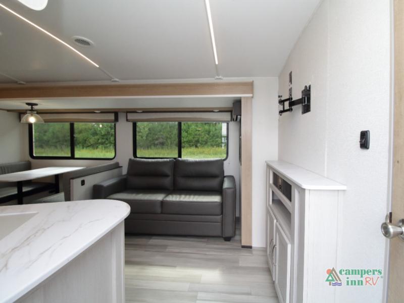 In the main living area, you’ll find a tri-fold sofa and a booth dinette for meals and movie nights. Step outside under the 20' power awning with LED lights, where you can cook at the exterior kitchen while the kids play.