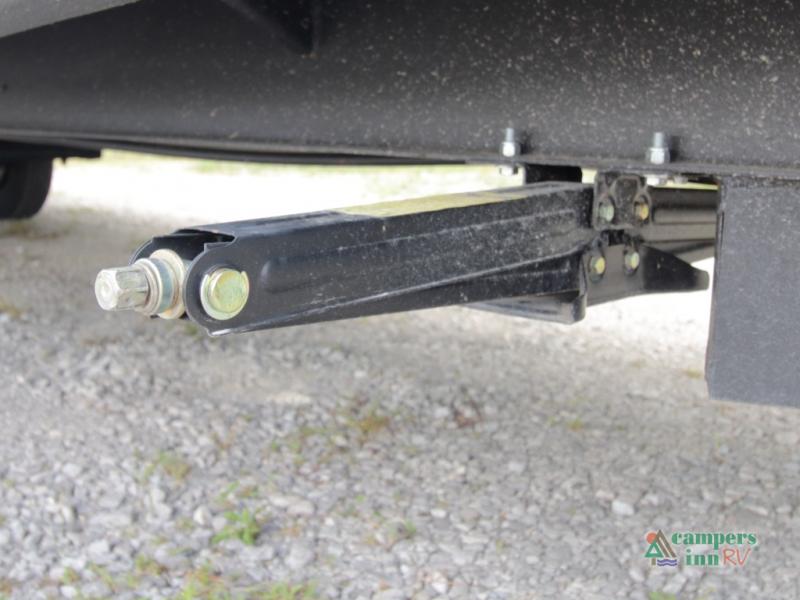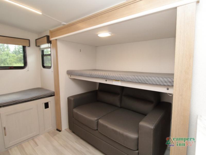The kids will love their own private bunkhouse at the rear, complete with a futon, multiple bunks, and an entertainment center. There’s even a bunk over the outdoor kitchen, giving them plenty of space to hang out and sleep. The full bath has its own exterior entry, so no tracking dirt through the trailer after outdoor adventures.