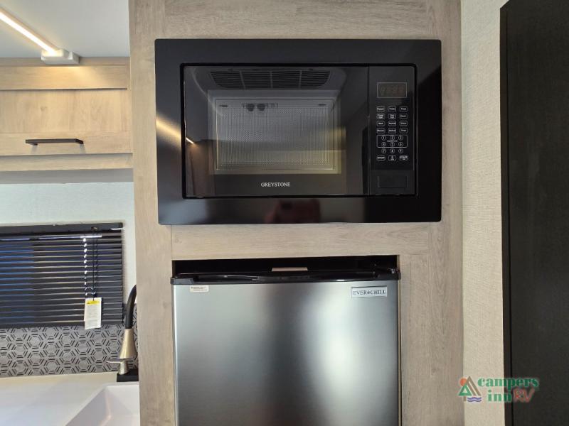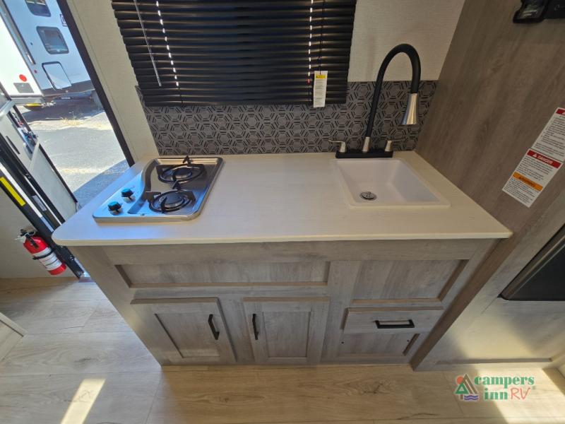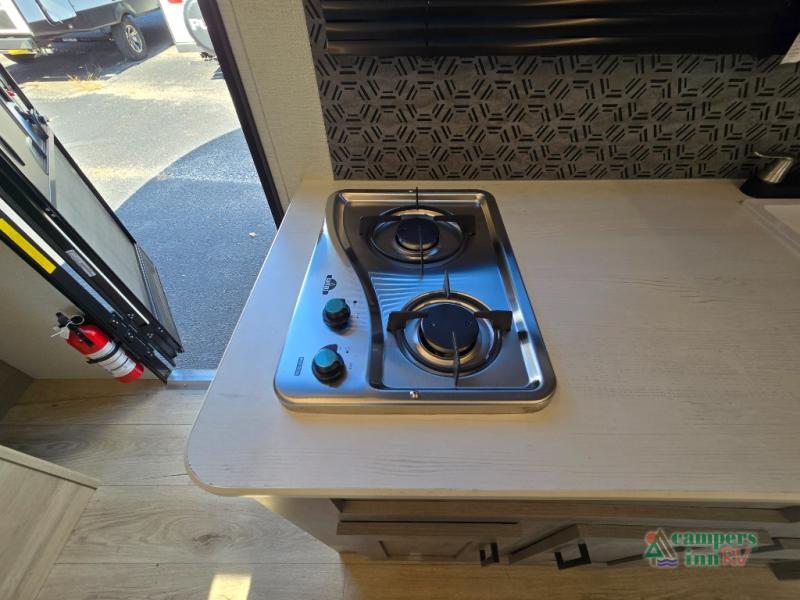 Don’t let the compact size fool you—this RV’s kitchen is fully equipped! It features a two-burner cooktop, microwave, refrigerator, and a stainless steel sink with a high-rise faucet. Whether you’re whipping up a quick meal or a gourmet dinner, the EL17BH has everything you need.