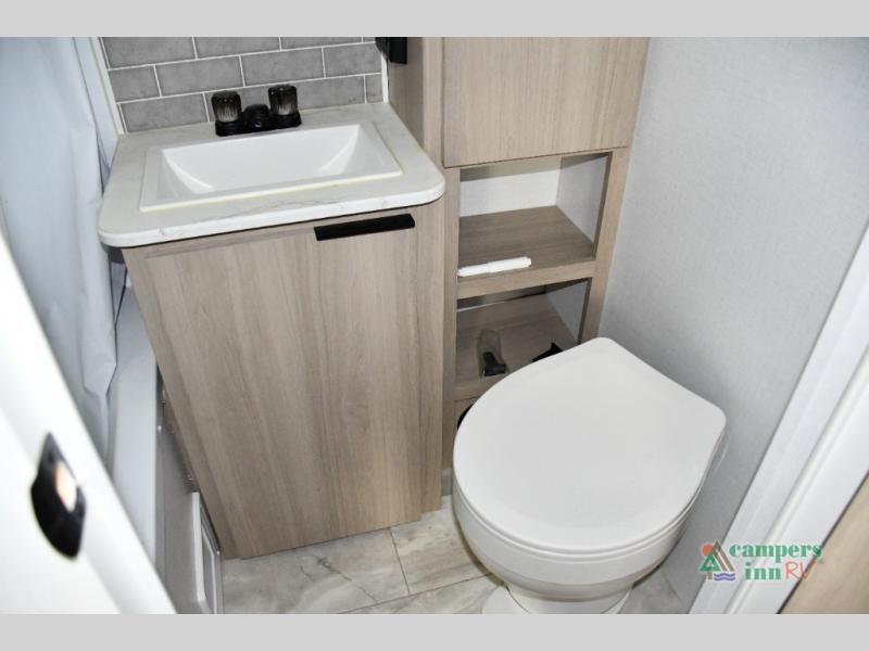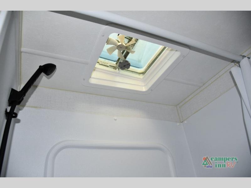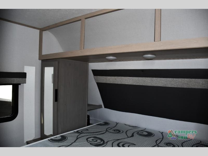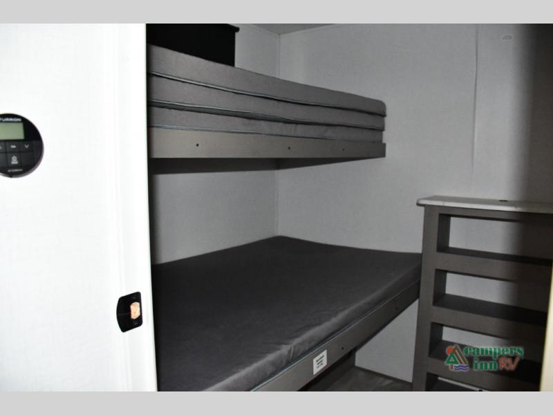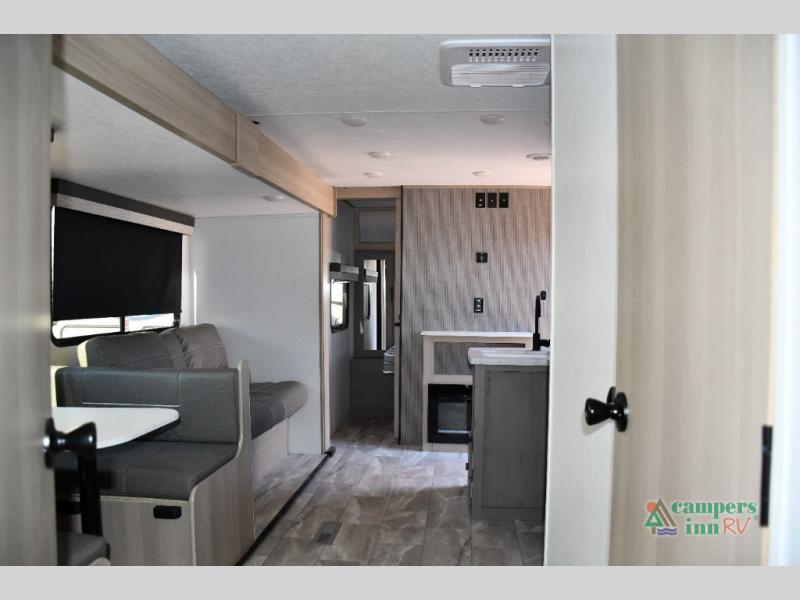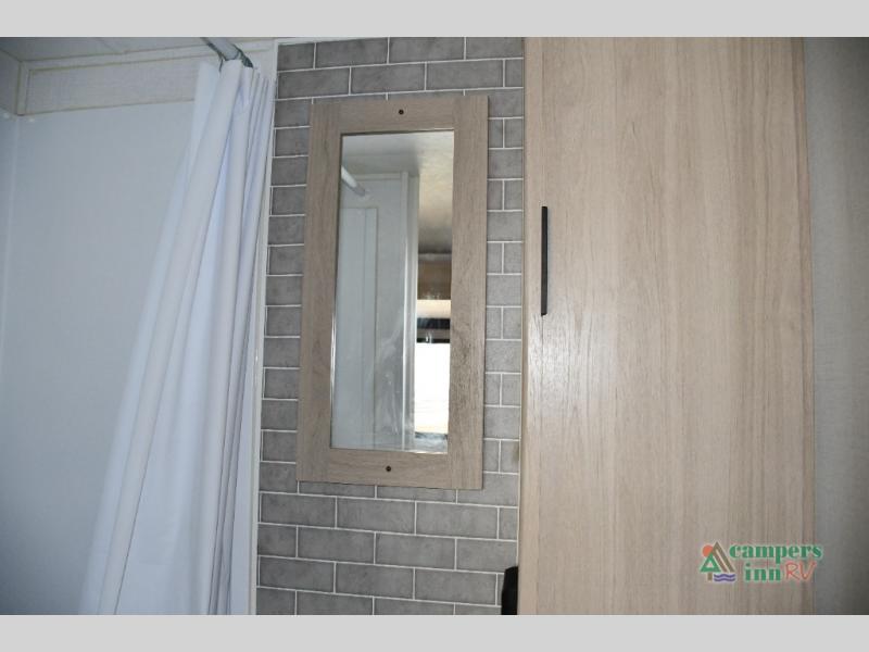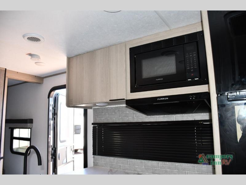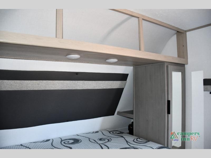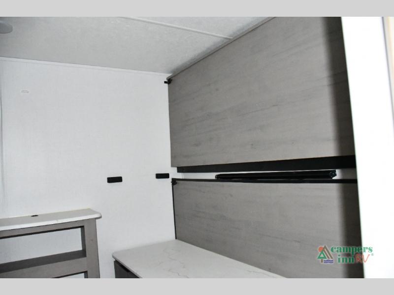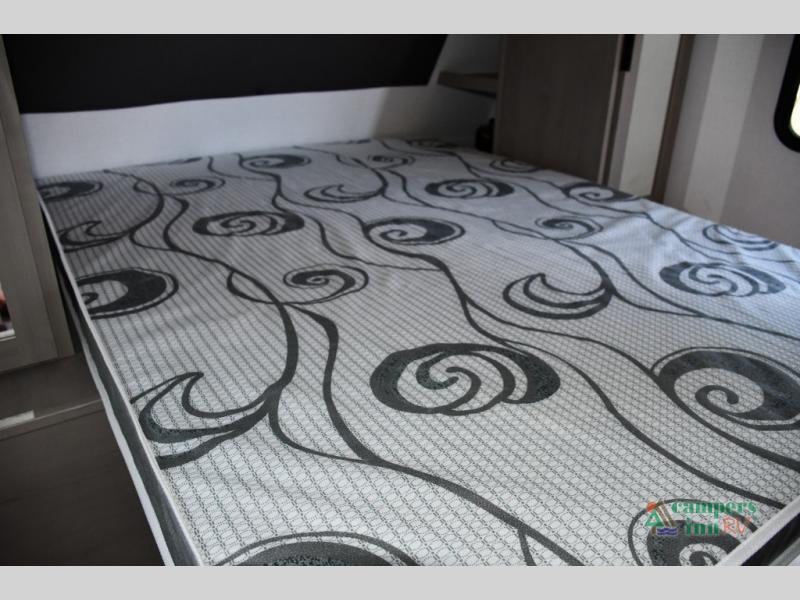 Blackout roller shades, modern valances, and 6' 8" ceilings give this trailer a residential feel with space to breathe.