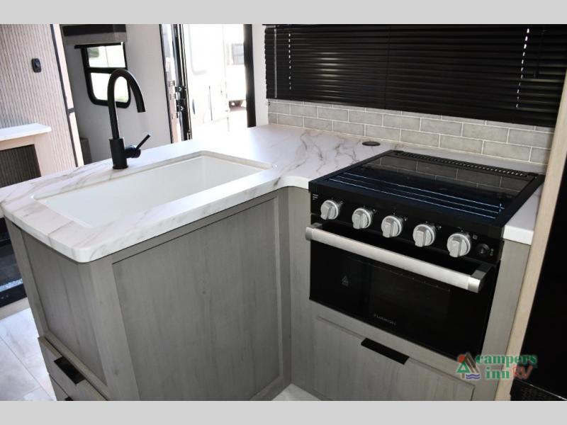 Includes a two-burner cooktop, oven, microwave, seamless countertops, and a 10 cu. ft. refrigerator—plus a dedicated pantry for all your dry goods and snacks.