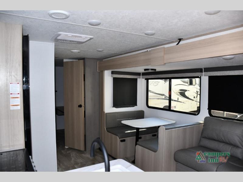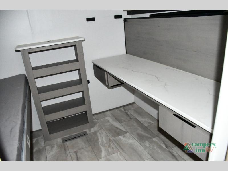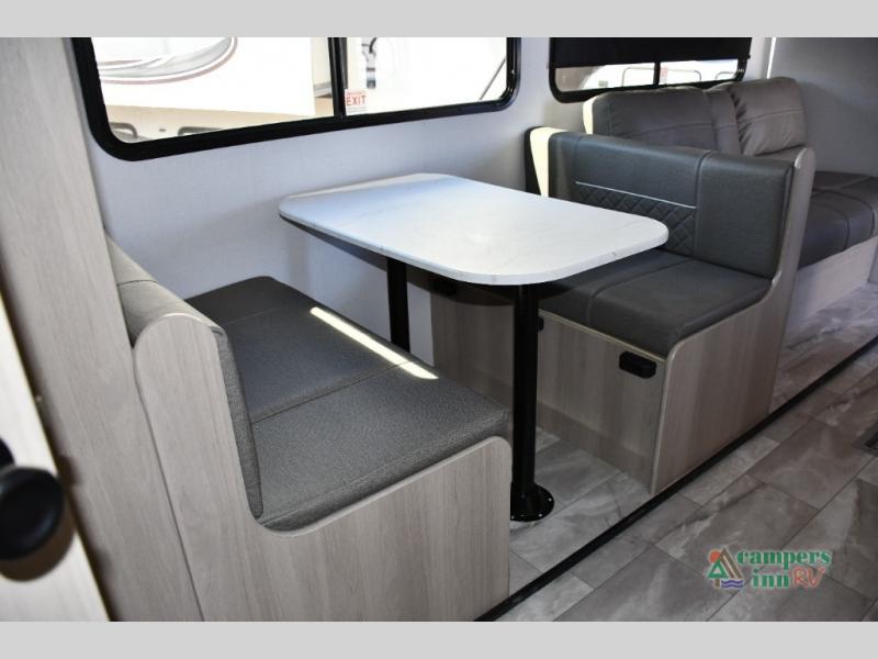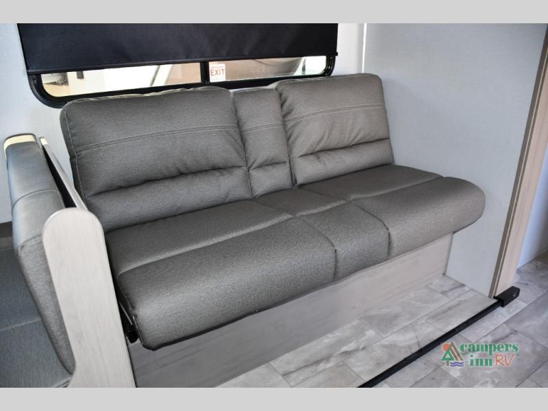 The rear bunk room includes two bunks plus a fold-up bunk over a booth dinette—ideal for kids, guests, or even as a playroom or private study zone. The dinette is perfect for meals, homework, or board games.