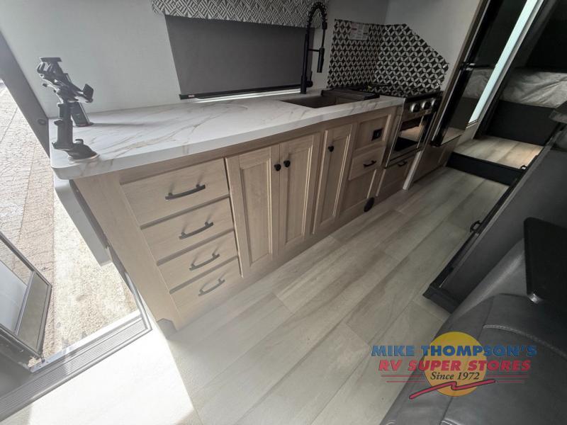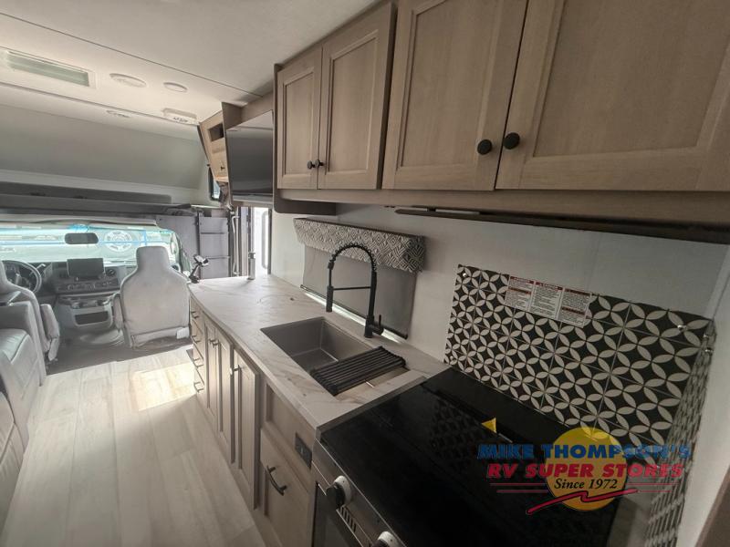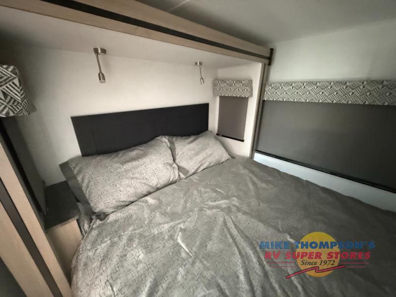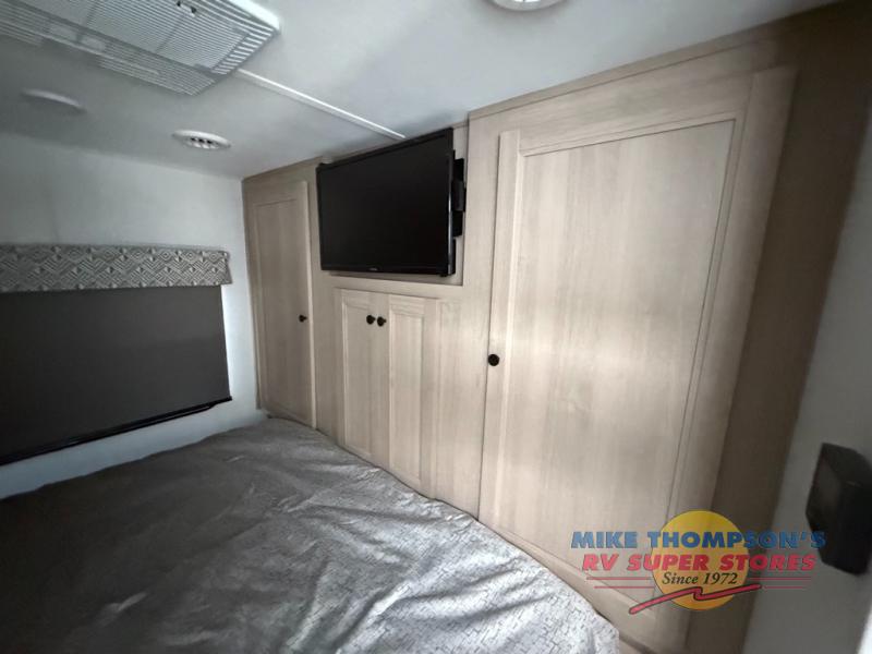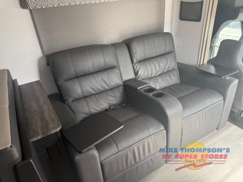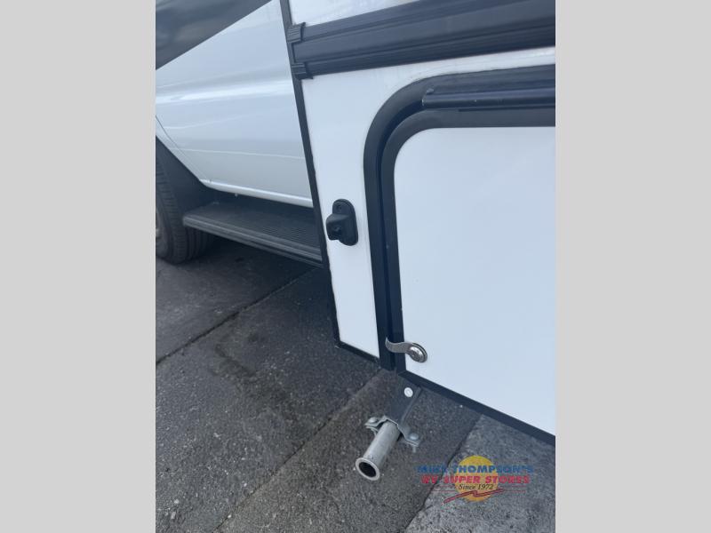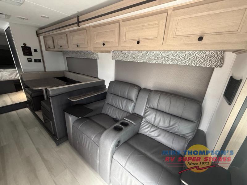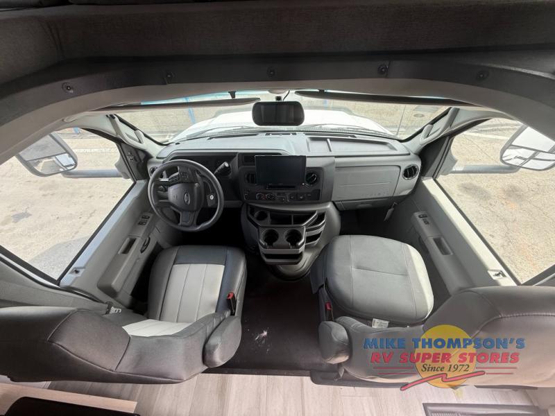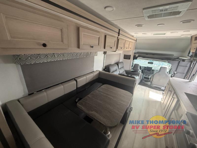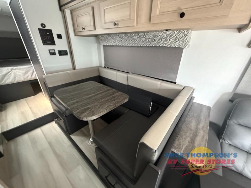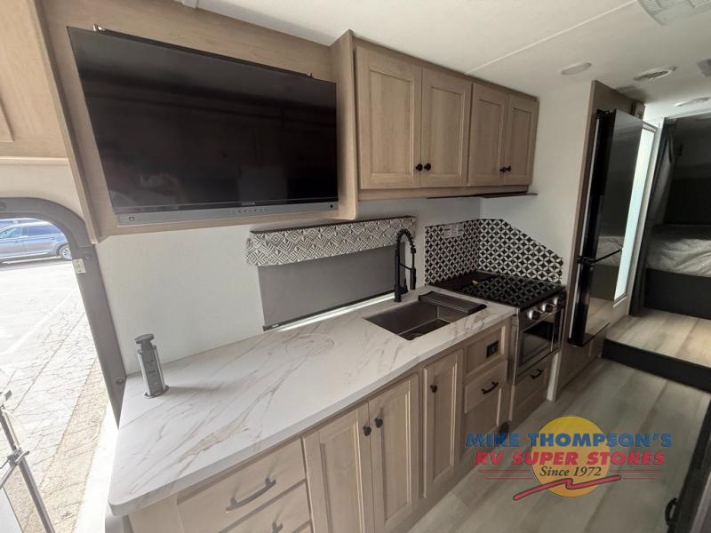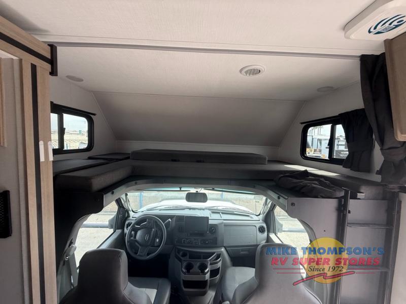 Escape the hustle and bustle of everyday life with this motorhome! It features a 60" x 80" bunk over cab mat which can be switched out for an optional Trekker cap with a built-in entertainment center. The sofa and U-shaped dinette slide offer comfortable places to enjoy meals, socialize, and even sleep once converted. Prepare your best meals with the 10.7 cu. ft. 12V refrigerator, the three burner cooktop, the flip-up countertop, and even the 1.3 cu. ft. undermount convection microwave. The separated bathroom has a 24" x 36" shower across from a toilet with a sink and countertop space, plus it leads directly into the rear private bedroom which has a 60" x 74" queen bed slide across from a linen/12V TV area with wardrobes on either side. You can even add an optional outside 12V TV and stay protected by the 15' 6" power awning!