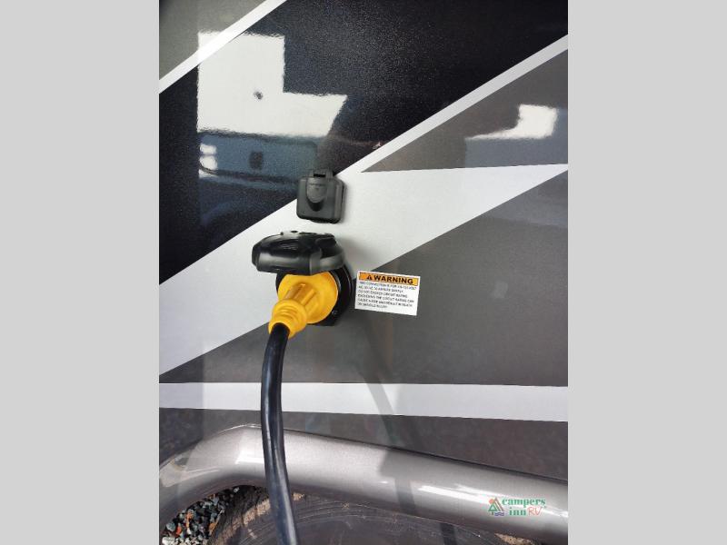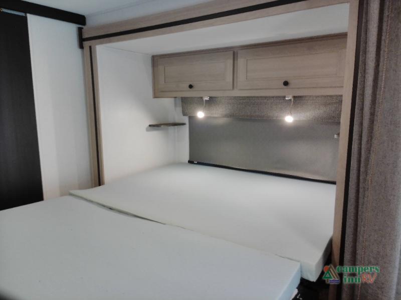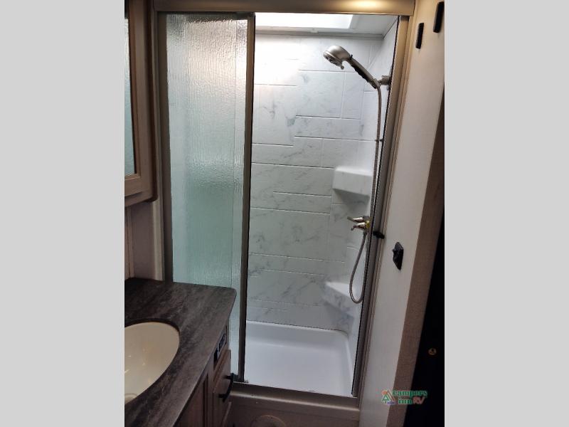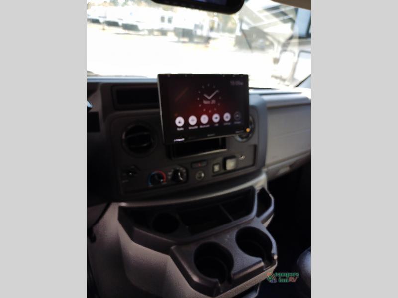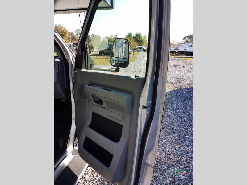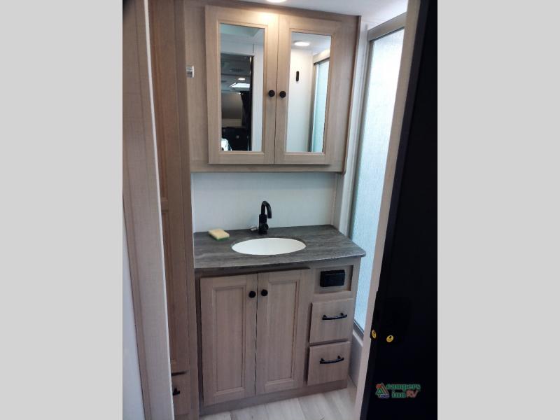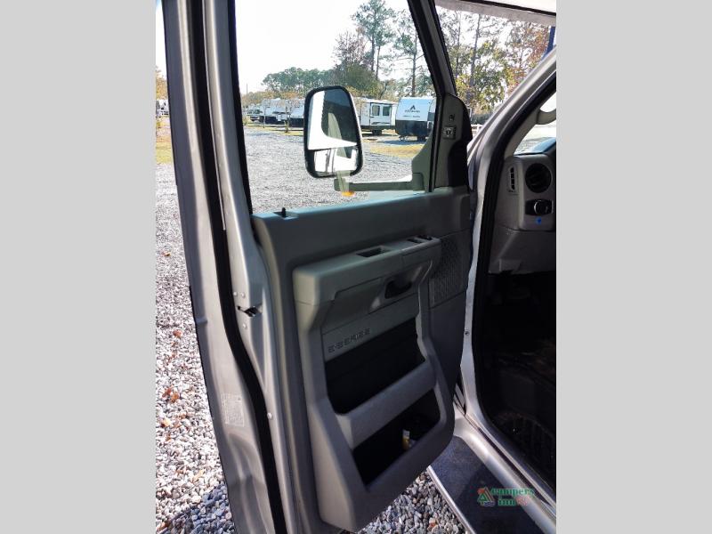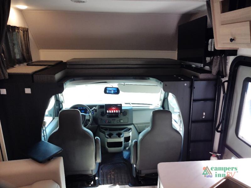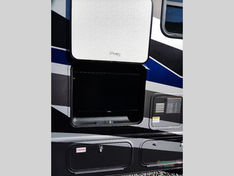 You will feel right at home traveling in this motorhome! The full rear bathroom has a 24" x 36" shower to freshen up in, plus storage space and a private toilet so you both can use this room at once. Inside the bedroom is a 60" x 74" queen bed slide with a wedge mattress for more space, and a 12V TV for movies in bed. Prepare your best meals with the three burner cooktop and the 10.7 cu. ft. 12V refrigerator or throw some leftovers in the undermount 1.3 cu. ft. convection microwave, then enjoy it at the U-shaped dinette slide. The 60" x 80" bunk over cab mat offers a comfortable place to sleep but if you don't need the extra sleeping space, you can switch it out for the optional Trekker cap with a built-in entertainment center, plus there is an optional outside 12V TV to add!