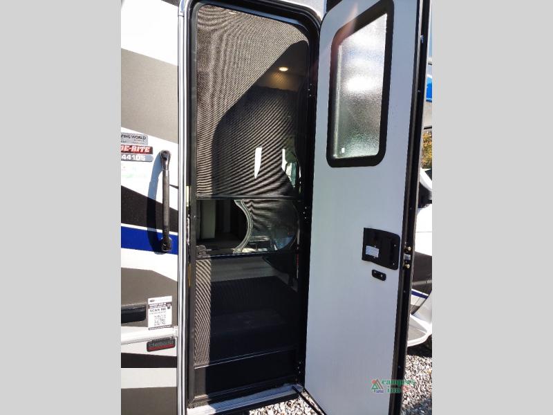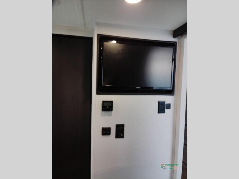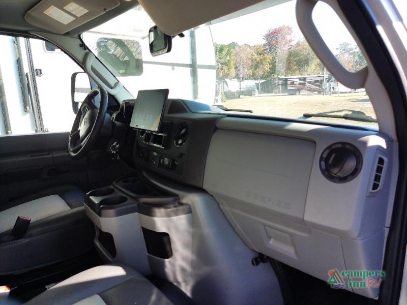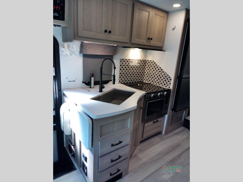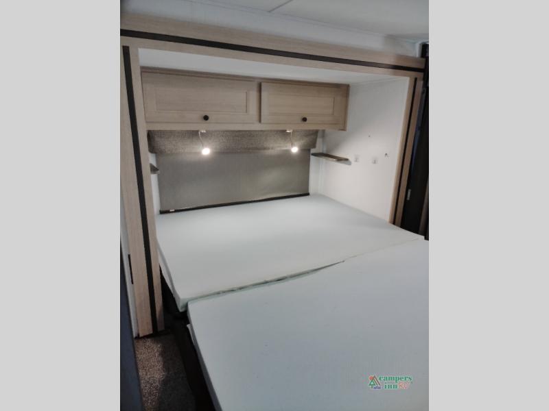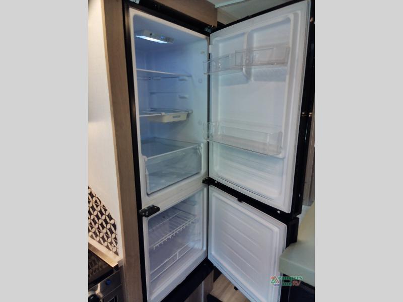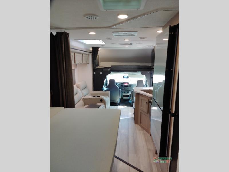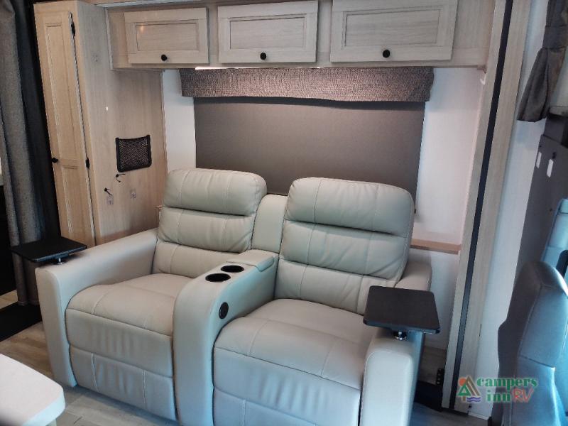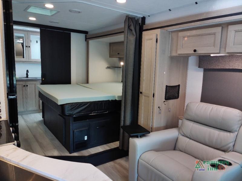 You will feel right at home traveling in this motorhome! The full rear bathroom has a 24" x 36" shower to freshen up in, plus storage space and a private toilet so you both can use this room at once. Inside the bedroom is a 60" x 74" queen bed slide with a wedge mattress for more space, and a 12V TV for movies in bed. Prepare your best meals with the three burner cooktop and the 10.7 cu. ft. 12V refrigerator or throw some leftovers in the undermount 1.3 cu. ft. convection microwave, then enjoy it at the U-shaped dinette slide. The 60" x 80" bunk over cab mat offers a comfortable place to sleep but if you don't need the extra sleeping space, you can switch it out for the optional Trekker cap with a built-in entertainment center, plus there is an optional outside 12V TV to add!