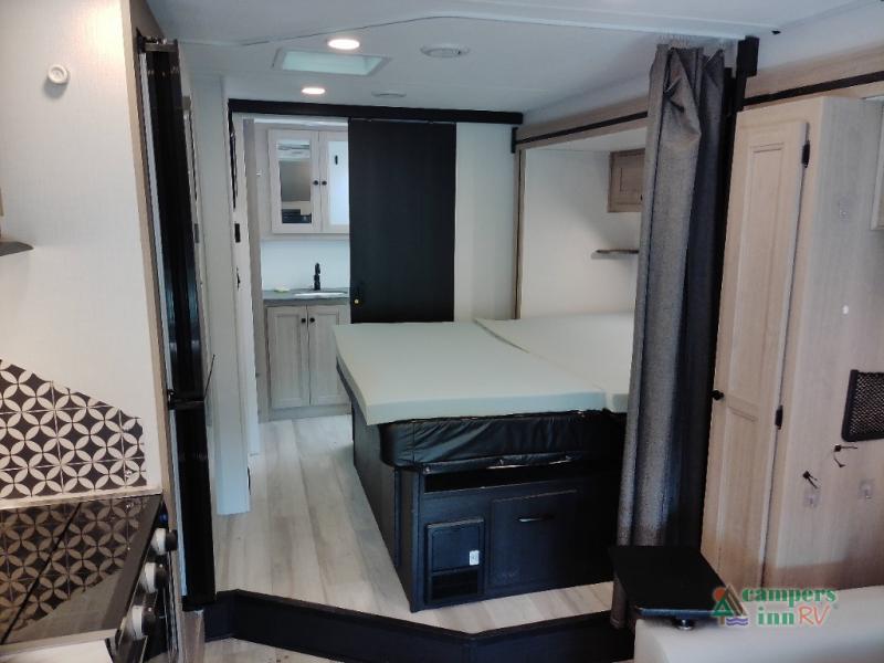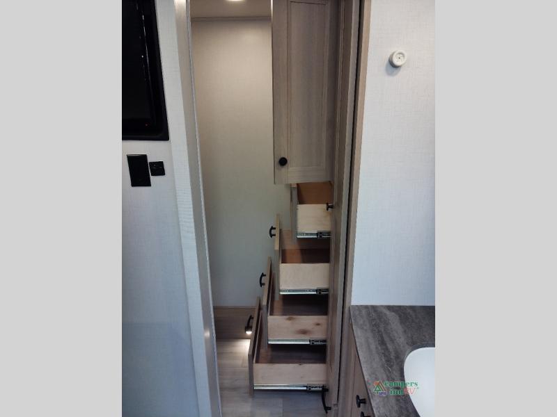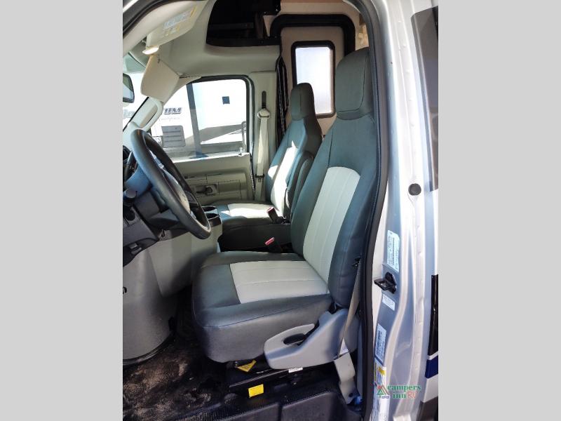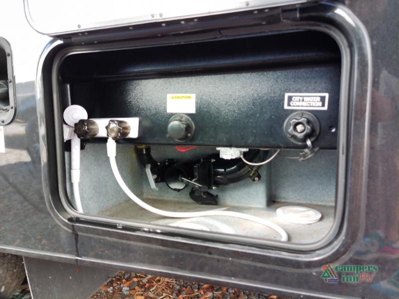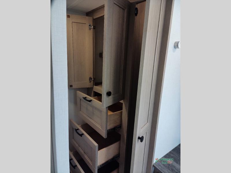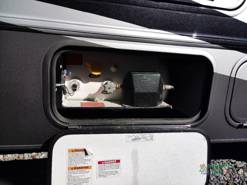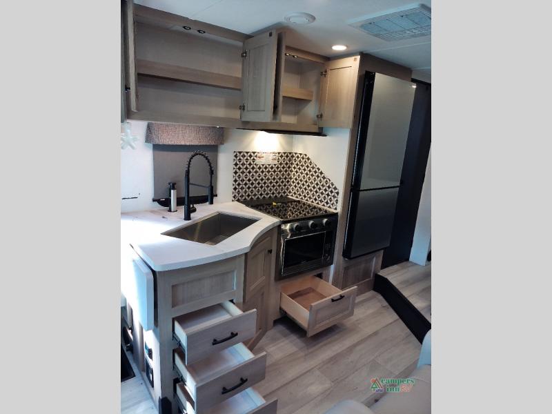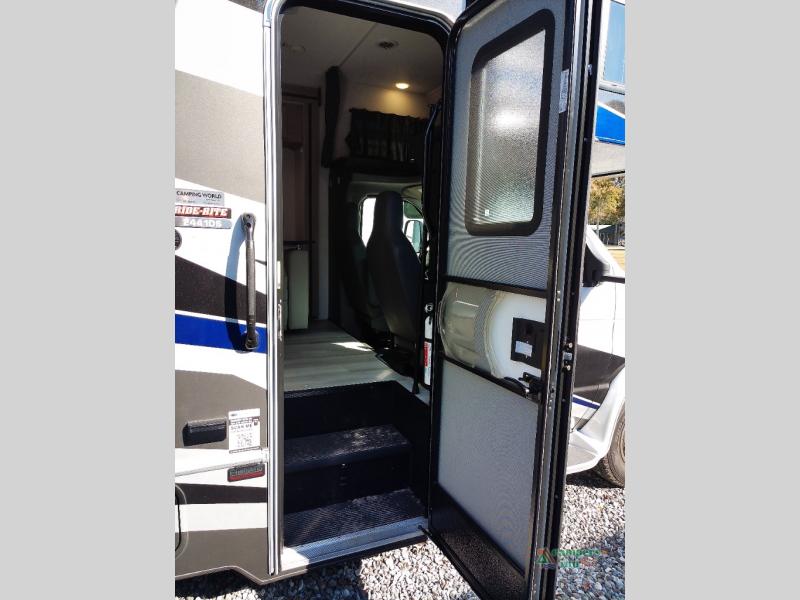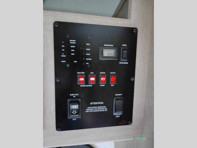 You will feel right at home traveling in this motorhome! The full rear bathroom has a 24" x 36" shower to freshen up in, plus storage space and a private toilet so you both can use this room at once. Inside the bedroom is a 60" x 74" queen bed slide with a wedge mattress for more space, and a 12V TV for movies in bed. Prepare your best meals with the three burner cooktop and the 10.7 cu. ft. 12V refrigerator or throw some leftovers in the undermount 1.3 cu. ft. convection microwave, then enjoy it at the U-shaped dinette slide. The 60" x 80" bunk over cab mat offers a comfortable place to sleep but if you don't need the extra sleeping space, you can switch it out for the optional Trekker cap with a built-in entertainment center, plus there is an optional outside 12V TV to add!