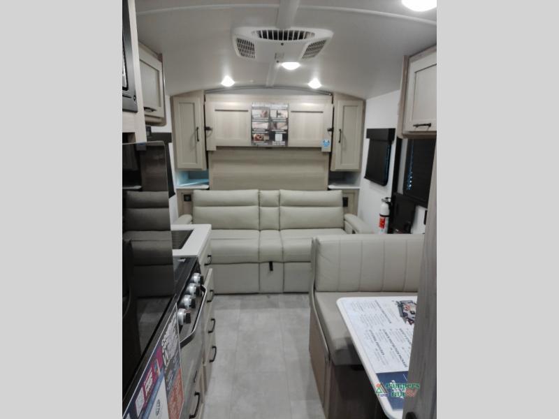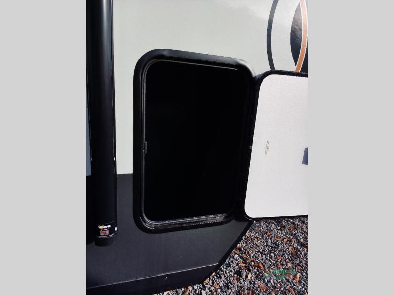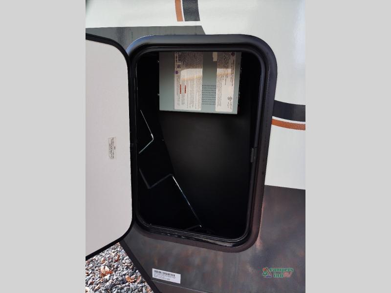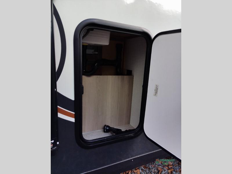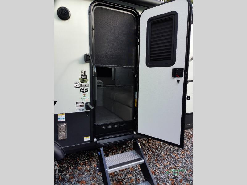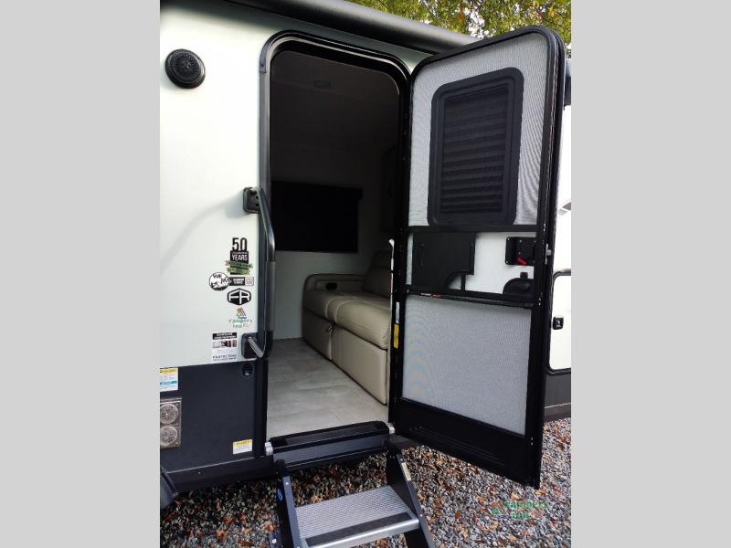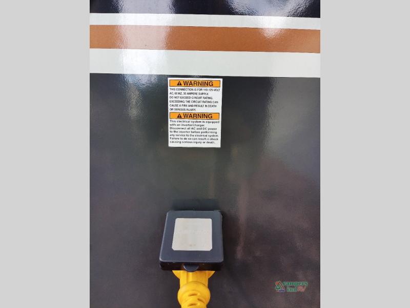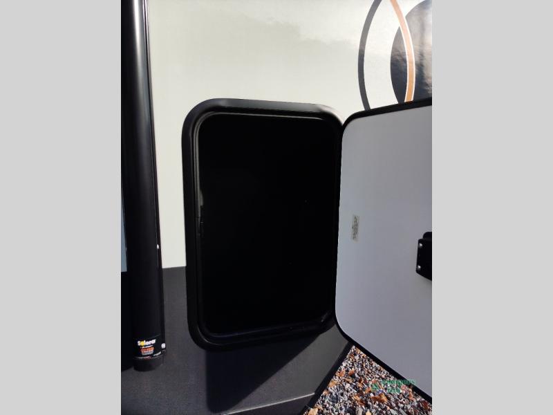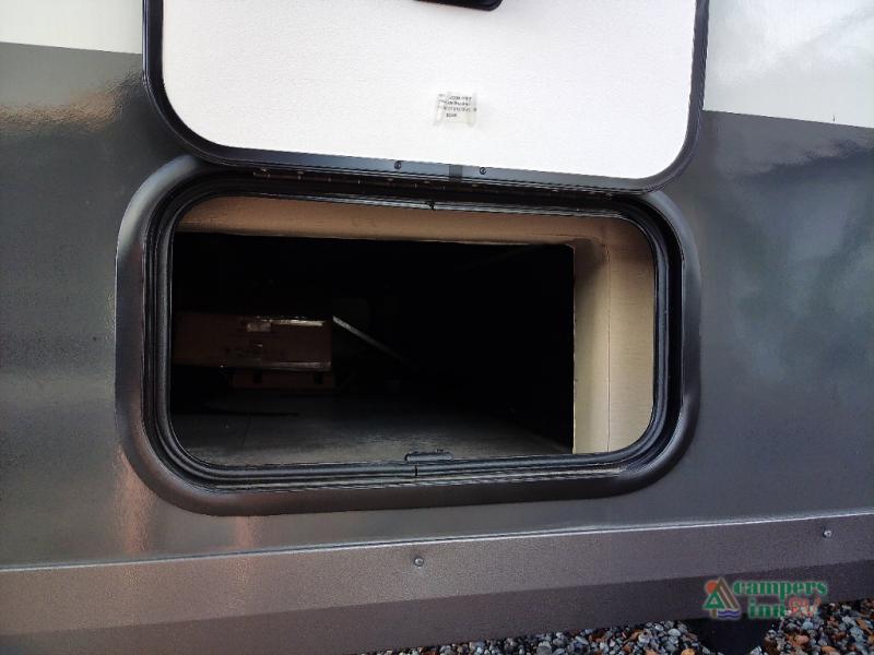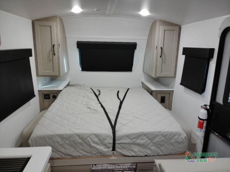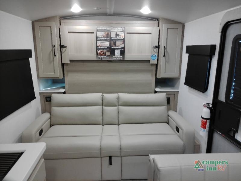 You will love how versatile this travel trailer is thanks to the Murphy bed up front. After you've had a great night's rest, just fold it up to relax on the 72" sofa. This will give the chef more space in the morning to prepare breakfast on the three burner cooktop or in the microwave oven. There is a 32" booth dinette to dine at, or you may just want to take your plate outdoors under the 14' power awning. The full rear bath includes a large linen closet to store clean towels and there is a Showermiser Water Saver you are sure to appreciate. You will appreciate a pass-through storage, plus additional exterior storage so you can bring along hiking gear, water tubes, and fishing poles! The optional Power Package available on this model includes three 200W solar panels, an 11,000 BTU Coleman Mach soft start A/C, two smart remotes, and more off-grid features!