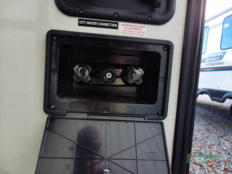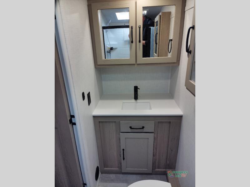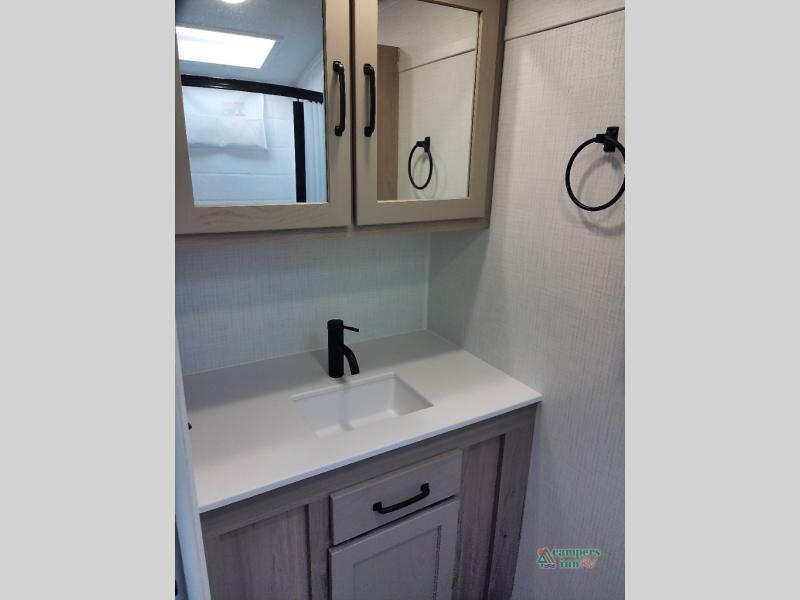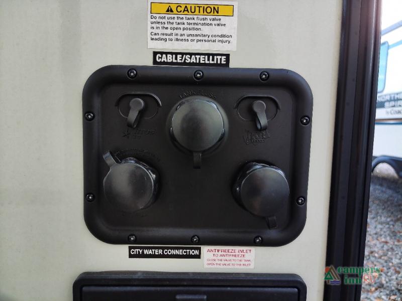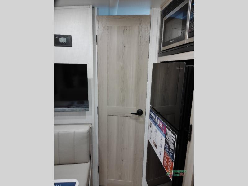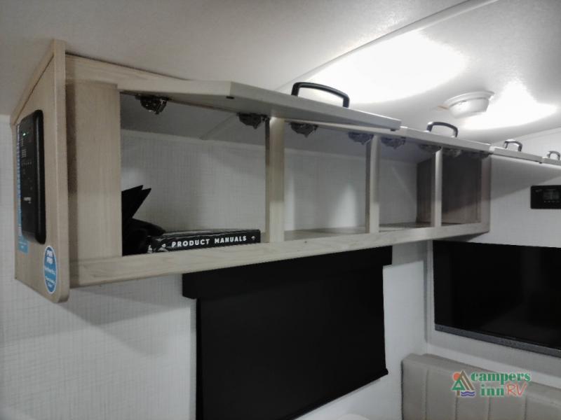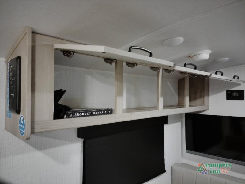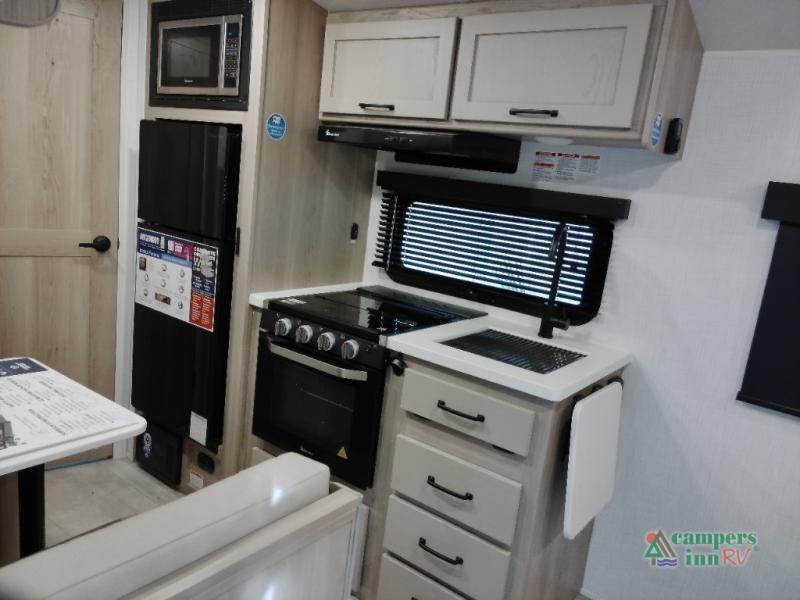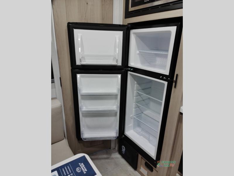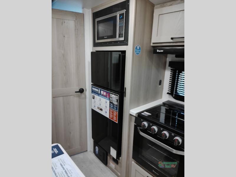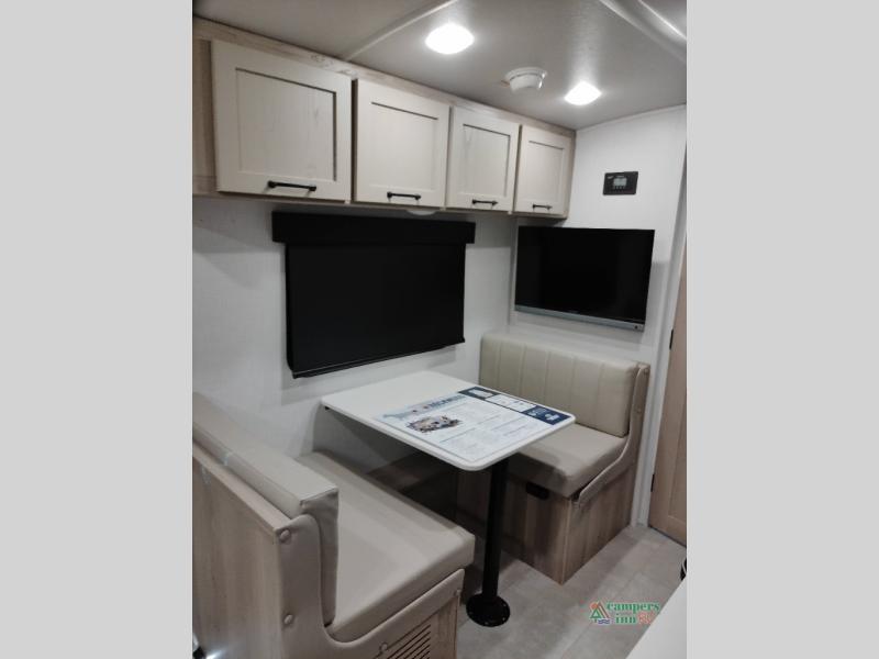 You will love how versatile this travel trailer is thanks to the Murphy bed up front. After you've had a great night's rest, just fold it up to relax on the 72" sofa. This will give the chef more space in the morning to prepare breakfast on the three burner cooktop or in the microwave oven. There is a 32" booth dinette to dine at, or you may just want to take your plate outdoors under the 14' power awning. The full rear bath includes a large linen closet to store clean towels and there is a Showermiser Water Saver you are sure to appreciate. You will appreciate a pass-through storage, plus additional exterior storage so you can bring along hiking gear, water tubes, and fishing poles! The optional Power Package available on this model includes three 200W solar panels, an 11,000 BTU Coleman Mach soft start A/C, two smart remotes, and more off-grid features!