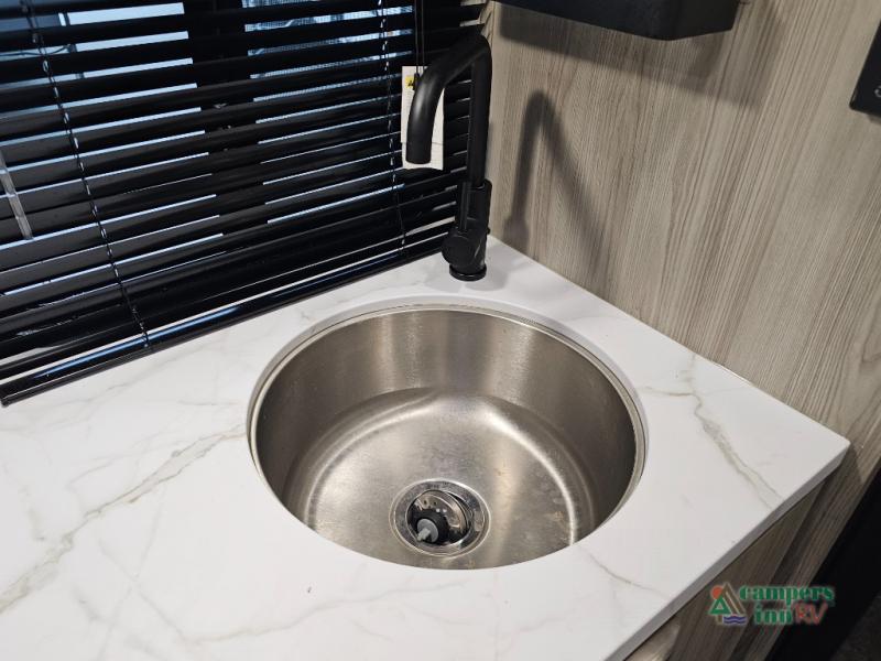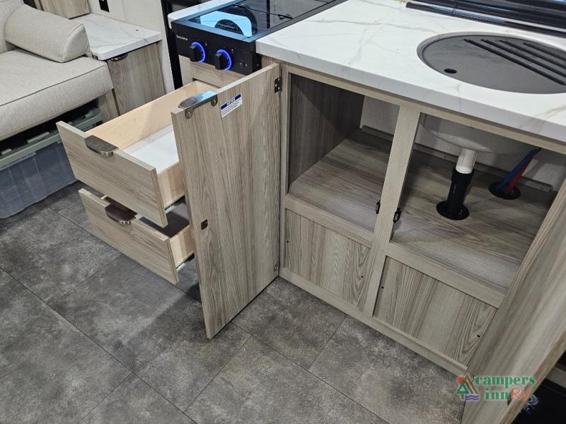 Two-burner cooktop, microwave, and deep single-basin sink for effortless meal prep