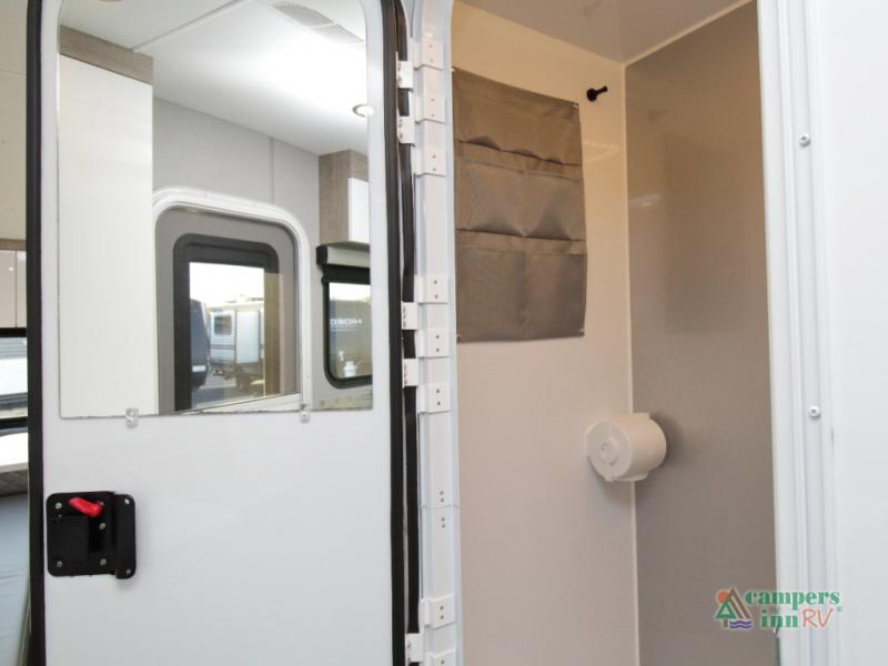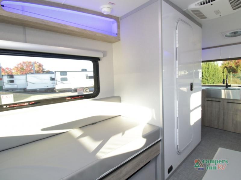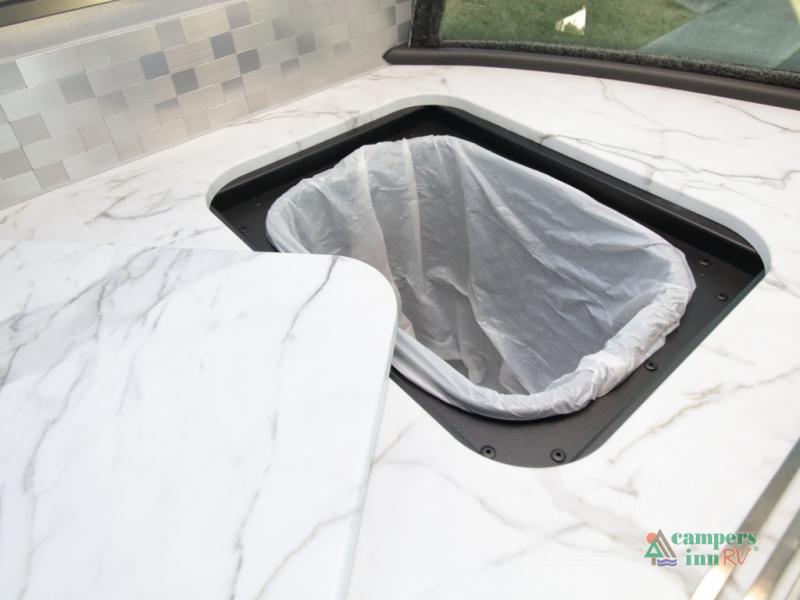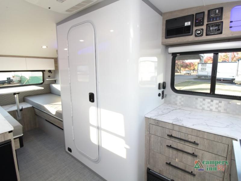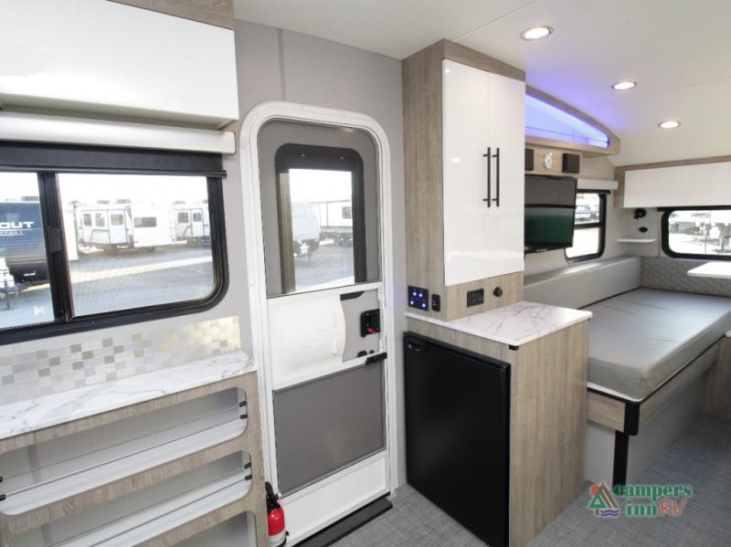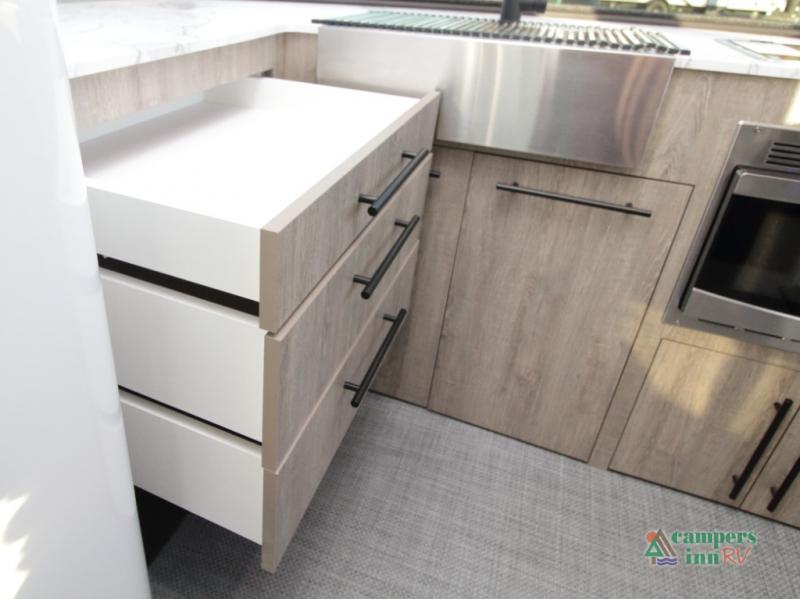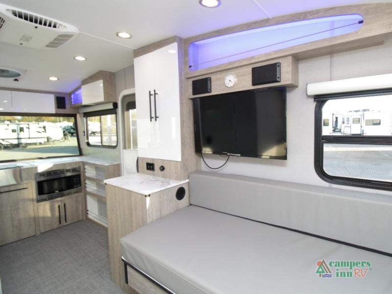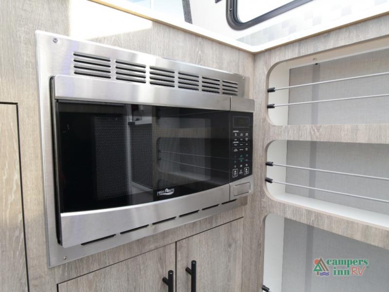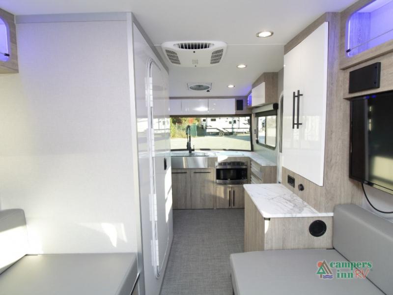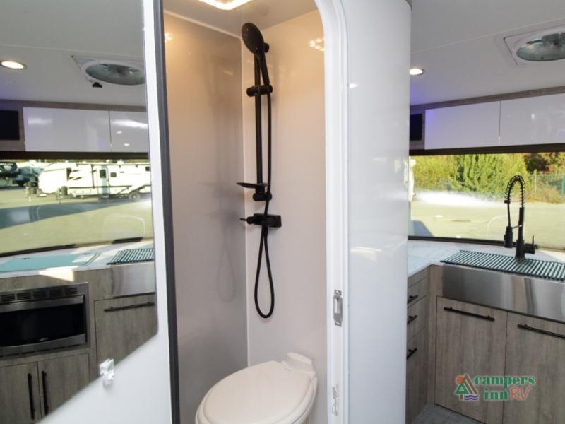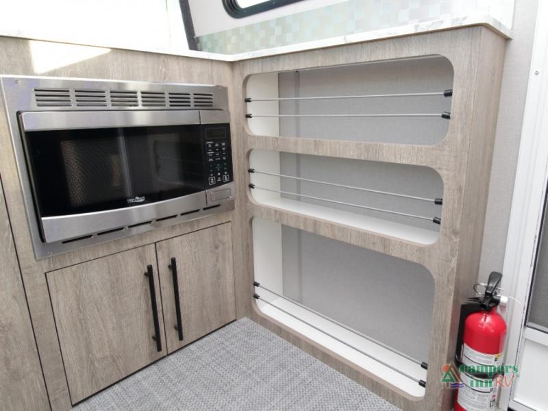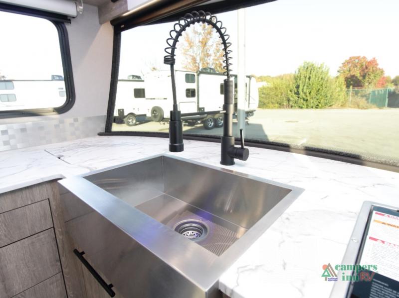 Front Kitchen Layout – Enjoy a thoughtfully designed kitchen featuring a large farmhouse-style sink, stainless steel microwave, and plenty of counter and storage space for preparing meals on the road.