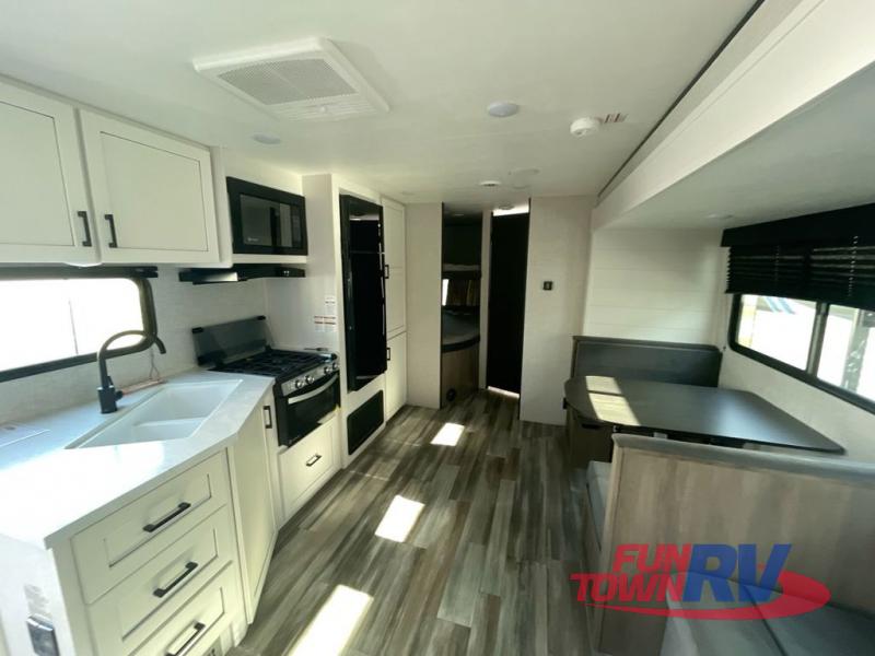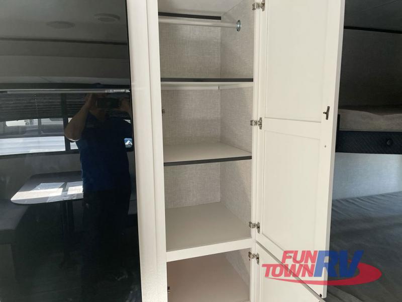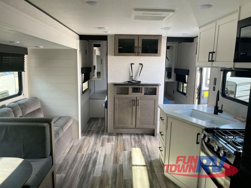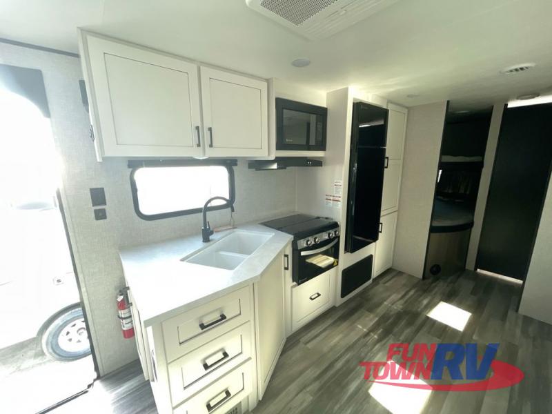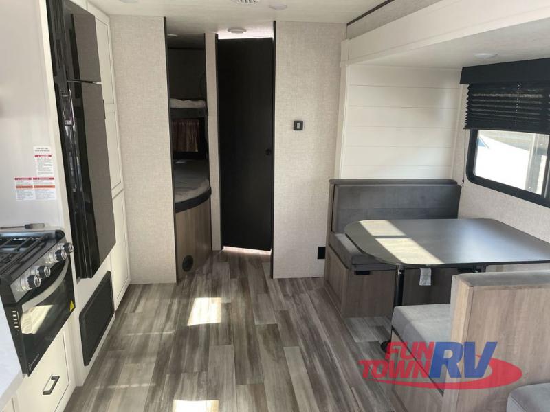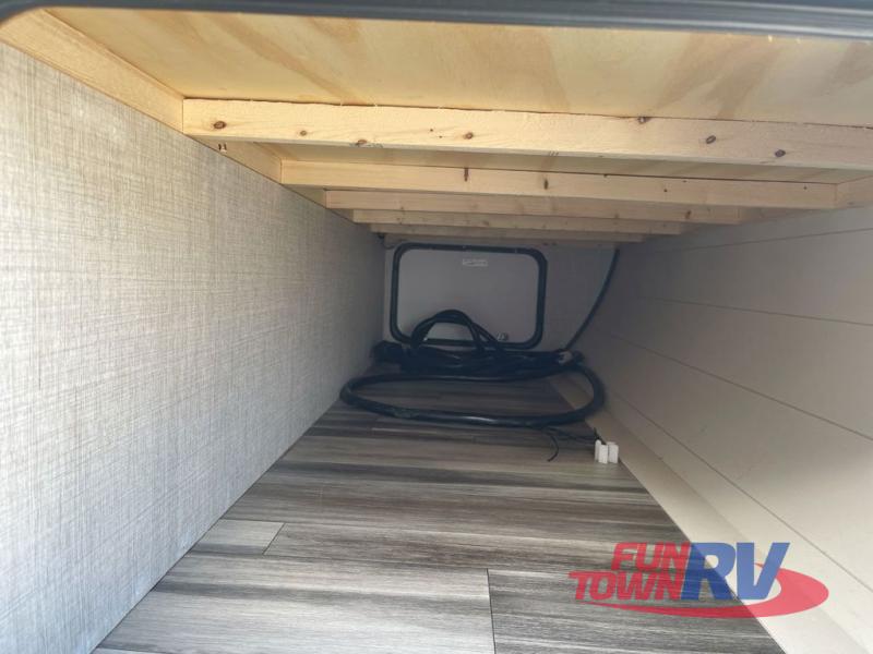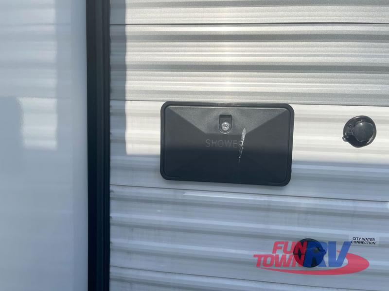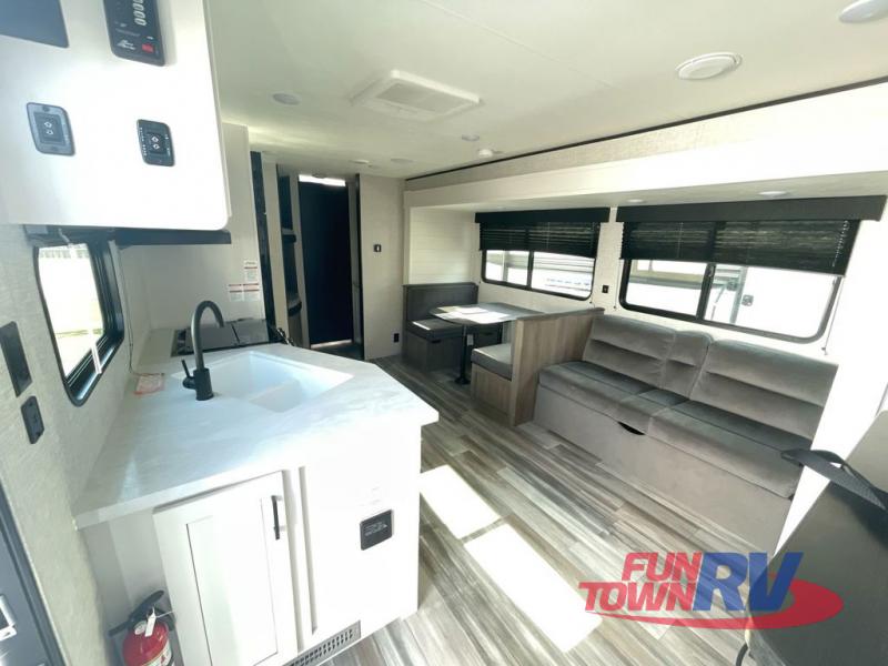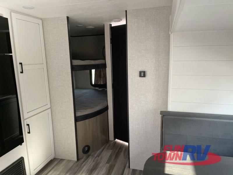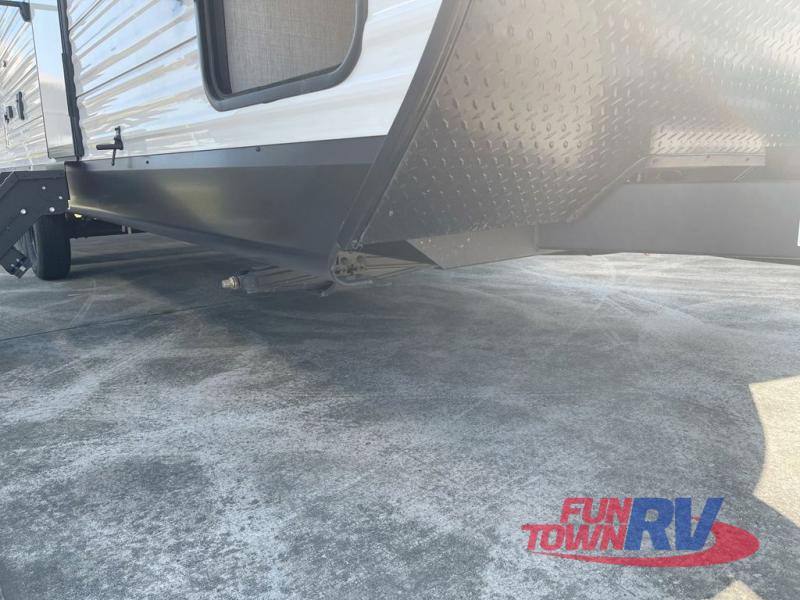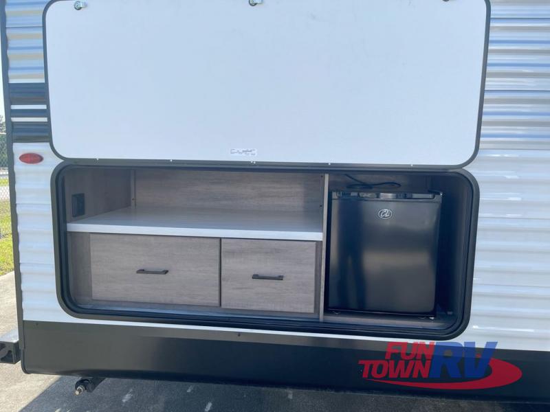 You can comfortably sleep up to ten people in this trailer thanks to the double-size bunks in back, the RV queen bed in the front bedroom, plus the booth dinette and jack-knife sofa in the main living area! The chef of your crew will have a three burner cooktop and microwave oven to prepare meals, and everyone can store their favorite drinks in the 8 cu. ft. 12V refrigerator inside, or in the outdoor refrigerator for convenience. The rear corner bathroom includes a tub/shower and a toilet, with the sink just outside of this room so others can brush their teeth if one is taking a shower before bed. The outside storage is accessible on both sides of the unit and will easily allow you bring along camp chairs, yard games and more. A 16' powered awning with LED lights will create a nice place to gather in the evenings with family and friends!
