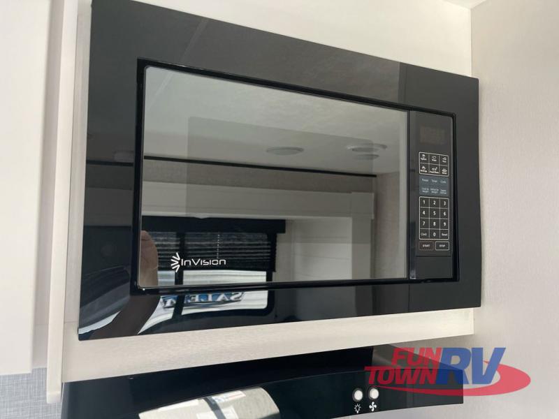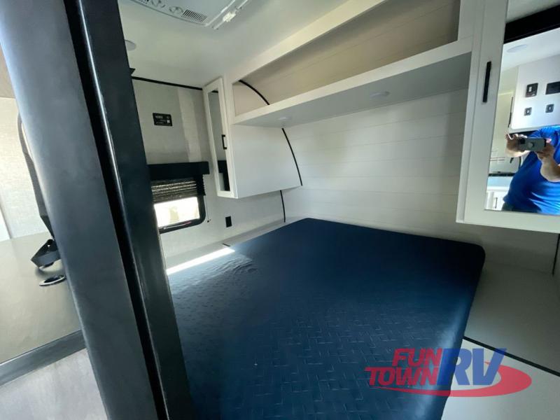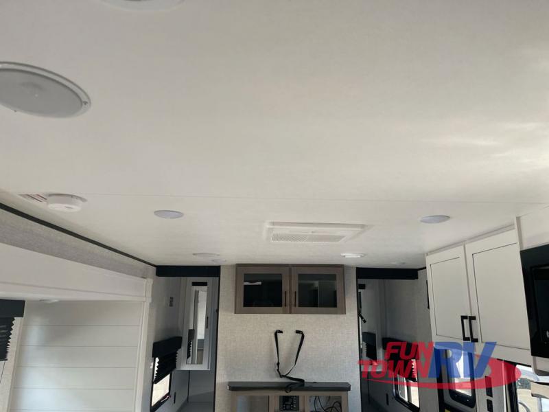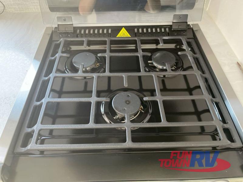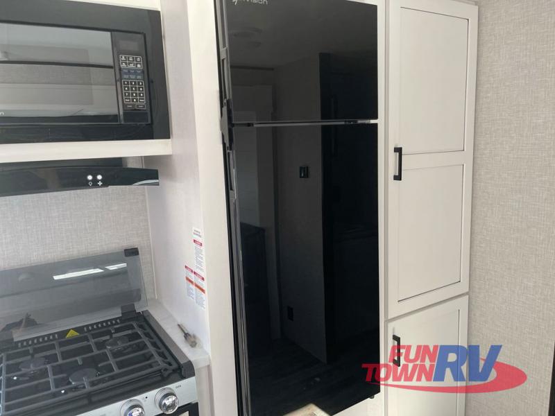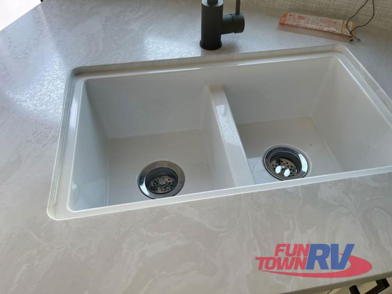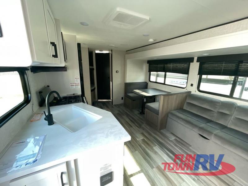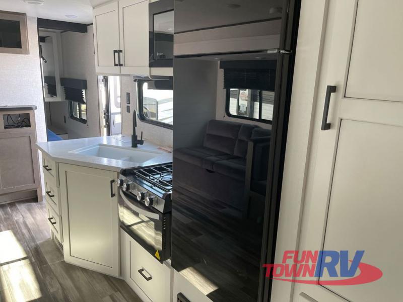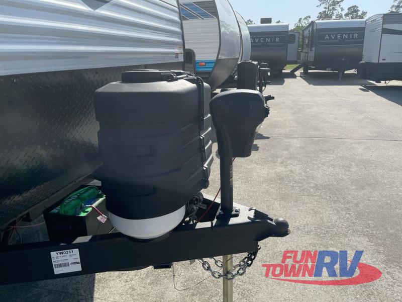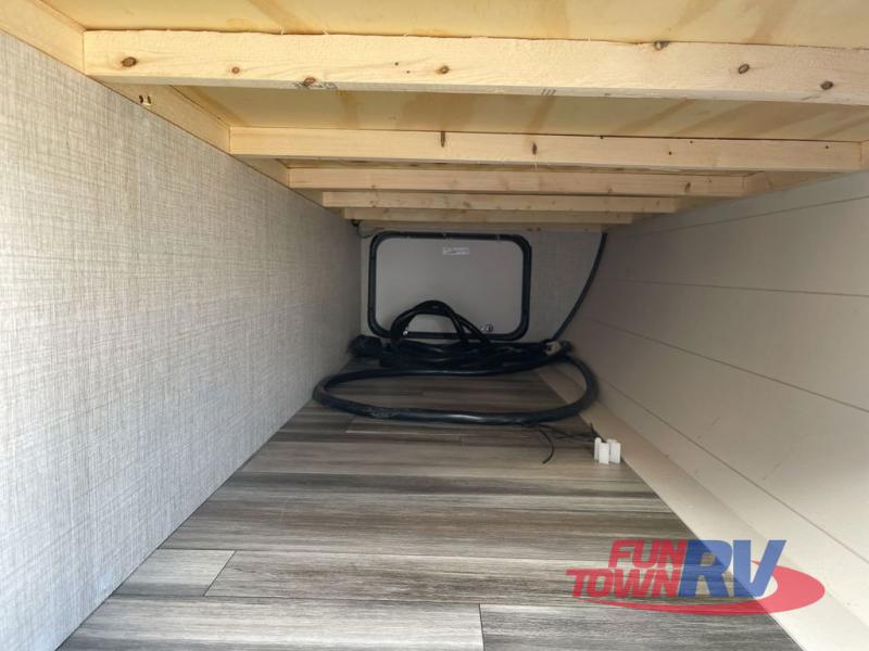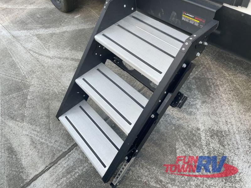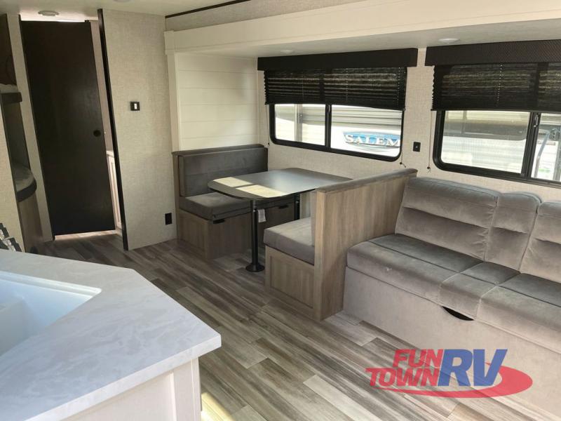 You can comfortably sleep up to ten people in this trailer thanks to the double-size bunks in back, the RV queen bed in the front bedroom, plus the booth dinette and jack-knife sofa in the main living area! The chef of your crew will have a three burner cooktop and microwave oven to prepare meals, and everyone can store their favorite drinks in the 8 cu. ft. 12V refrigerator inside, or in the outdoor refrigerator for convenience. The rear corner bathroom includes a tub/shower and a toilet, with the sink just outside of this room so others can brush their teeth if one is taking a shower before bed. The outside storage is accessible on both sides of the unit and will easily allow you bring along camp chairs, yard games and more. A 16' powered awning with LED lights will create a nice place to gather in the evenings with family and friends!