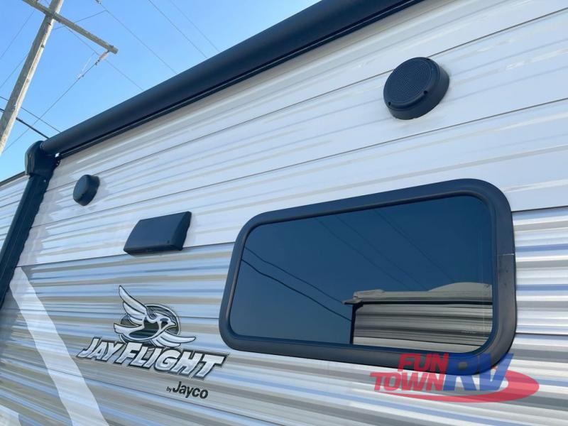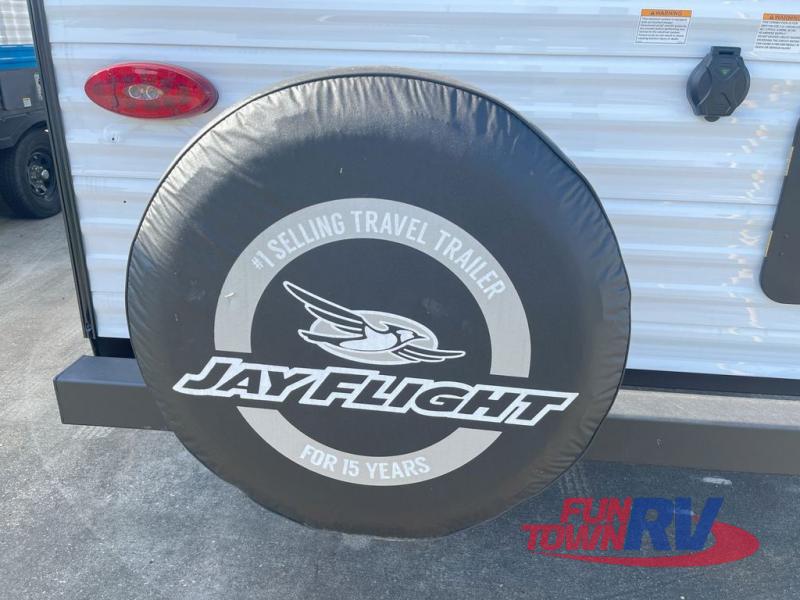 The Jayco Jay Flight SLX travel trailer is quite easy to own because it is lightweight for an easier towing experience. Built on a fully integrated A-frame with galvanized-steel, impact-resistant wheel wells, the Jay Flight SLX has quality at its very foundation. That quality continues on to the electric self-adjusting brakes, easy-lube hubs, Magnum Truss roof system, and LP quick connect. Some of what the mandatory Customer Value Package includes is backup camera prep, Keyed-Alike entry and baggage doors, marine grade exterior speakers, and an on-demand tankless water heater.
