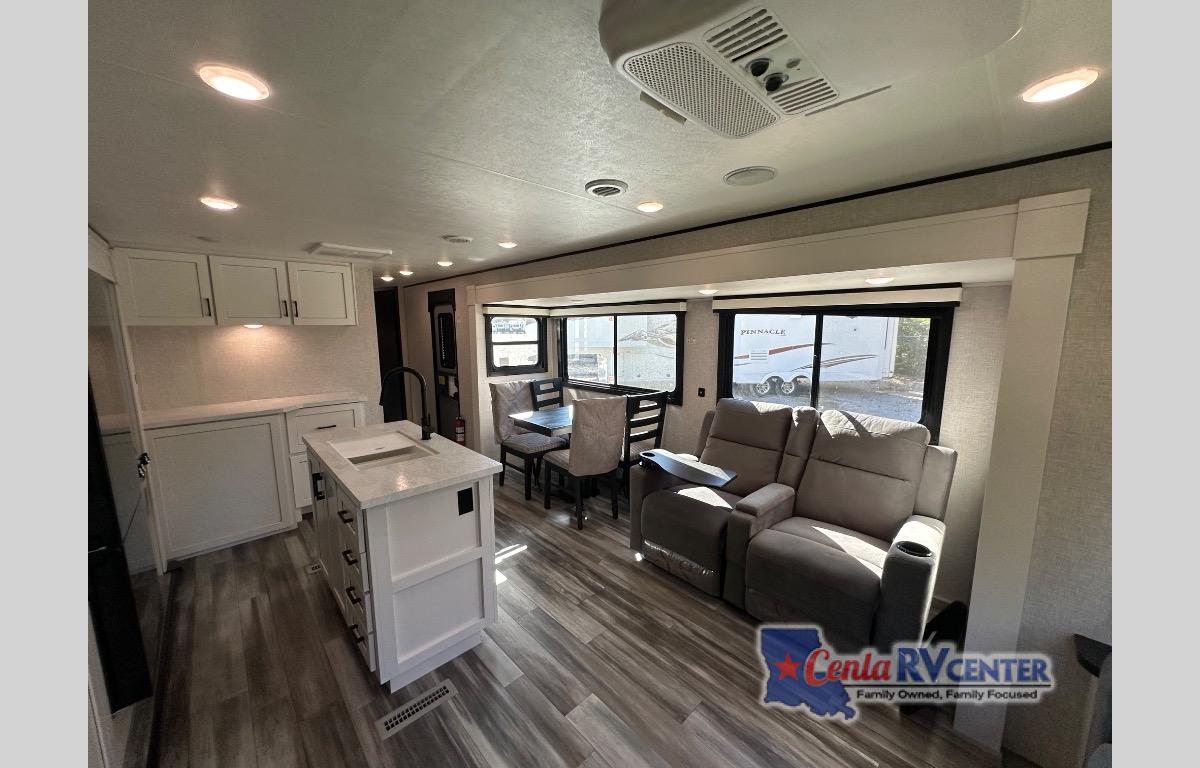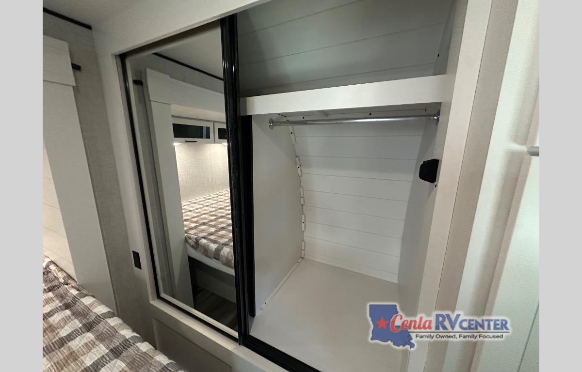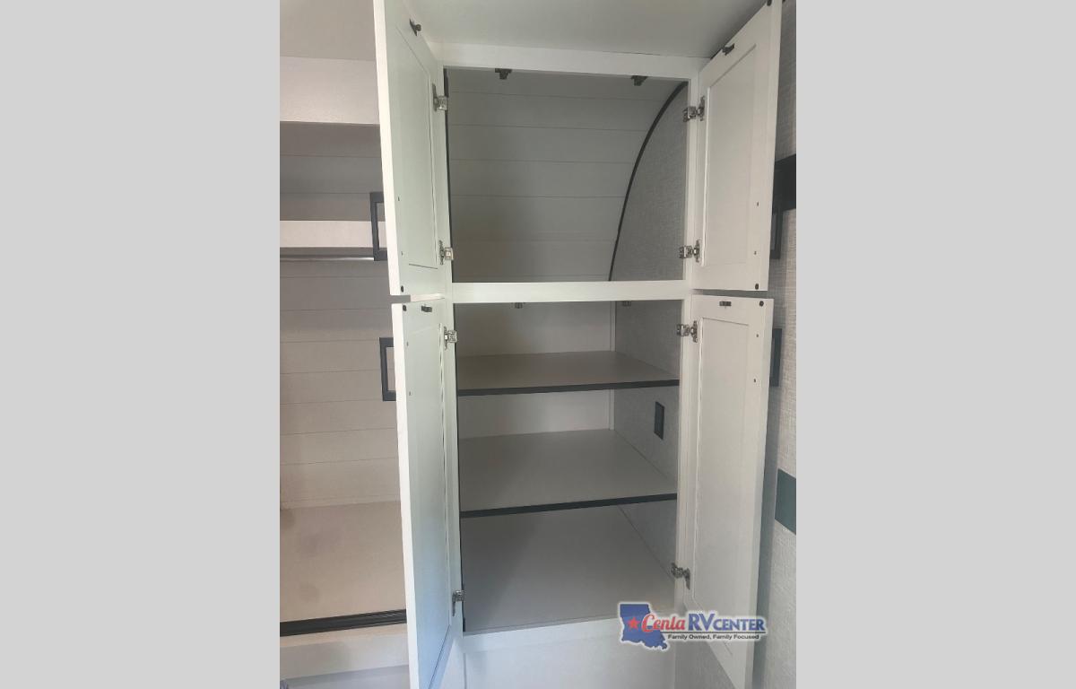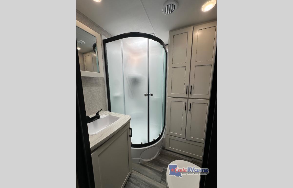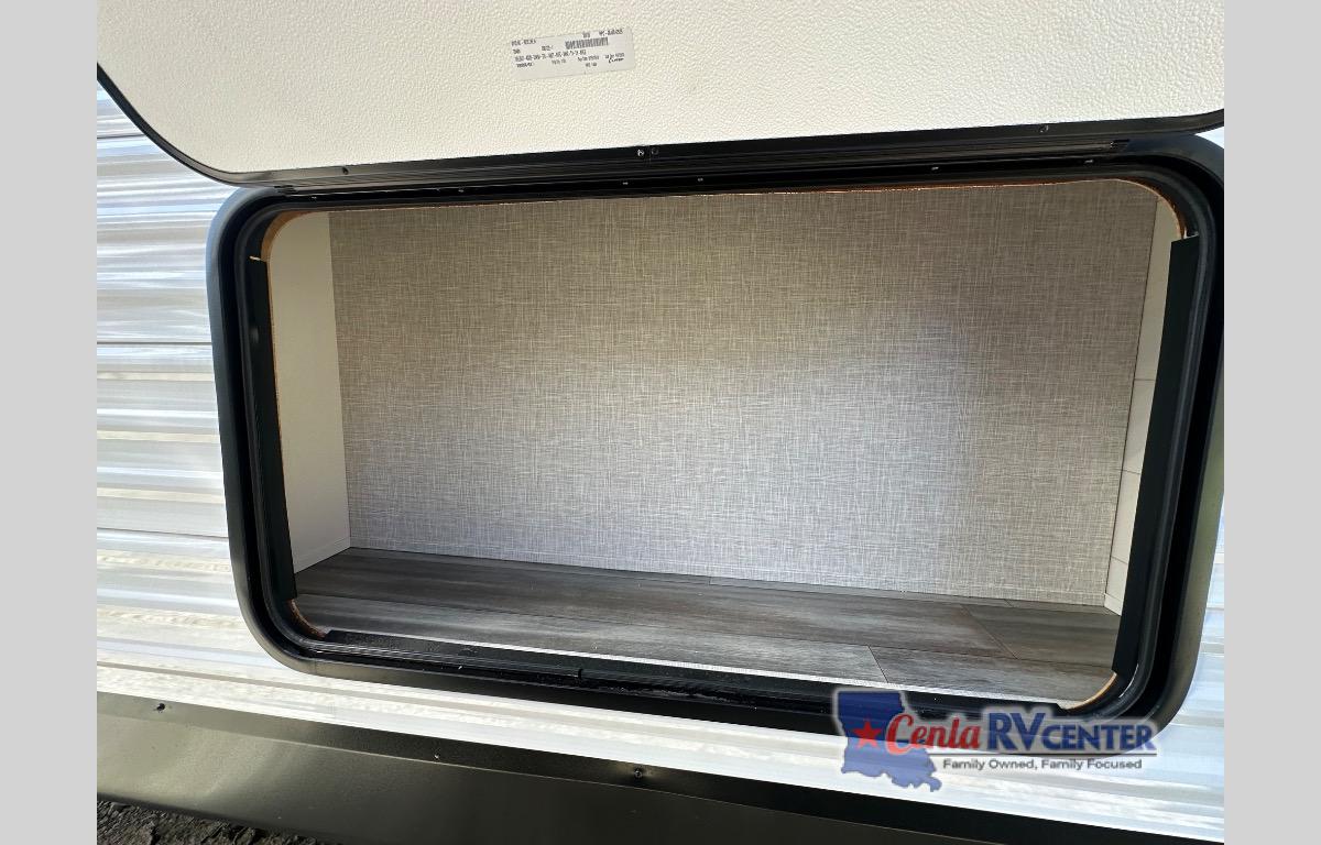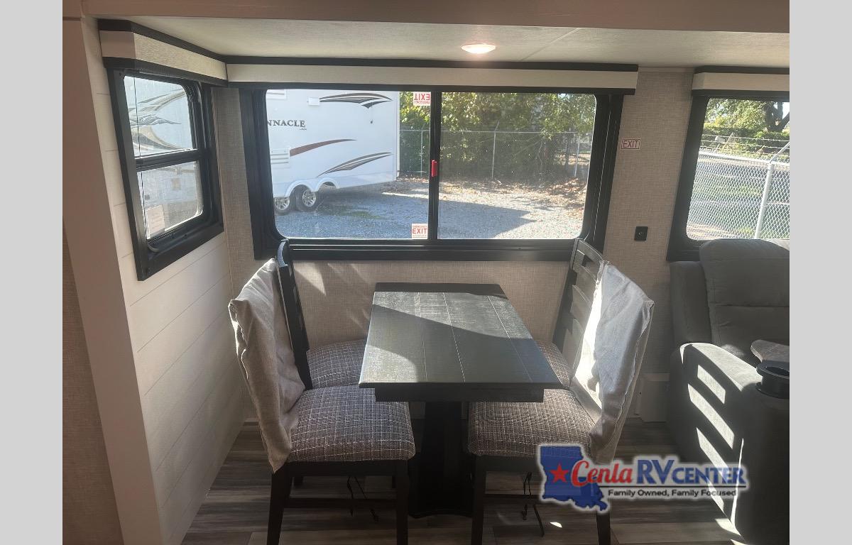 Enjoy a relaxing weekend getaway in this travel trailer! The dual entry bathroom with radius shower creates a front master suite with a queen bed slide, a dresser, and a front large wardrobe with storage space plus washer and dryer prep. The chef will have an easy time preparing their best home cooked meals with the kitchen island, hutch, three burner cooktop, and 12V refrigerator. Enjoy your meals at the booth dinette then play a card game or transform it into an extra sleeping space. The rear living area has a rear Jack-knife sofa for a quick afternoon nap and theater seating across from the entertainment center with a fireplace for the perfect spot on movie night!