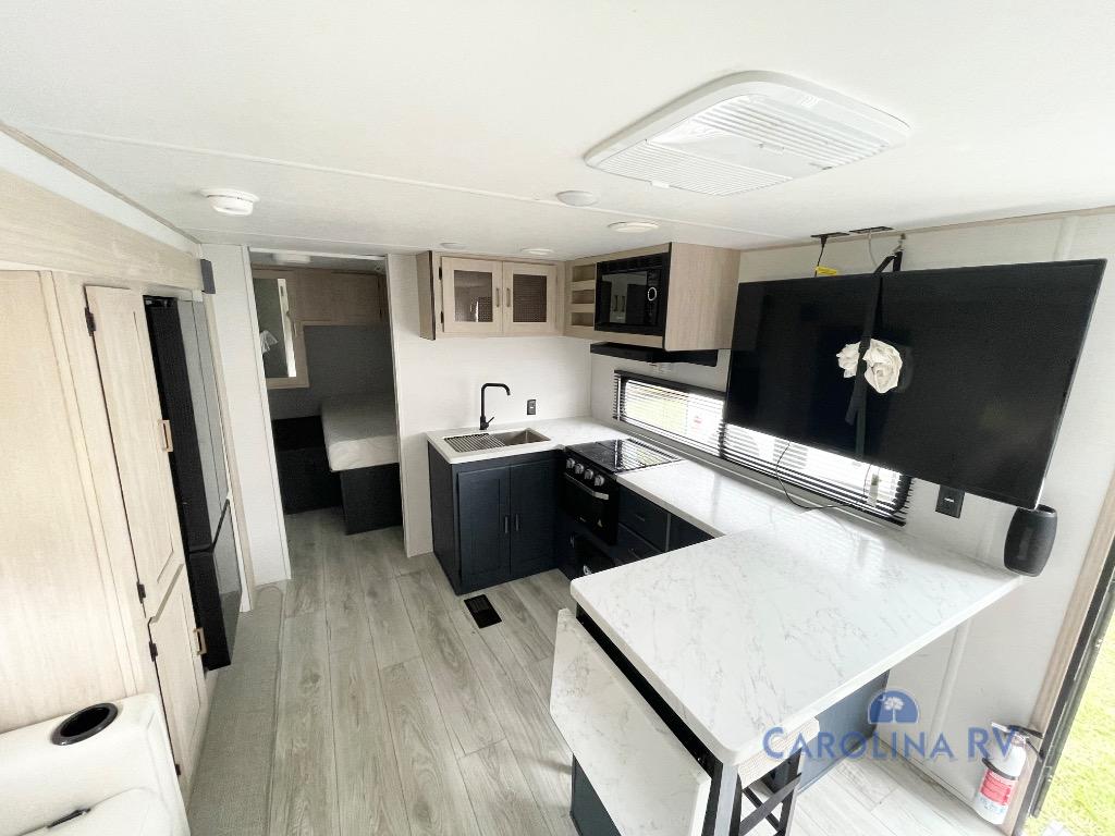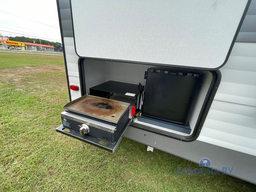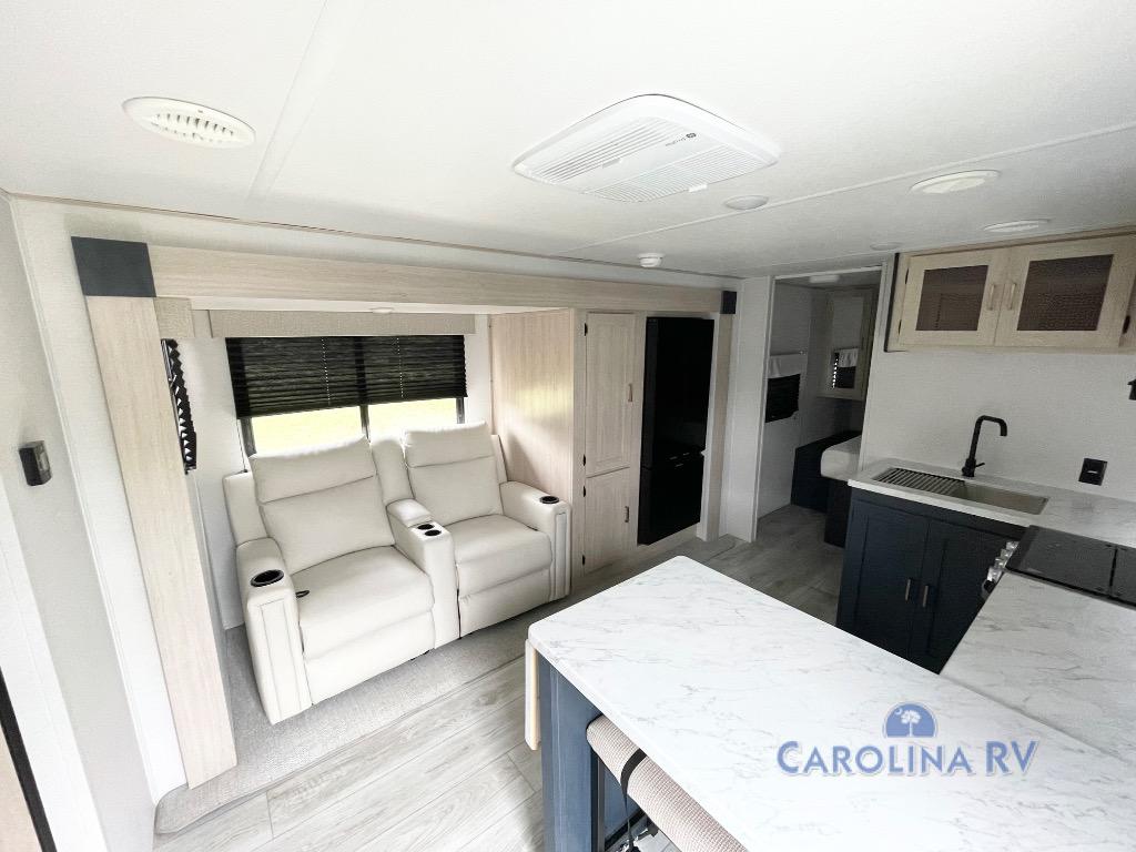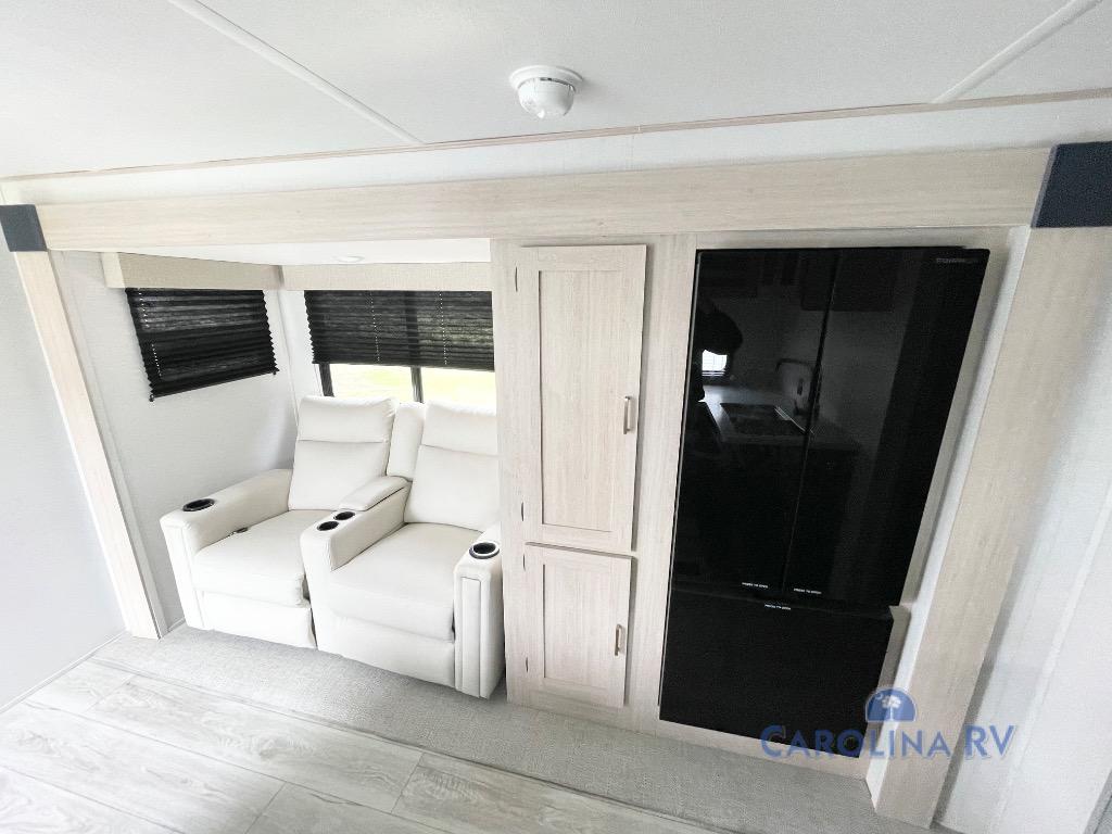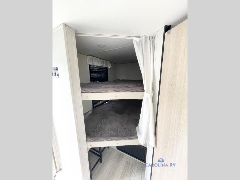 Head to your local state park in this spacious travel trailer! The exterior kitchen is sure to be a big bonus with the chef of your group, and they'll also find a fully-equipped interior kitchen as well. An L-shaped counter with two chairs provides a place to enjoy your morning coffee at, or you may find yourselves on the theater seat within the large slide out. The French door refrigerator and pantry is also found here and can hold all your food for the week. You'll feel right at home in the front private bedroom that includes a queen bed, dual wardrobes, and an overhead cabinet for even more storage, while your guests take the double-size bunks in the back!