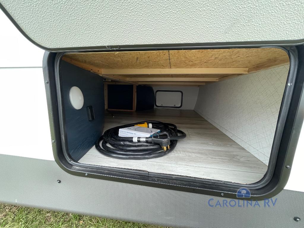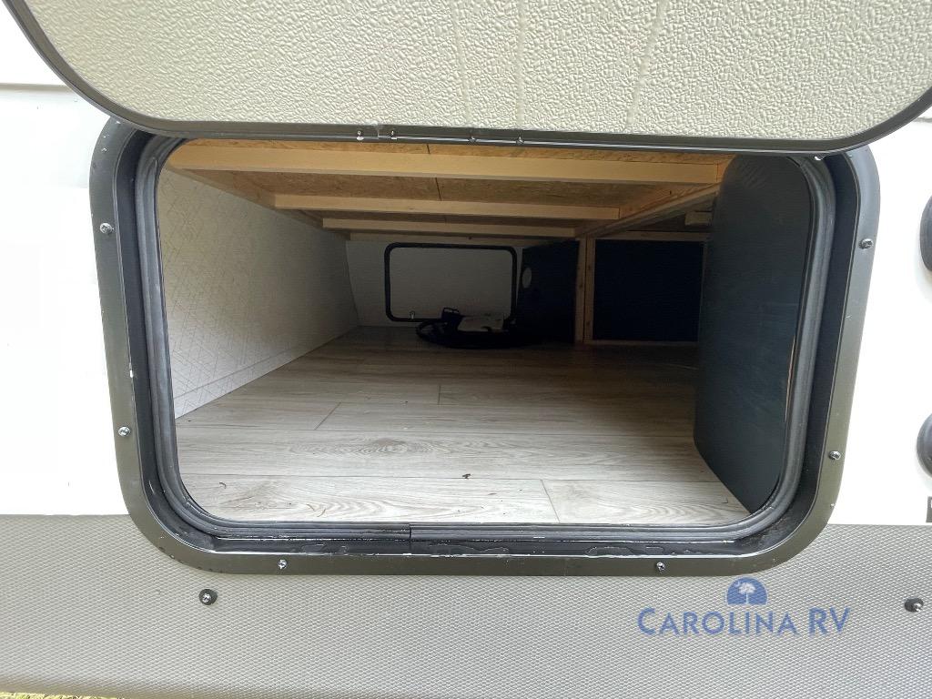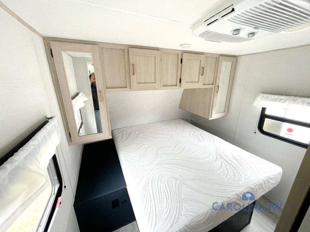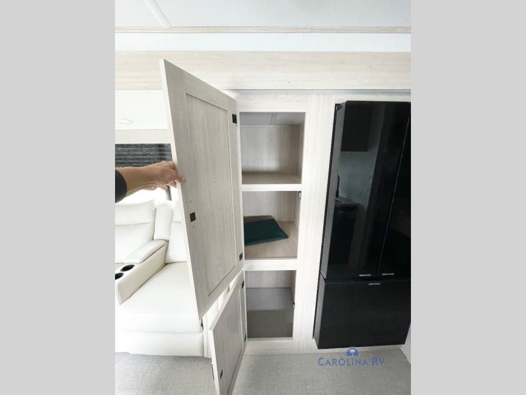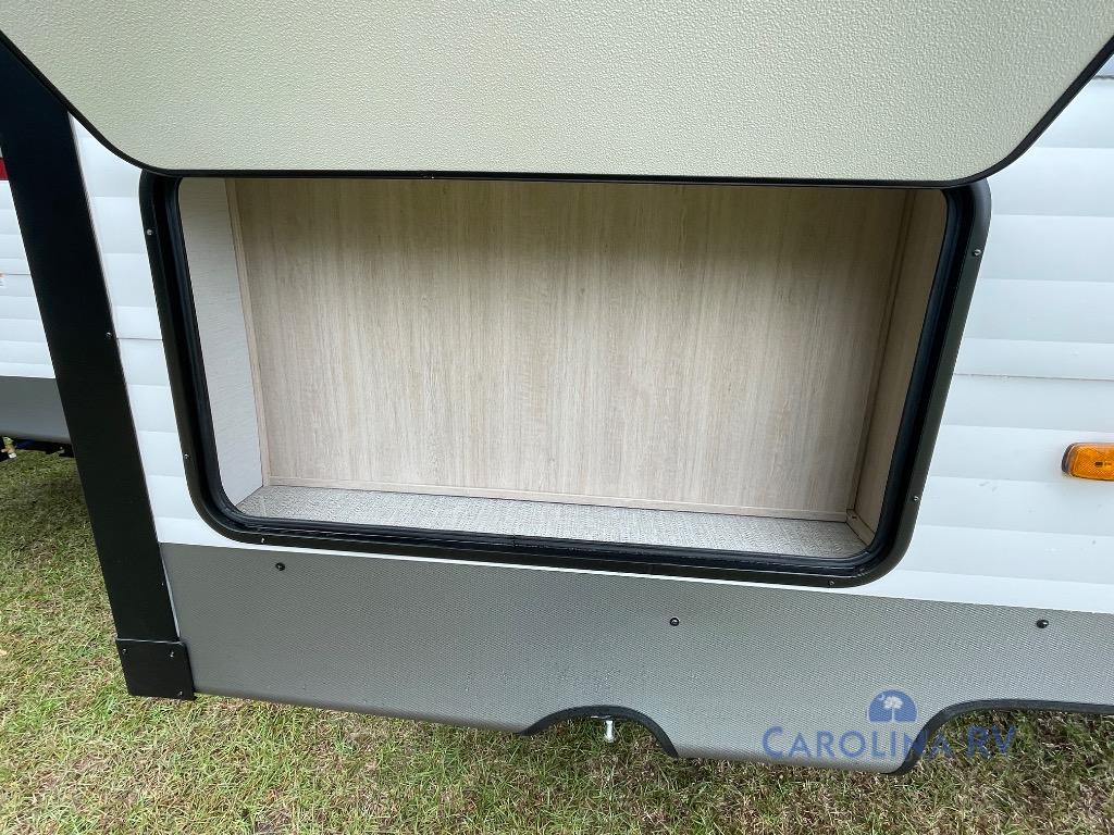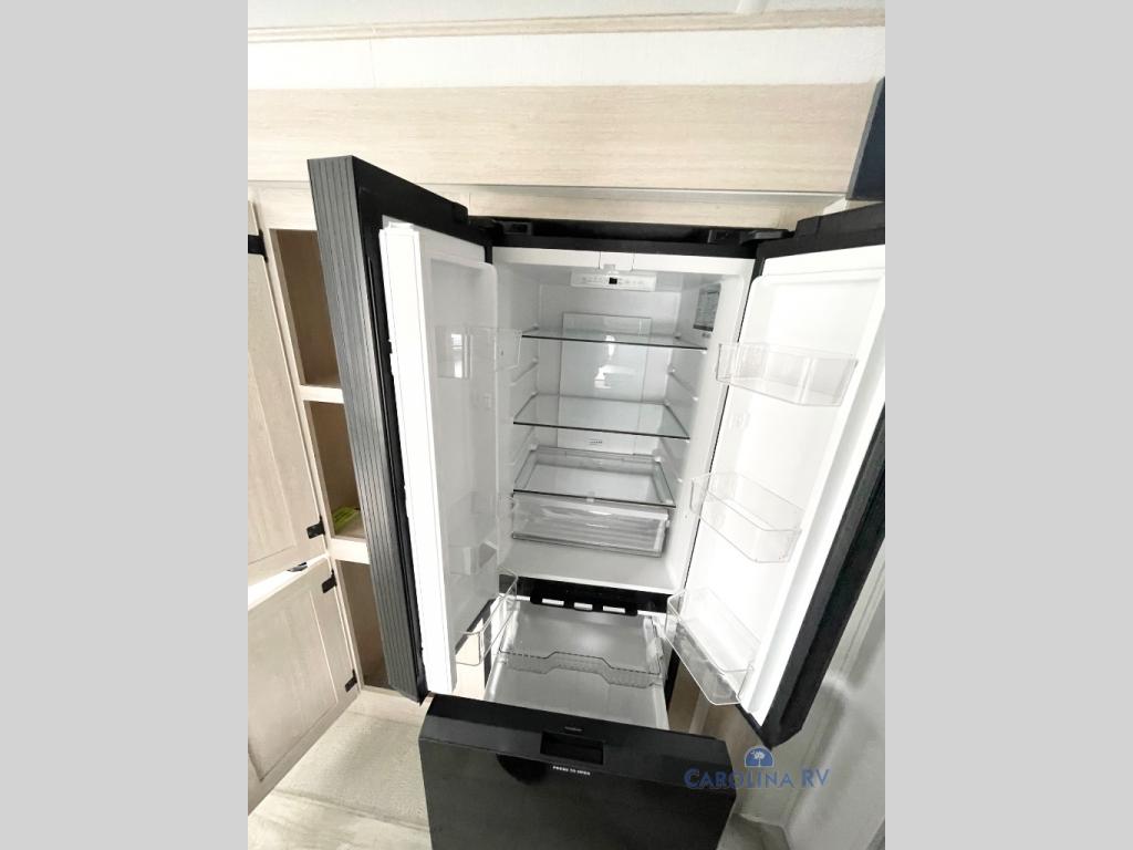 Head to your local state park in this spacious travel trailer! The exterior kitchen is sure to be a big bonus with the chef of your group, and they'll also find a fully-equipped interior kitchen as well. An L-shaped counter with two chairs provides a place to enjoy your morning coffee at, or you may find yourselves on the theater seat within the large slide out. The French door refrigerator and pantry is also found here and can hold all your food for the week. You'll feel right at home in the front private bedroom that includes a queen bed, dual wardrobes, and an overhead cabinet for even more storage, while your guests take the double-size bunks in the back!