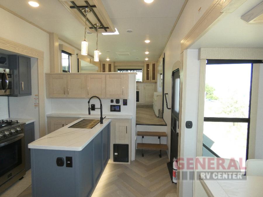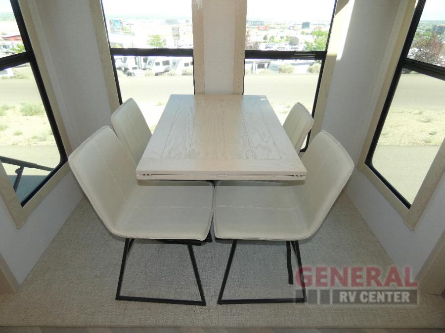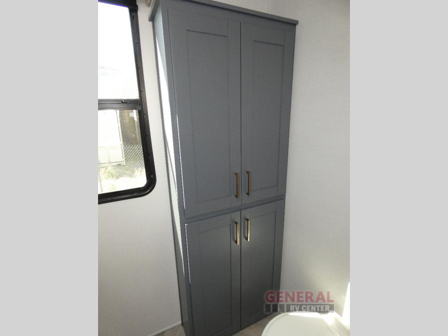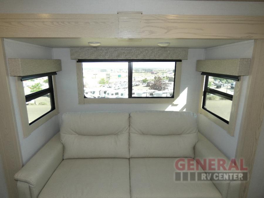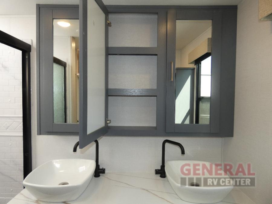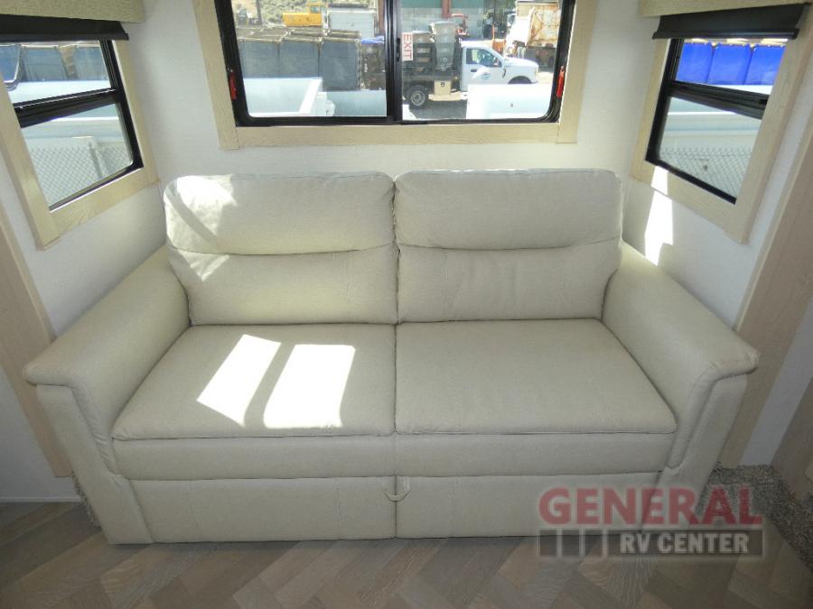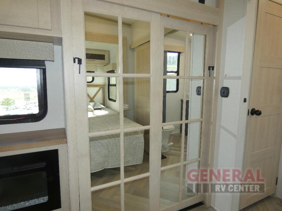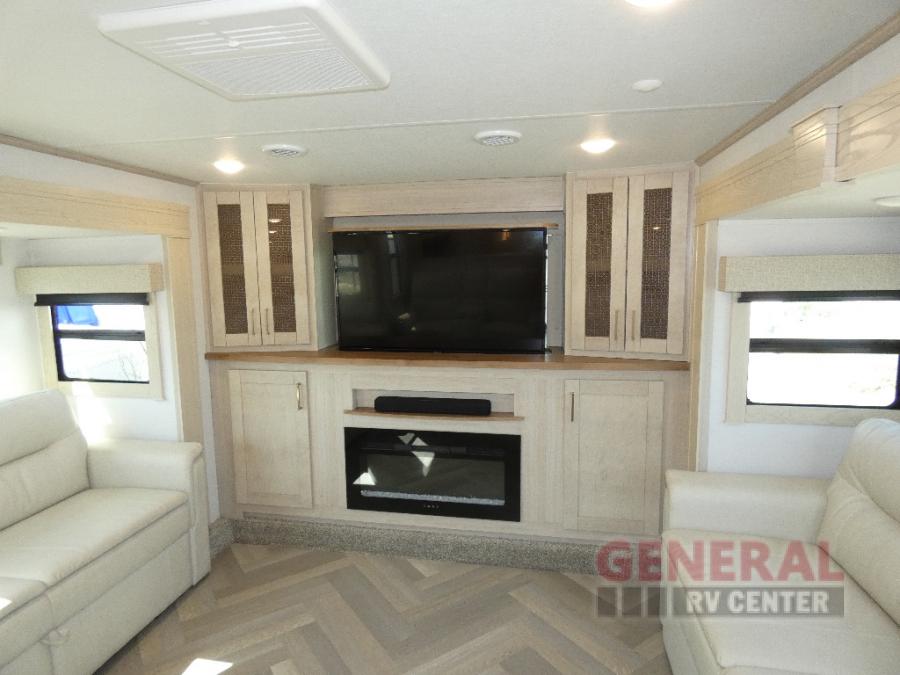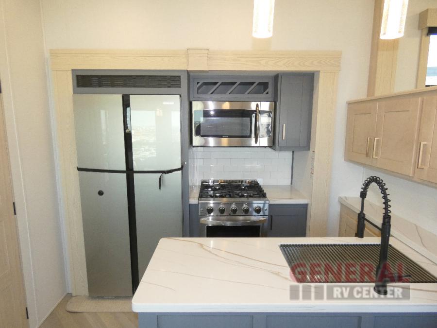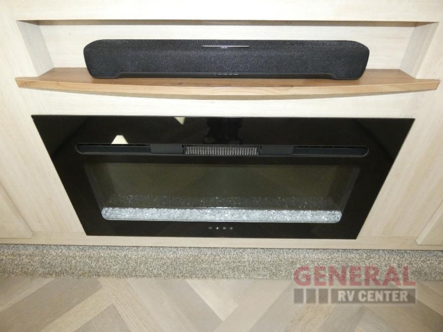 It's a clean decision with a bath and a half to take this fifth wheel on your next adventure! The front living area includes opposing EZ glide couches, 65" theater seating, and a front entertainment with a Smart LED pop up TV and fireplace for a cozy evening indoors. Prepare meals on the four burner cooktop, and leftovers can go in the 16 cu. ft. French door 12V refrigerator. You and your spouse will love the master suite that includes a king bed slide, plenty of storage space, and an entrance into the full rear bathroom with a dual sink vanity. There is even a linen closet with washer and dryer prep if you want to add those appliances!
