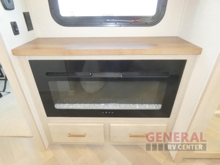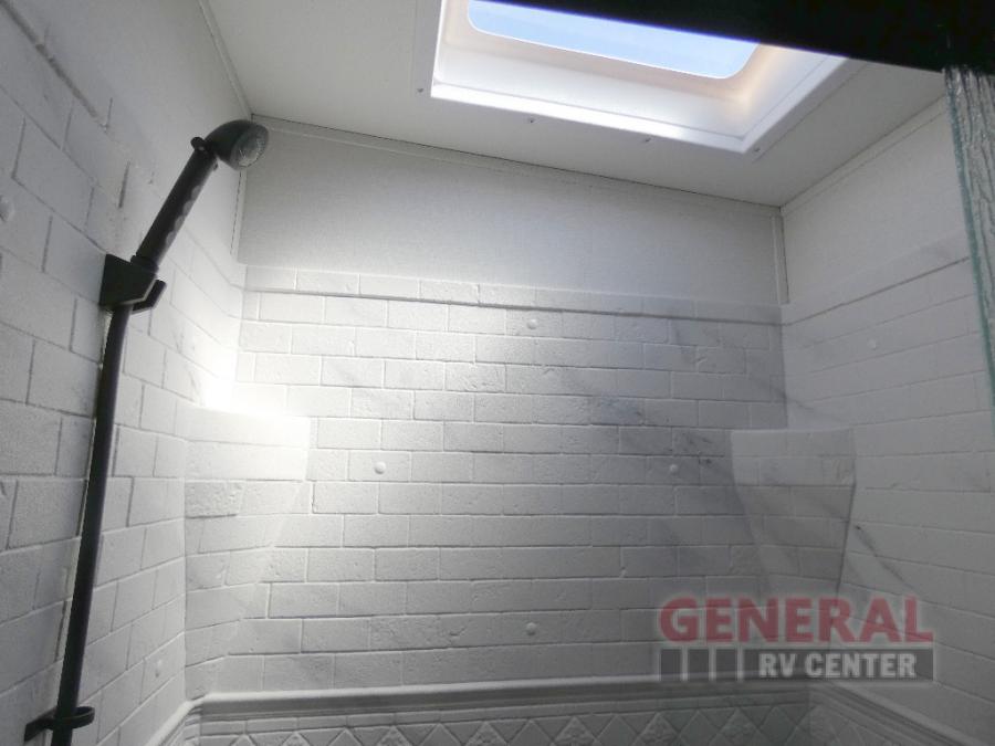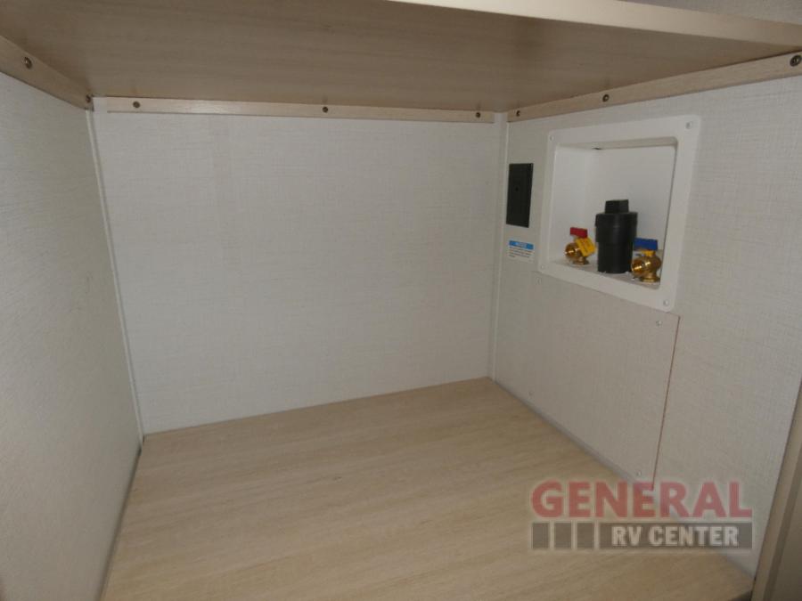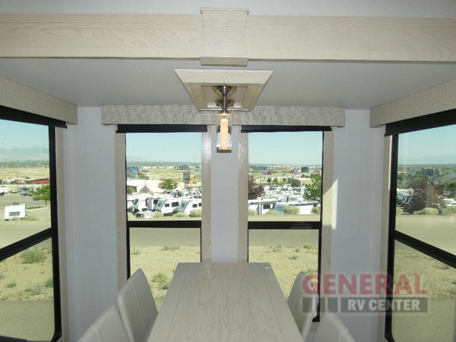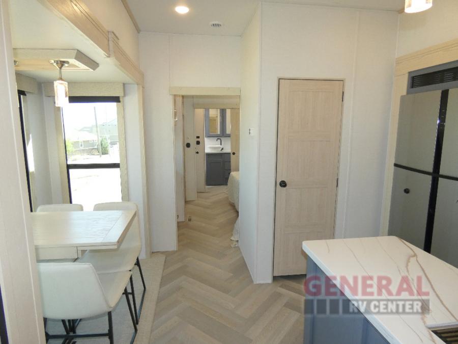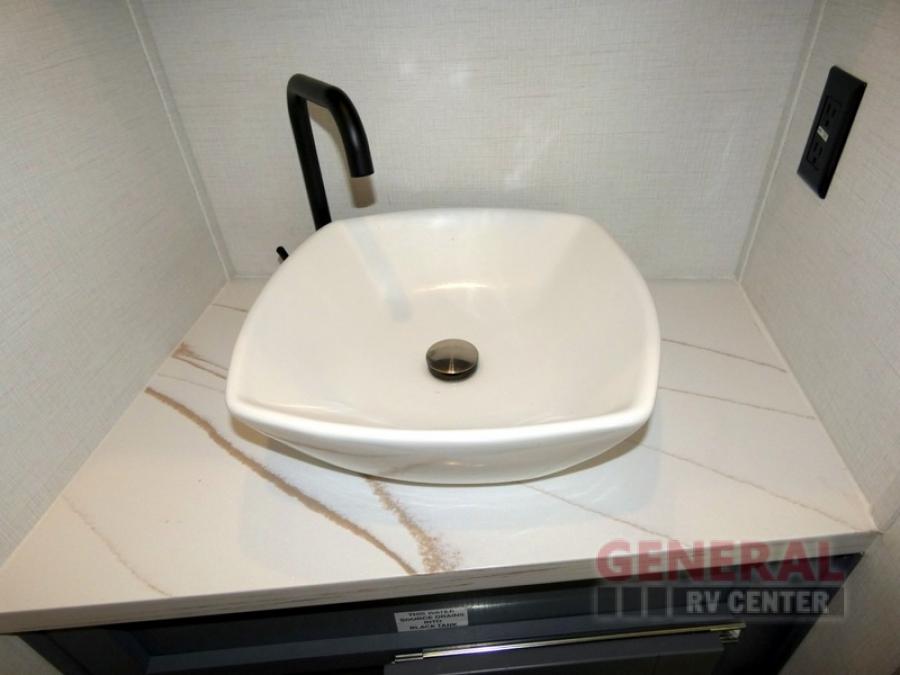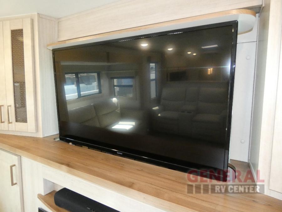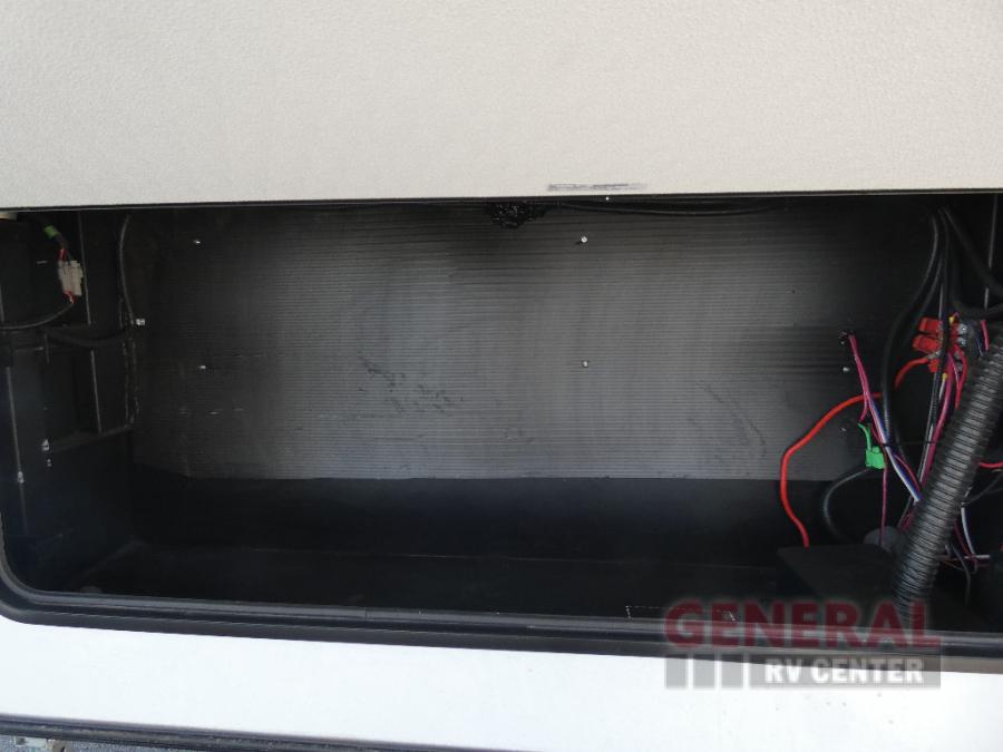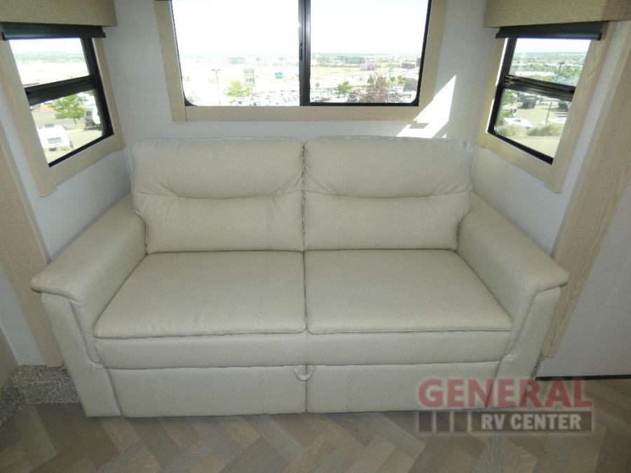 It's a clean decision with a bath and a half to take this fifth wheel on your next adventure! The front living area includes opposing EZ glide couches, 65" theater seating, and a front entertainment with a Smart LED pop up TV and fireplace for a cozy evening indoors. Prepare meals on the four burner cooktop, and leftovers can go in the 16 cu. ft. French door 12V refrigerator. You and your spouse will love the master suite that includes a king bed slide, plenty of storage space, and an entrance into the full rear bathroom with a dual sink vanity. There is even a linen closet with washer and dryer prep if you want to add those appliances!