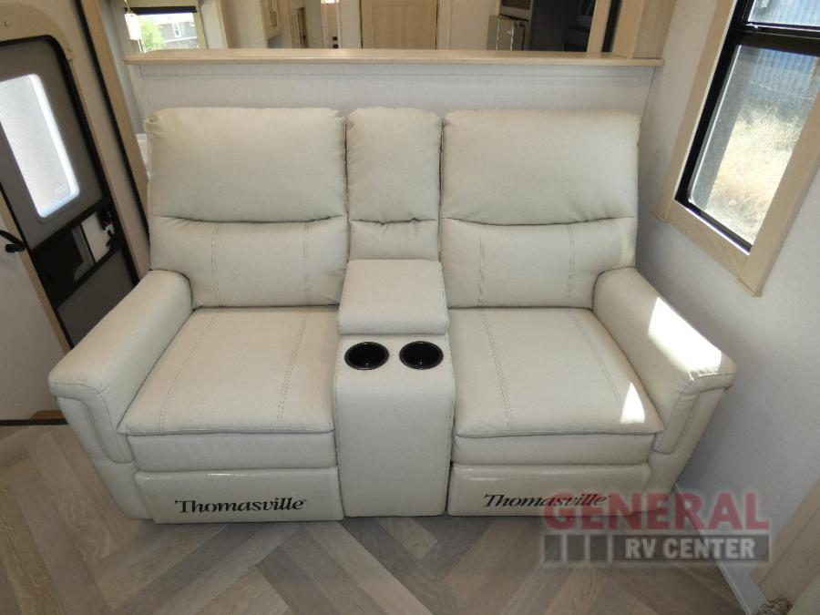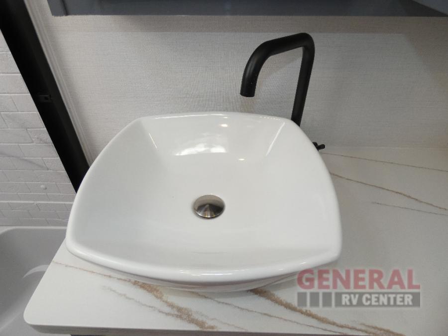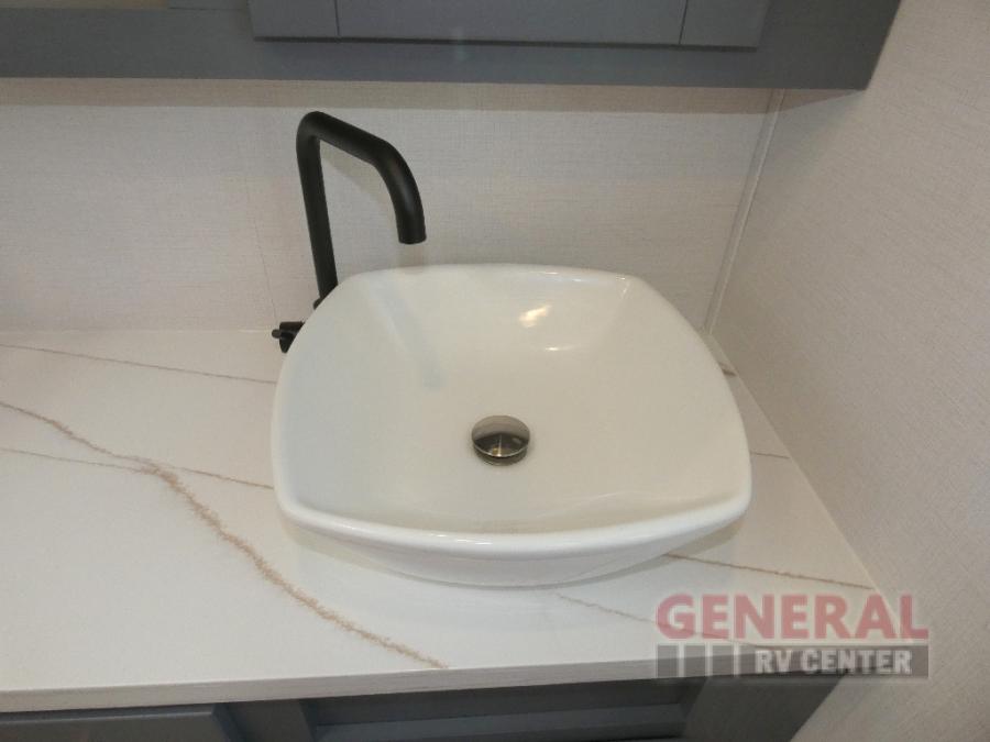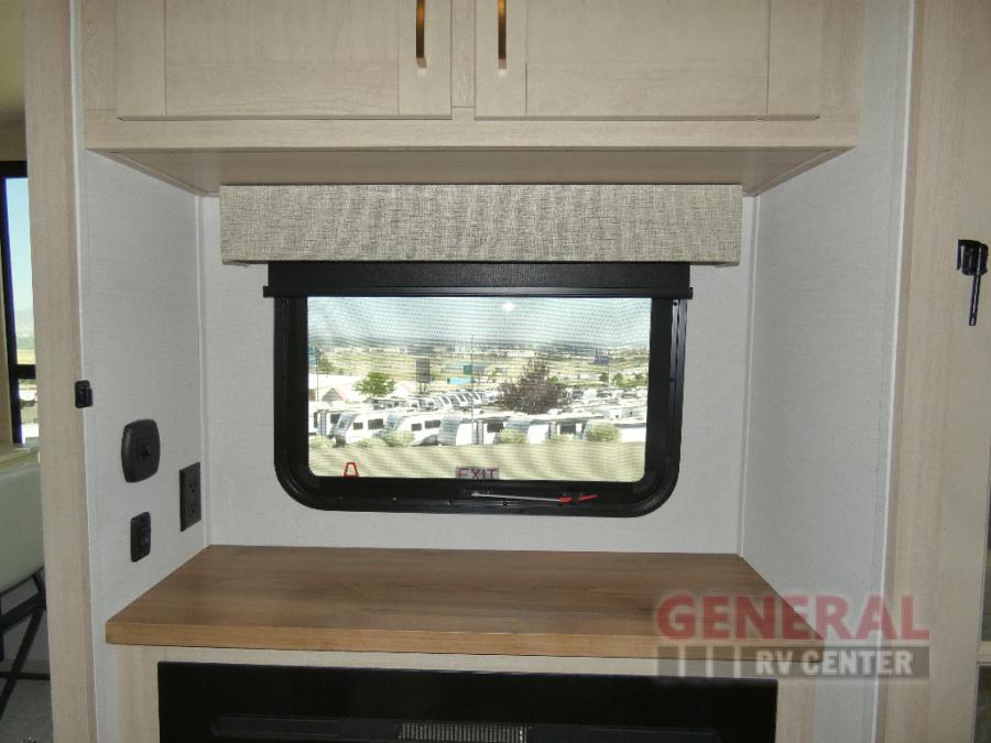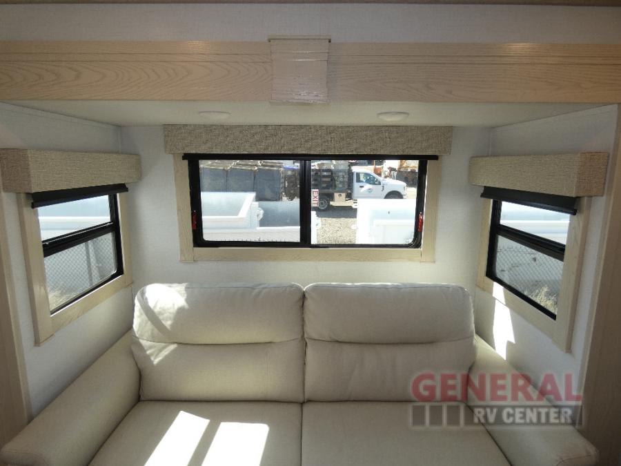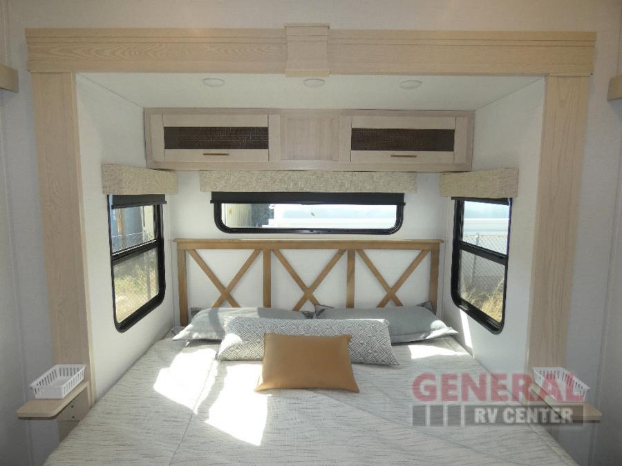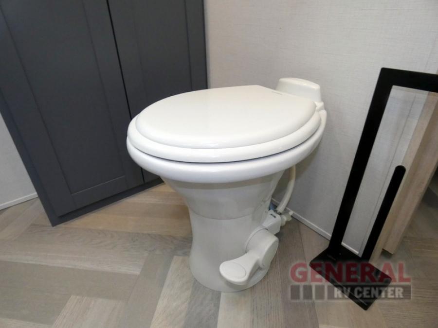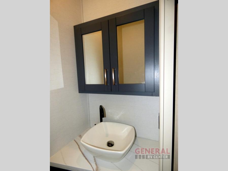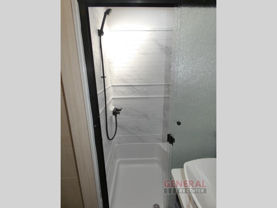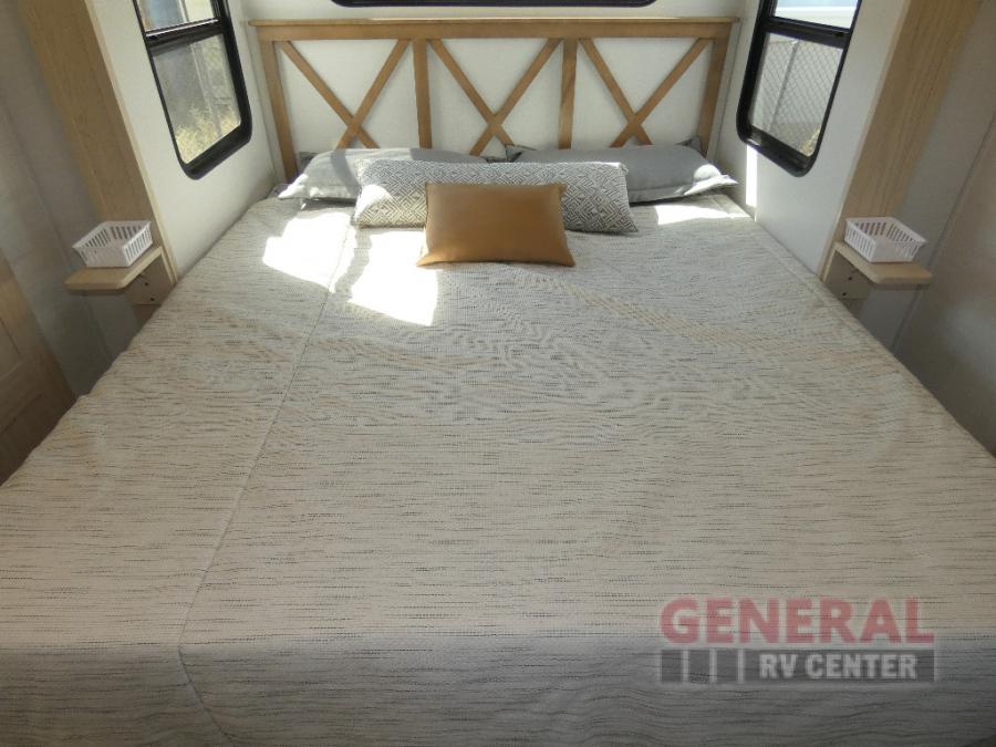 It's a clean decision with a bath and a half to take this fifth wheel on your next adventure! The front living area includes opposing EZ glide couches, 65" theater seating, and a front entertainment with a Smart LED pop up TV and fireplace for a cozy evening indoors. Prepare meals on the four burner cooktop, and leftovers can go in the 16 cu. ft. French door 12V refrigerator. You and your spouse will love the master suite that includes a king bed slide, plenty of storage space, and an entrance into the full rear bathroom with a dual sink vanity. There is even a linen closet with washer and dryer prep if you want to add those appliances!