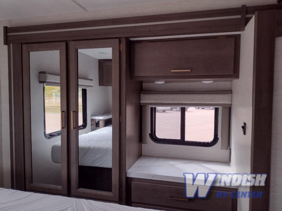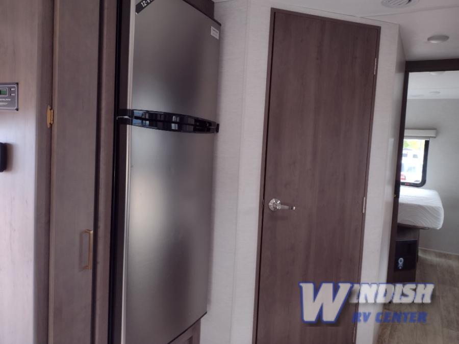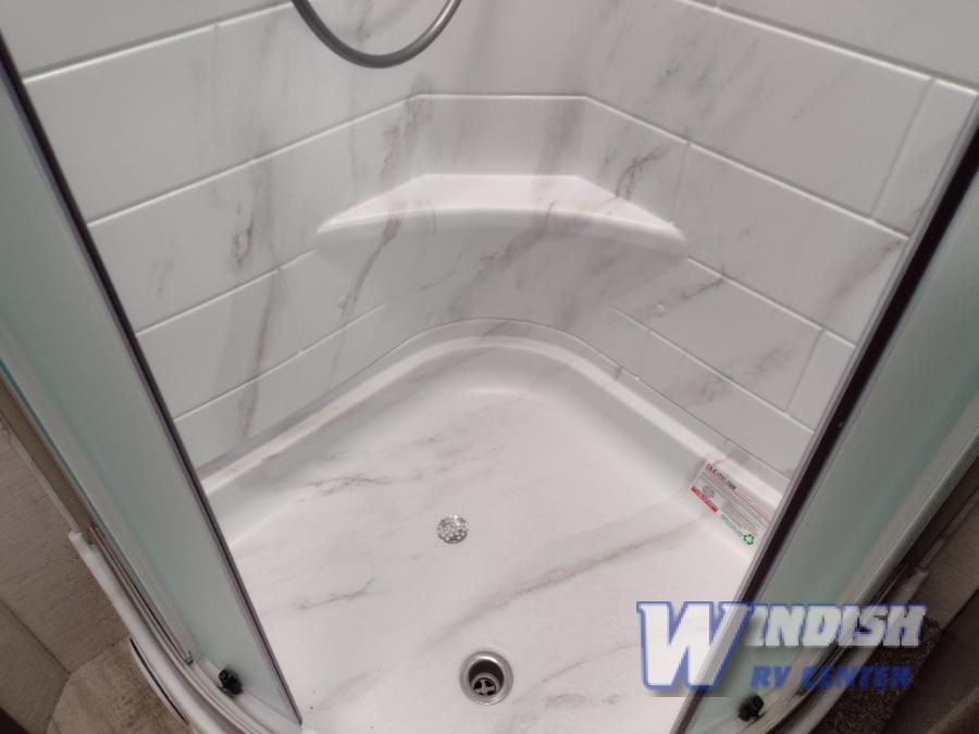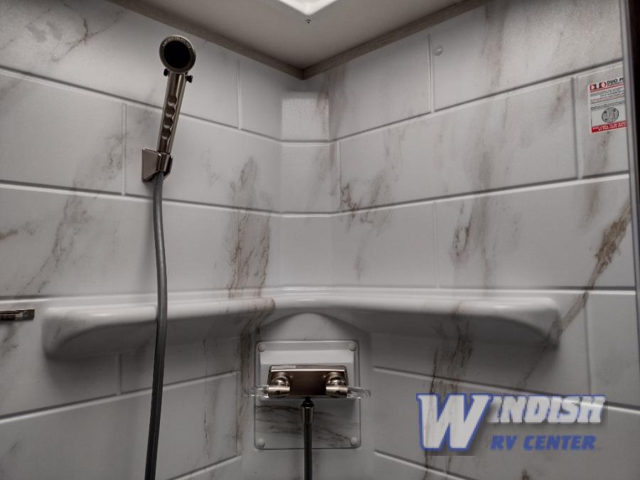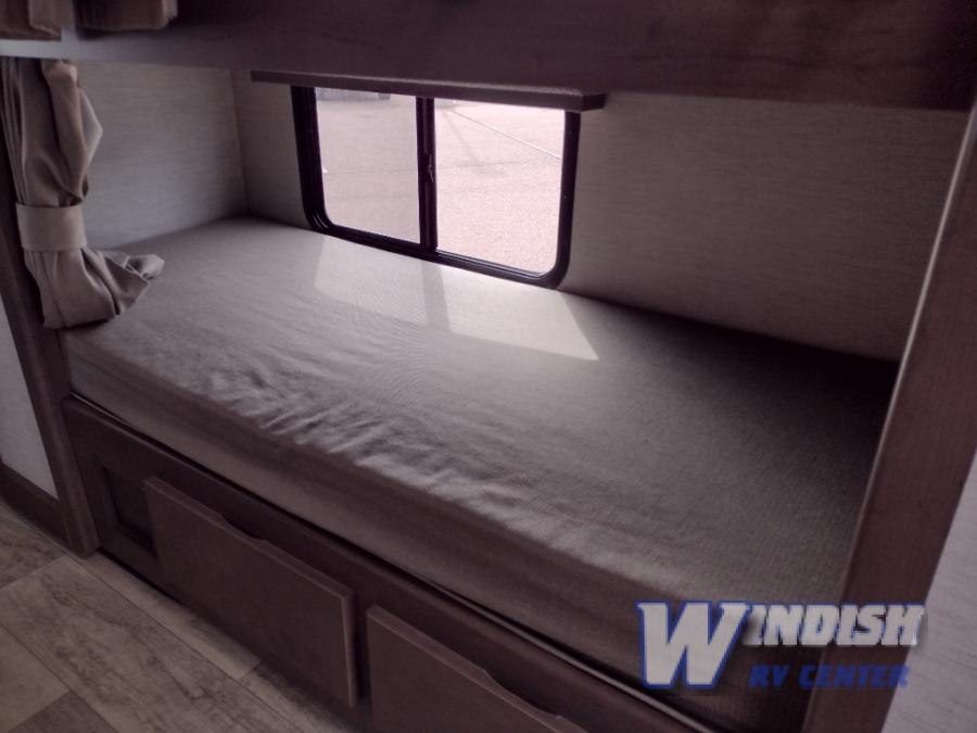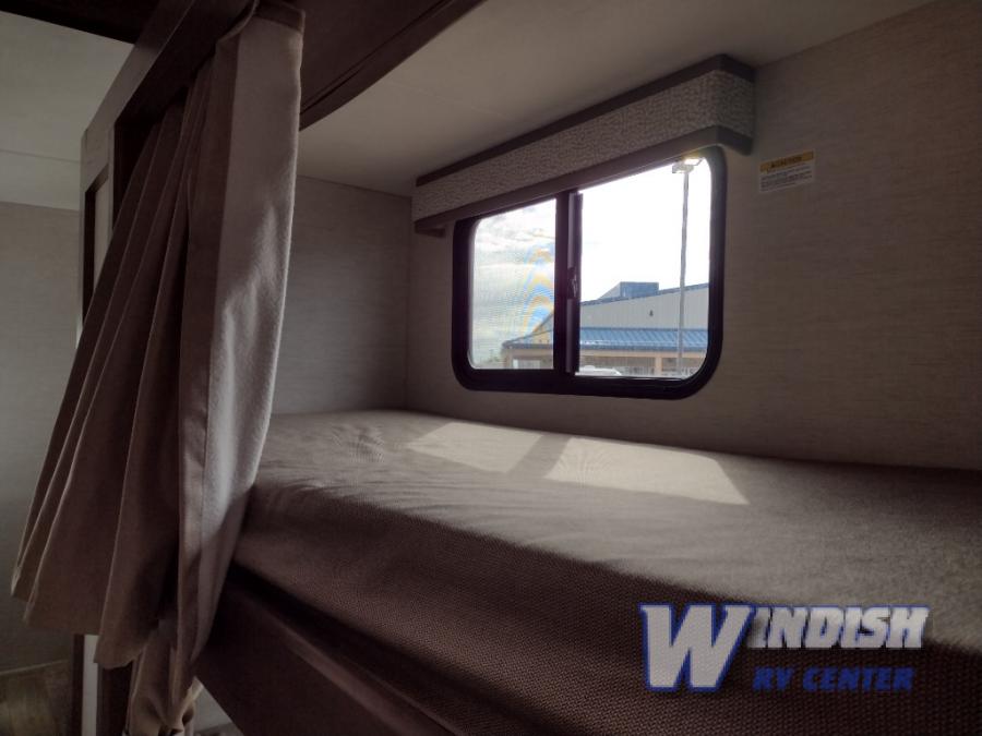 Bring the whole family with you in this motorhome! The grandkids can sleep on the set of 27" x 72" bunk beds, and you can sleep on the 60" x 75" queen bed in the rear private bedroom which also has a closet and dresser for your clothes and TV prep for entertainment. Plus, you can access the dual entry bathroom directly from the bedroom or the hallway next to the bunk beds. Relax in true comfort on the 68" jackknife sofa while you watch a movie on the 40" TV or play a few card games at the 71" Dream Dinette. There is also a 52" x 96" bunk over cab for even more sleeping space!